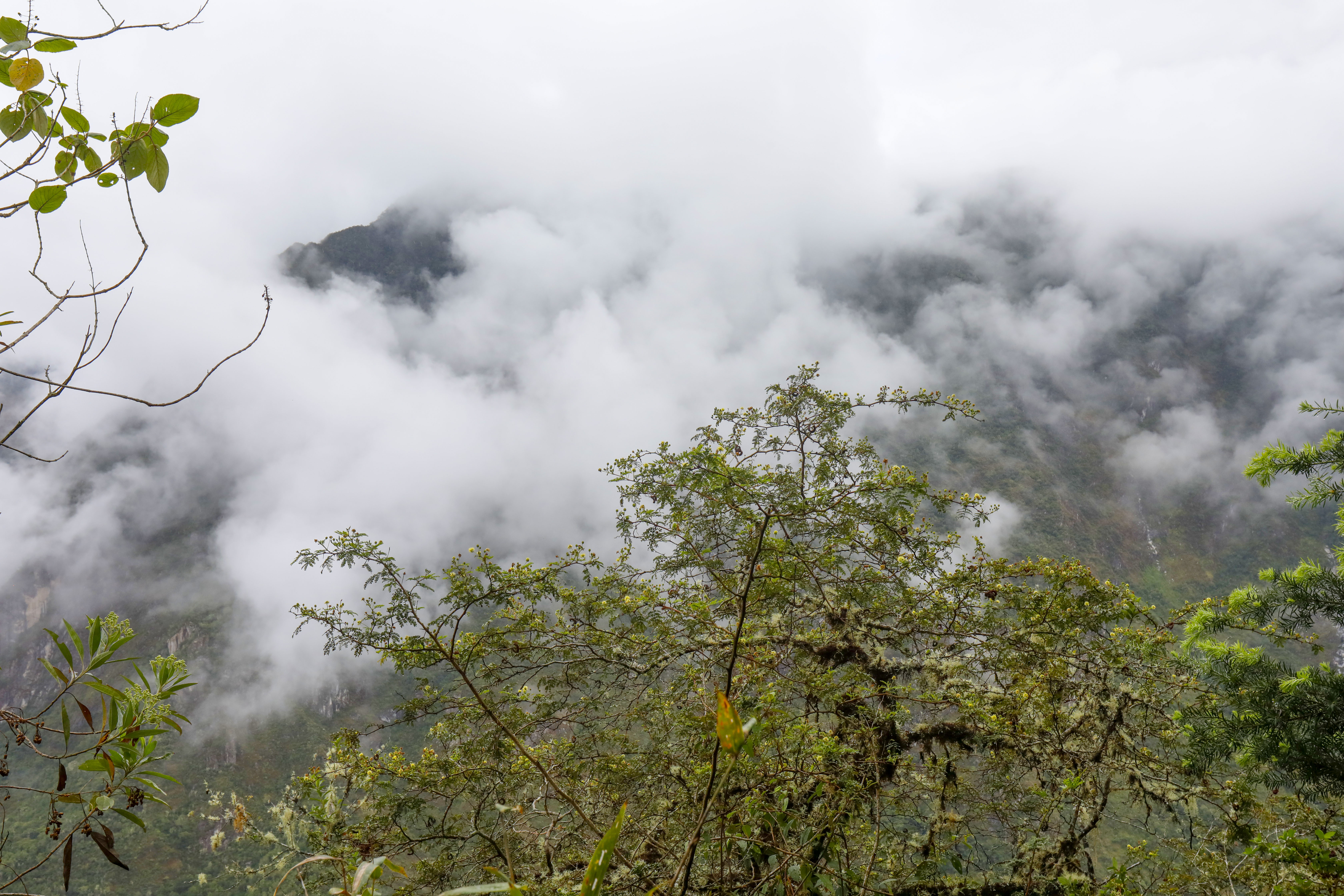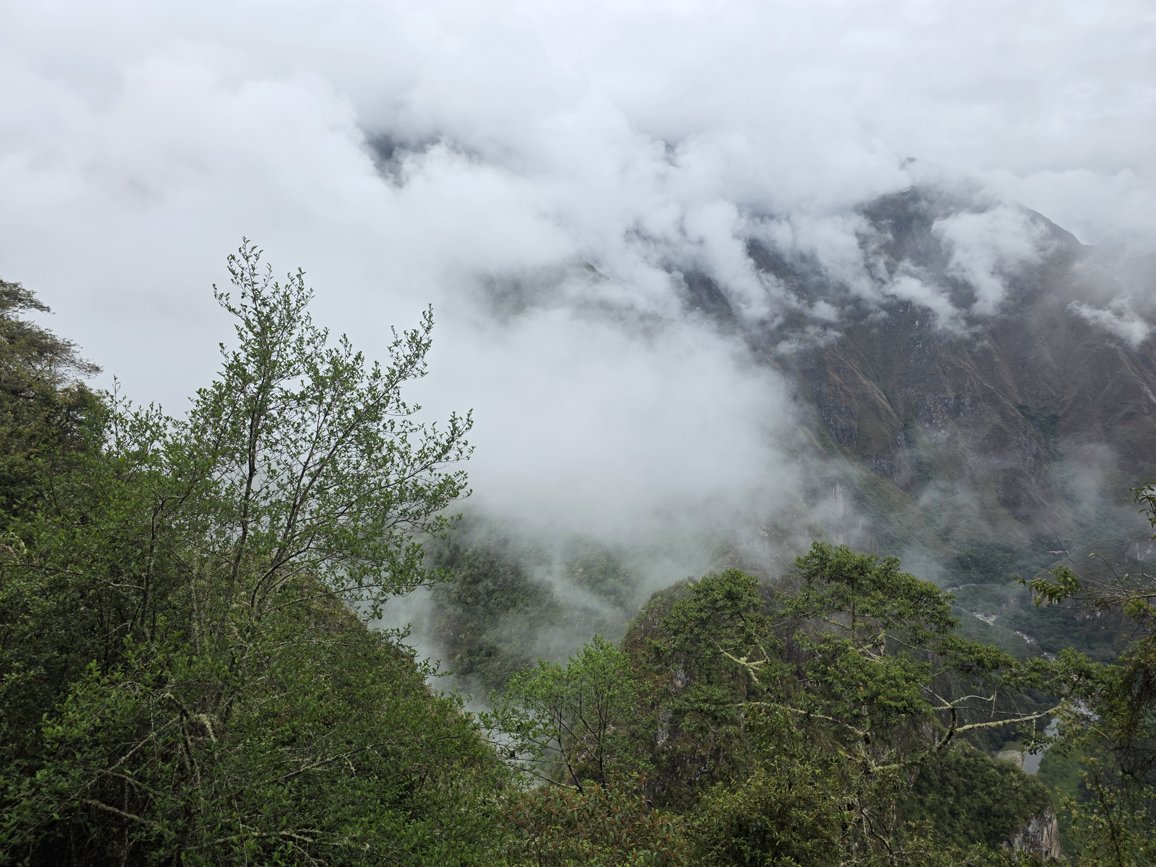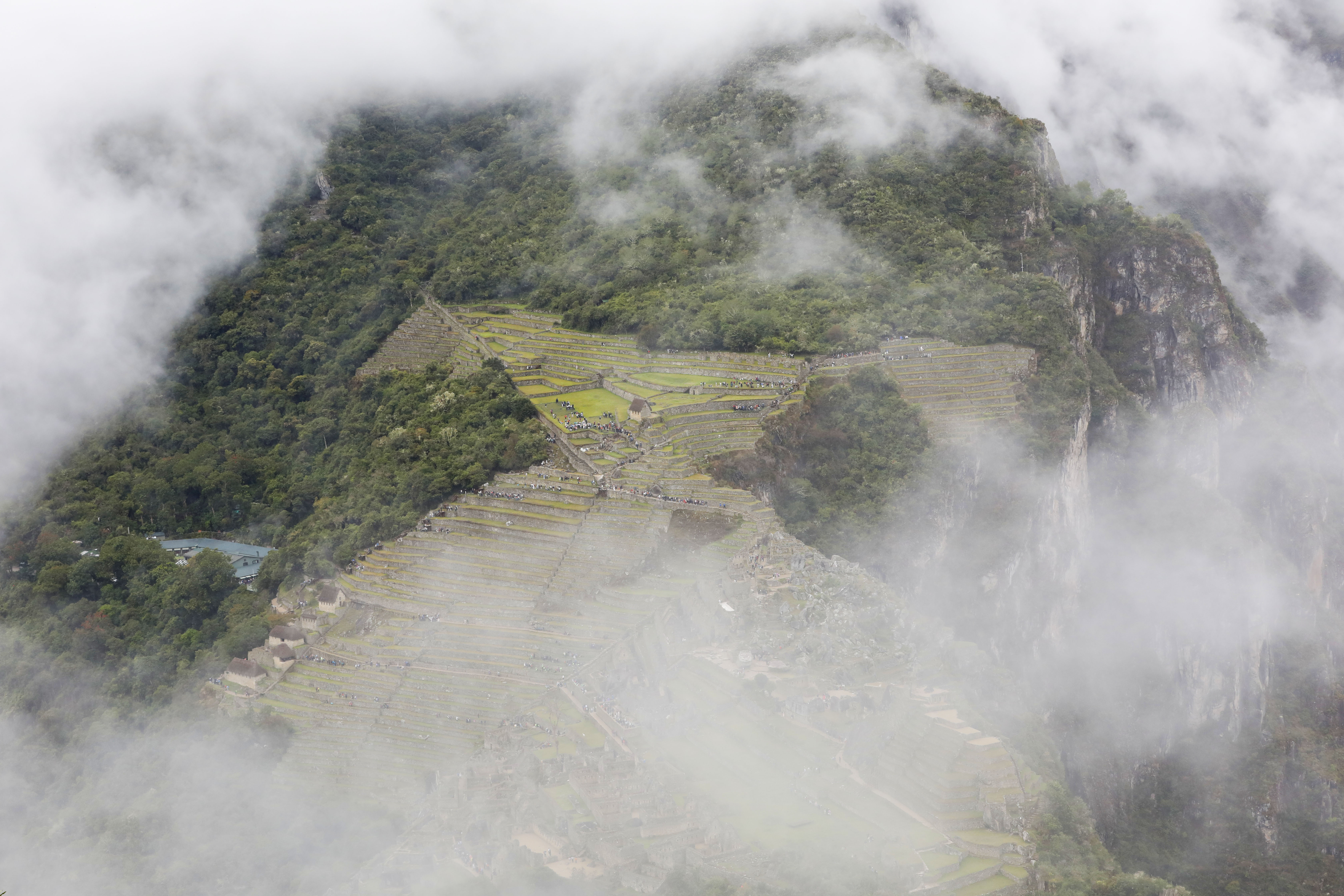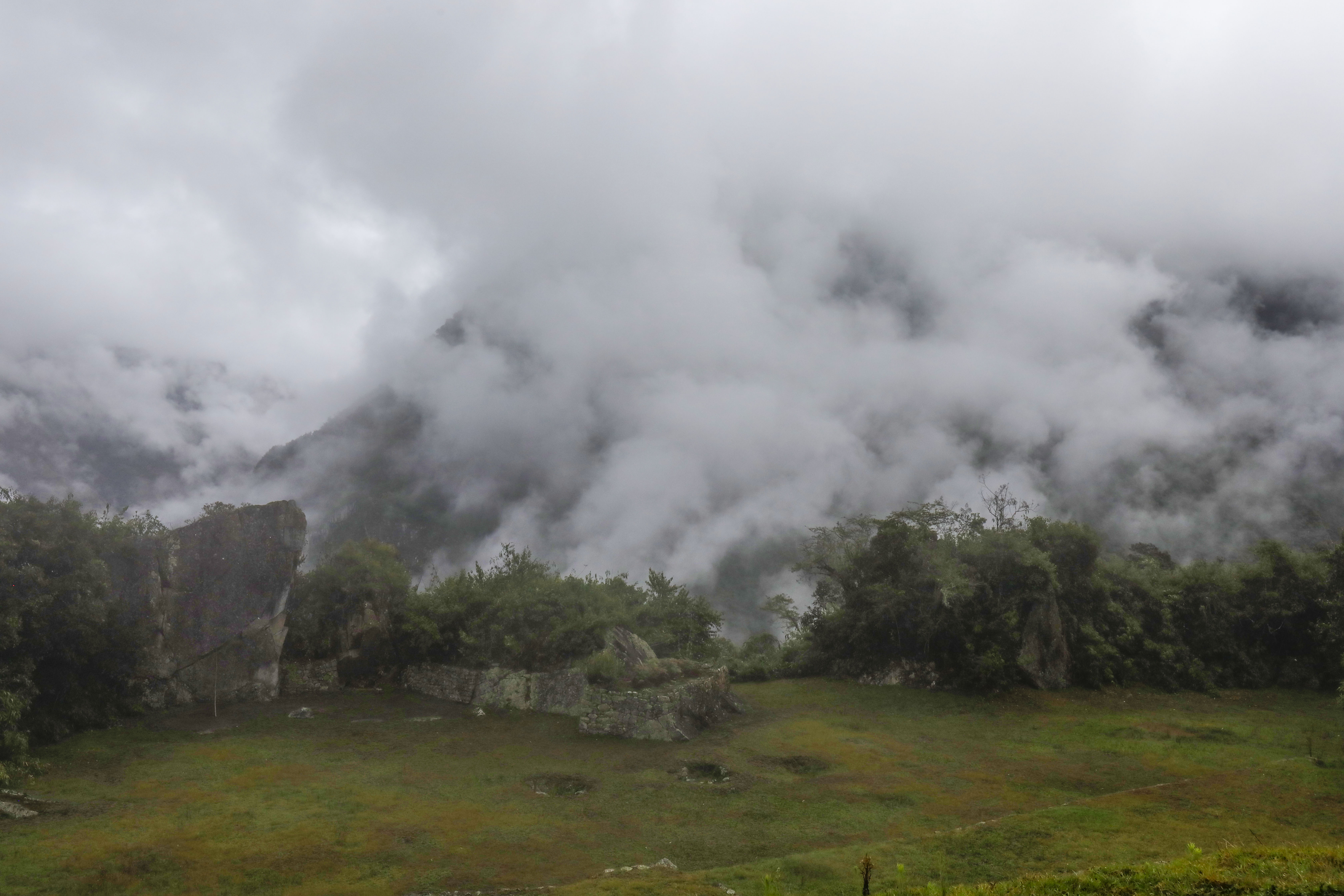 전망대 테라스: 안개가 들고날 때마다 마추픽추의 실루엣이 켜졌다 꺼졌다. “안개가 춤춘다”는 표현이 정확했다.