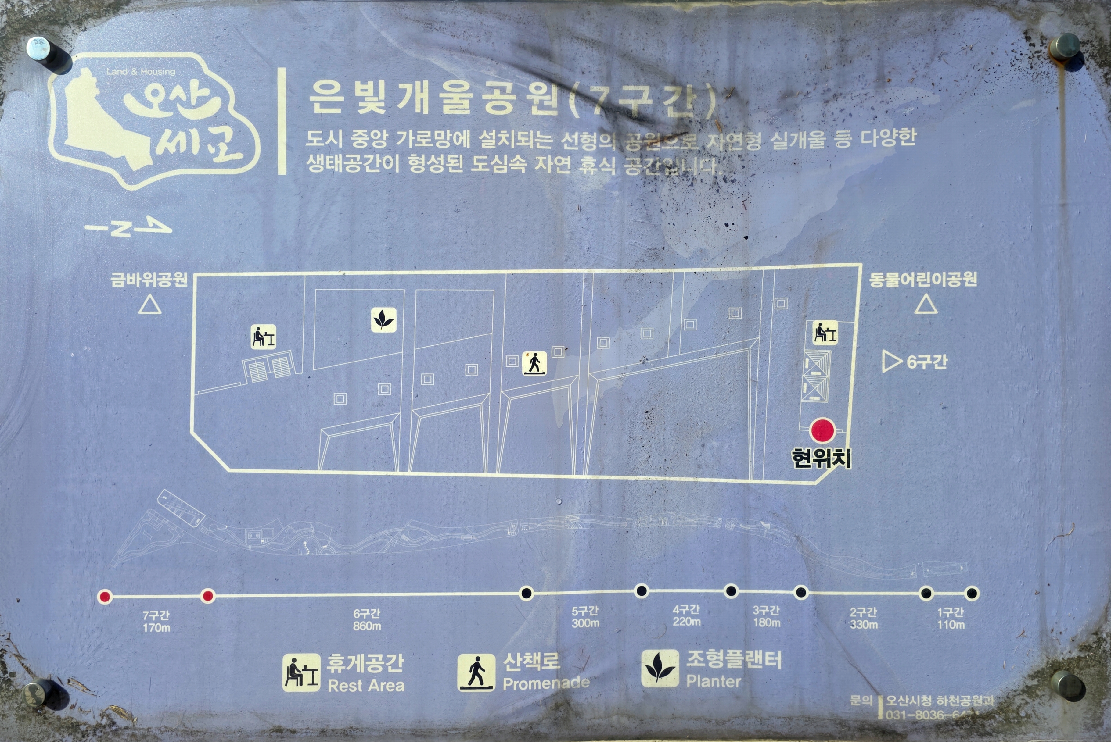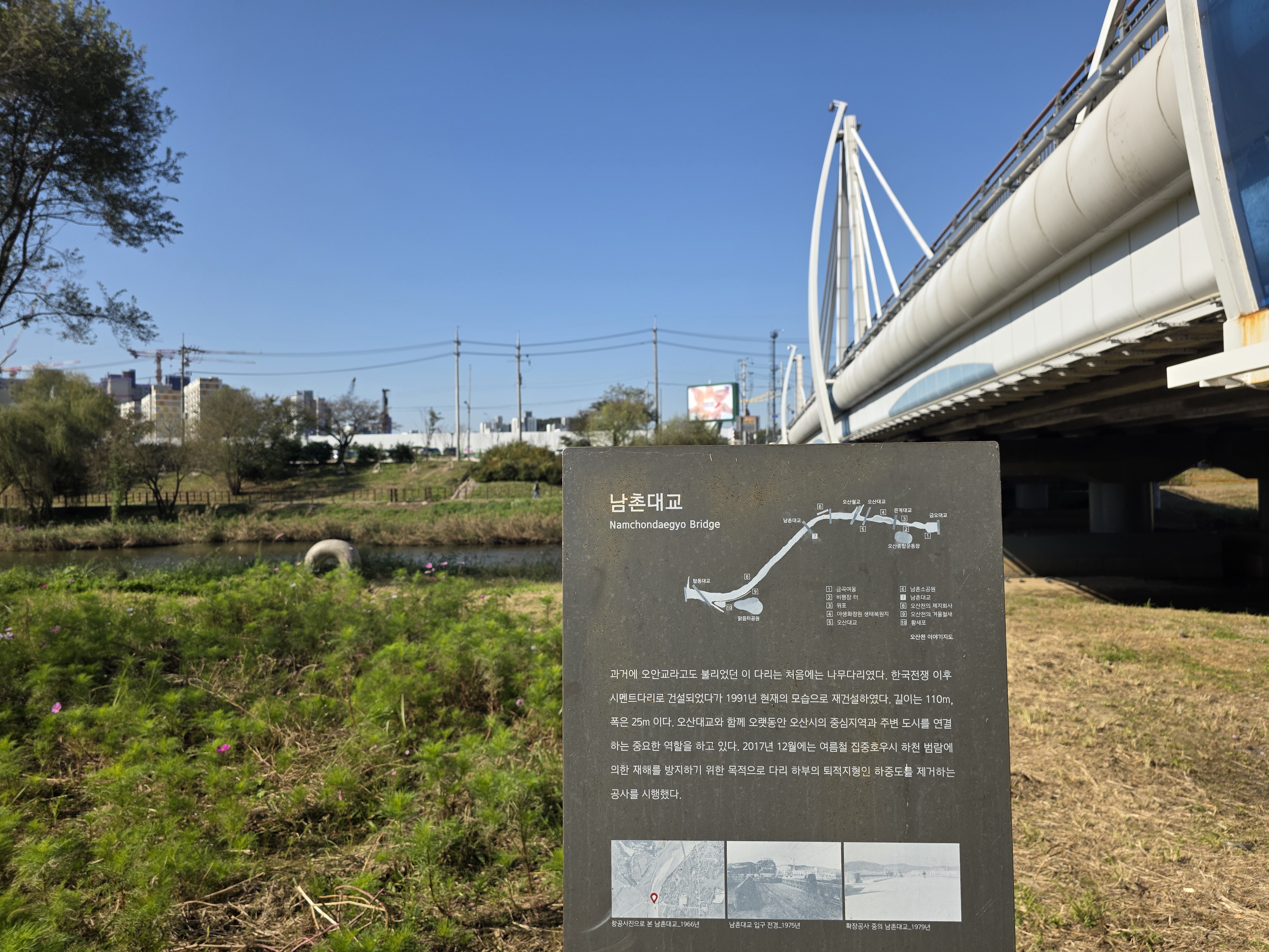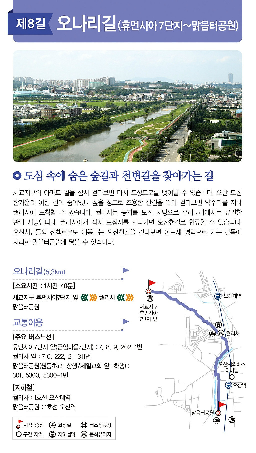 걸리사에서 나와 도심지를 가로지르는 구간을 지나면, 곧 오산천길이 펼쳐진다. 이곳은 오산 시민들이 자주 찾는 산책 코스이자, 도보 여행자에게도 매우 인기 있는 구간이다. 강변길을 따라 걷는 동안 흐르는 물소리와 나무들의 그늘이 반갑다.