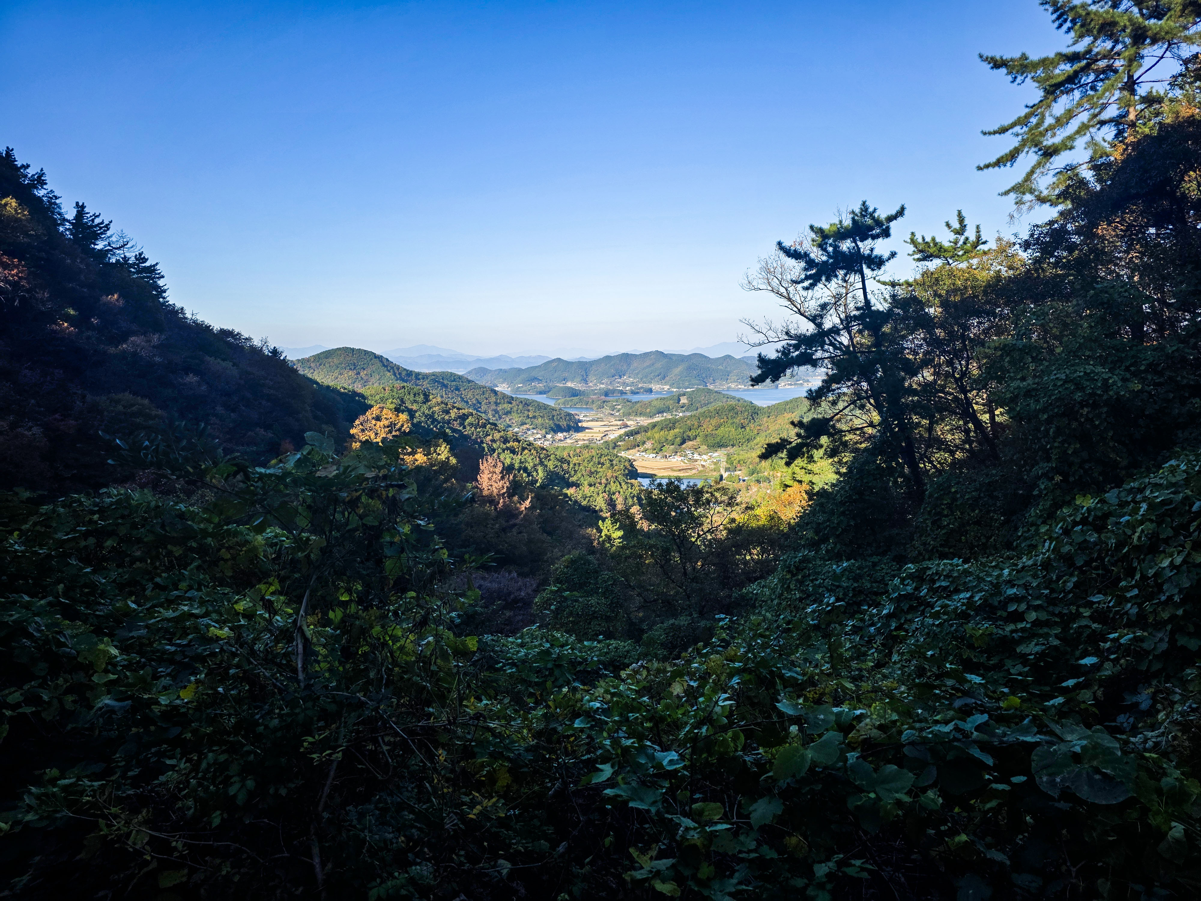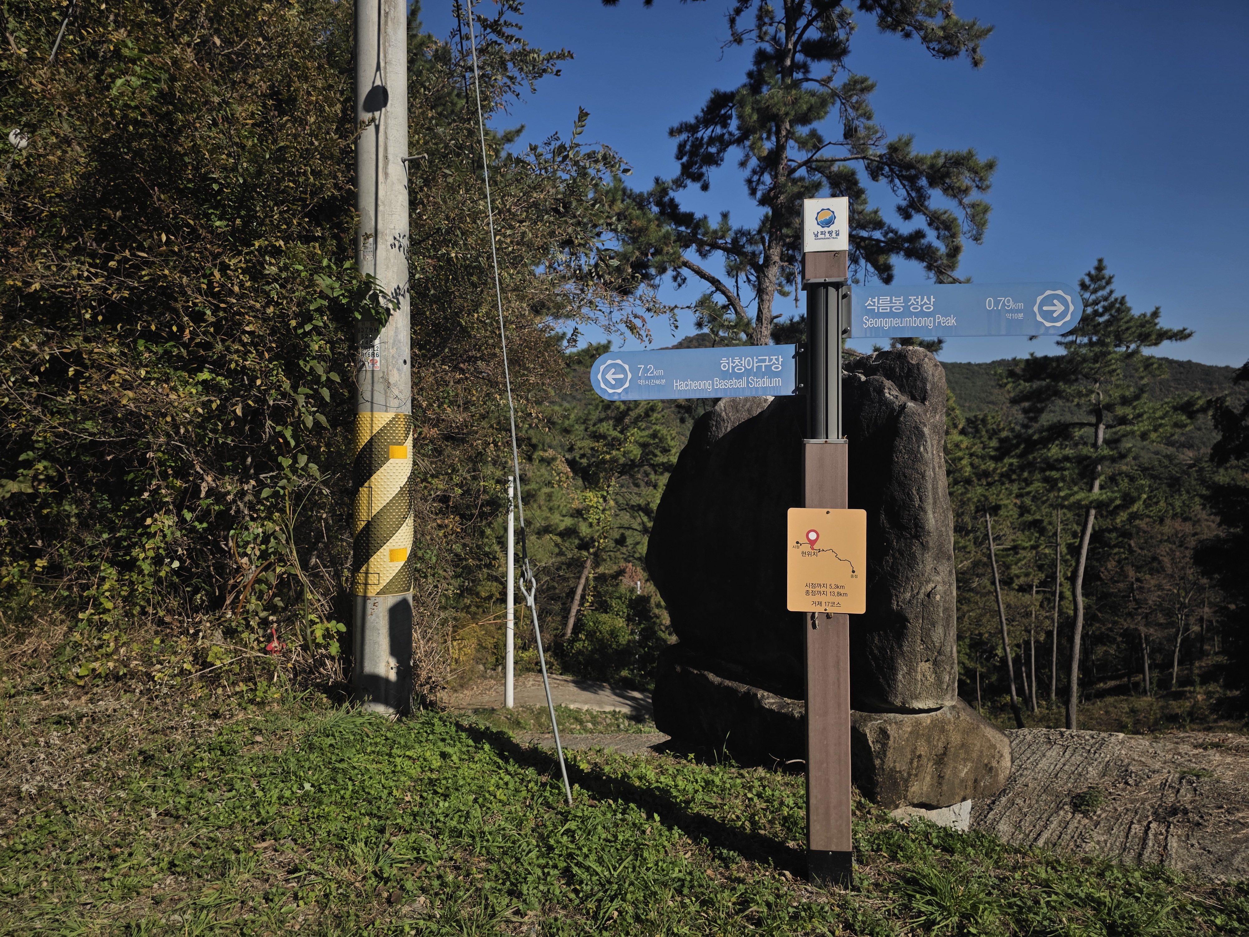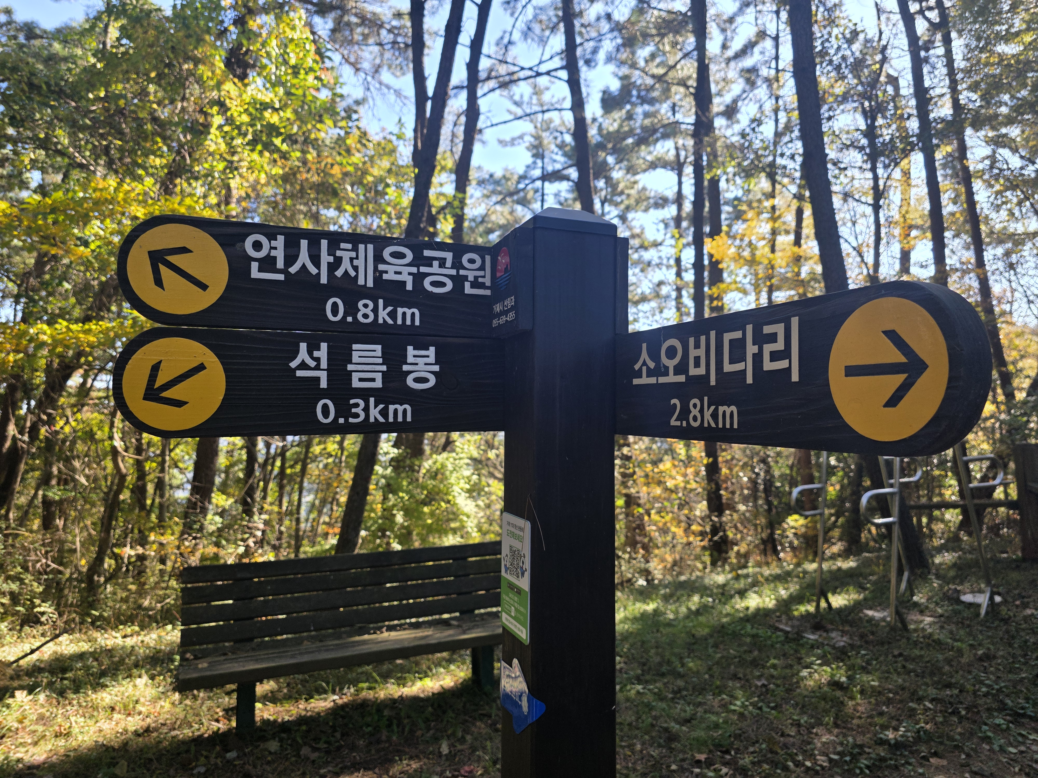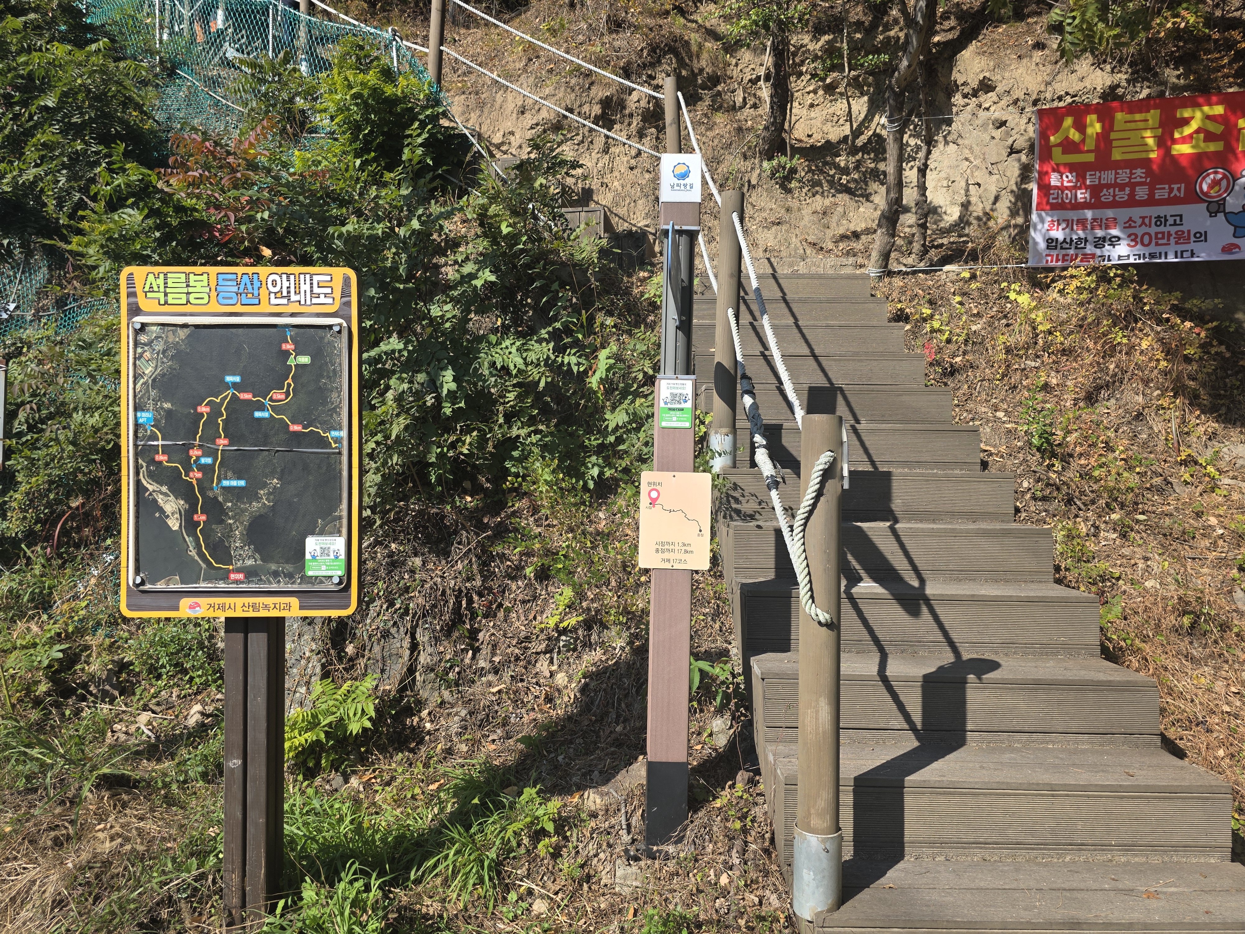 초반은 신오교를 건너 소오미마을까지 해안길을 따라 걷습니다. 이후 석름봉 안내판을 따라 산길로 진입하면 경사가 급한 오르막길이 반깁니다. 초입만 지나면 고요한 능선길이 펼쳐지고, 소나무 숲 사이 단풍 물결이 걷는 즐거움을 배가시켜줍니다.