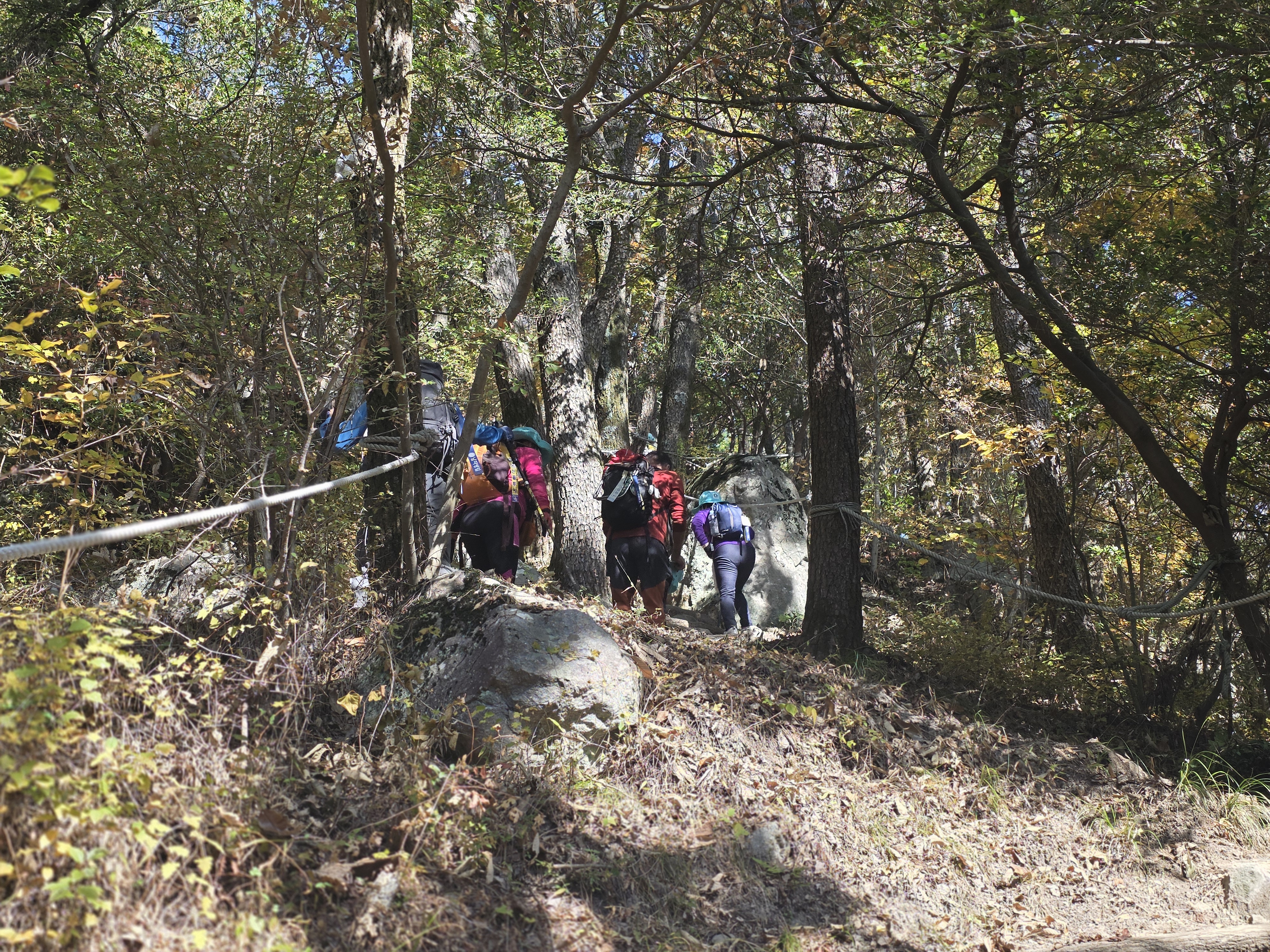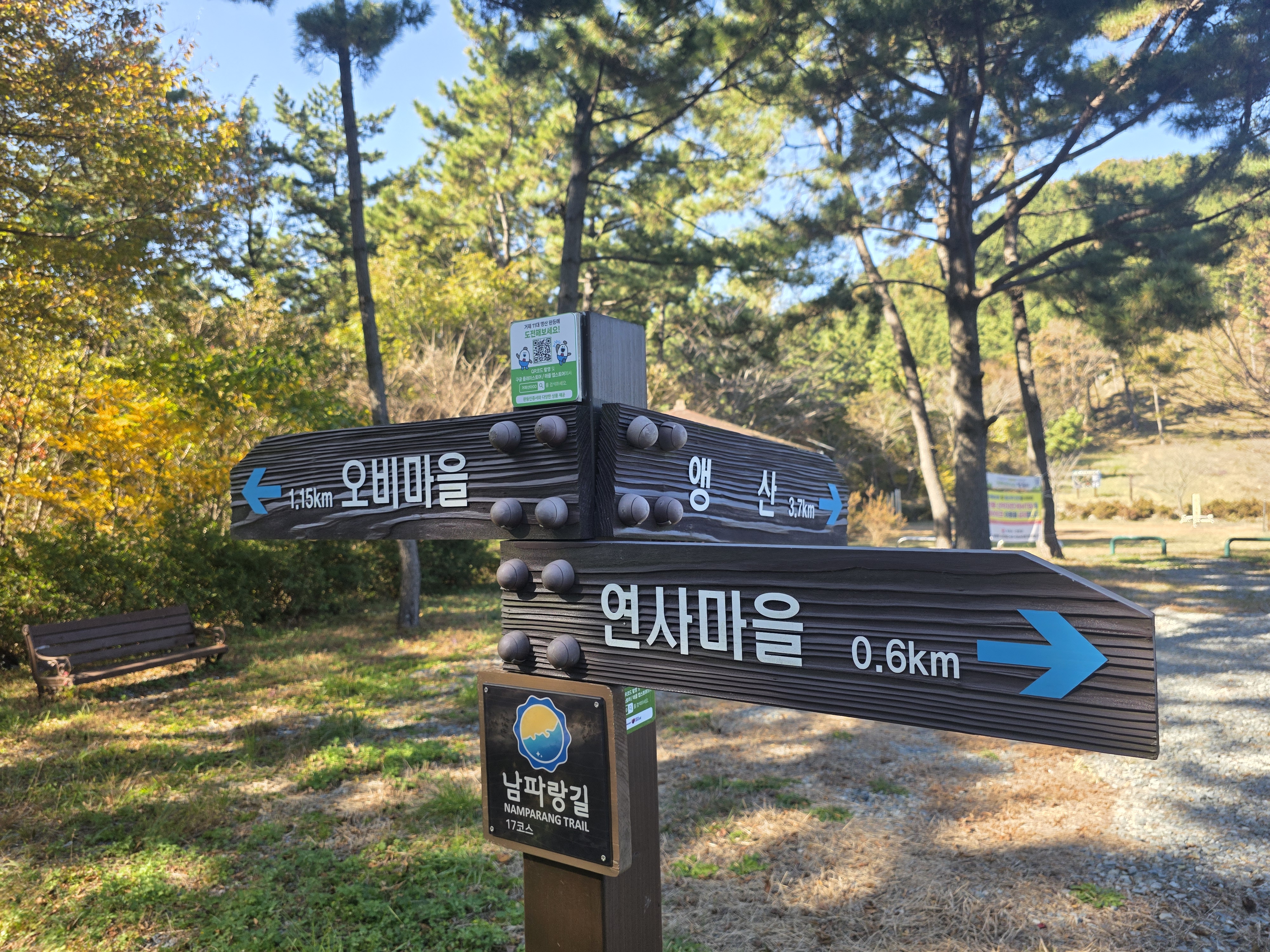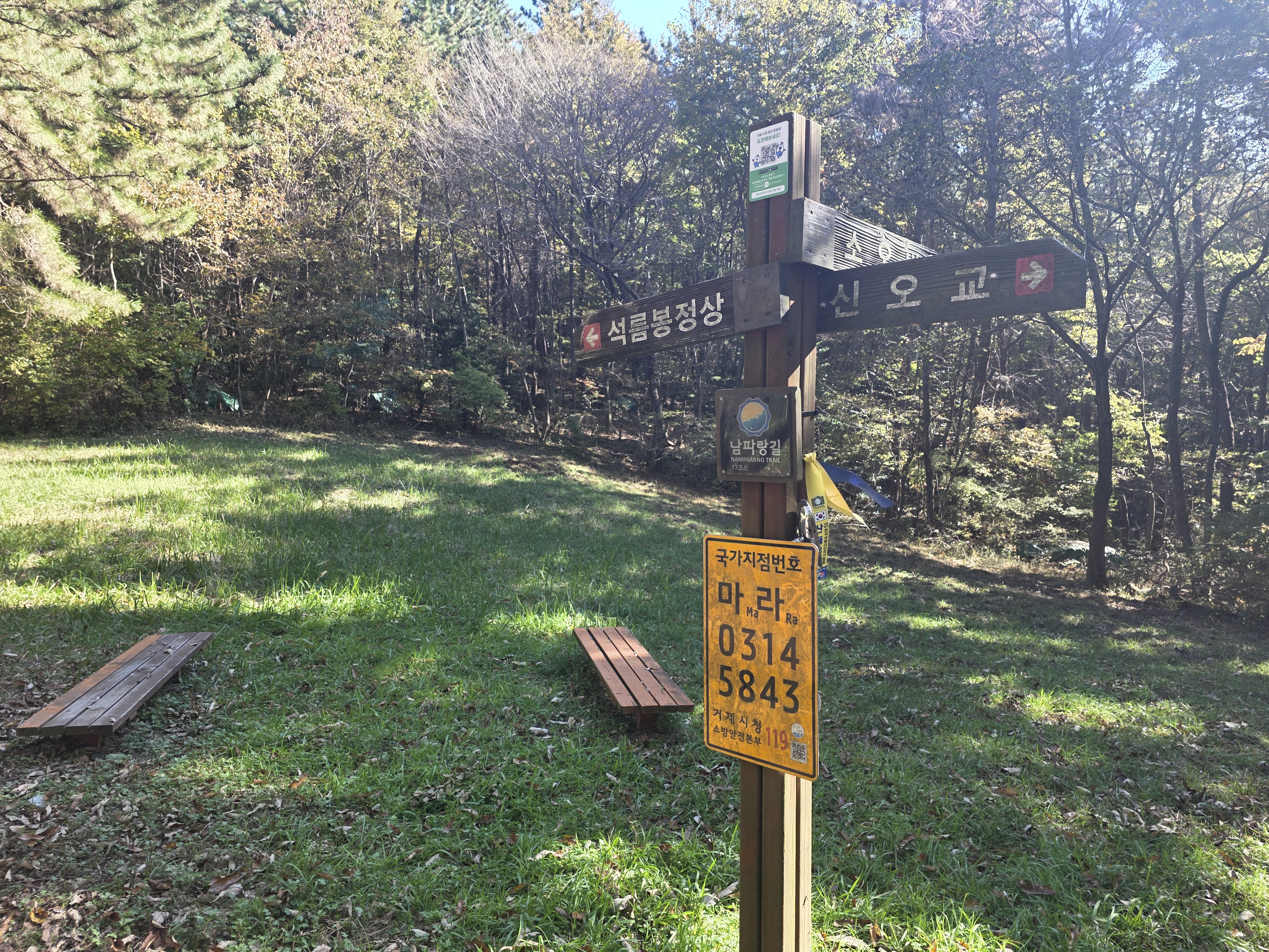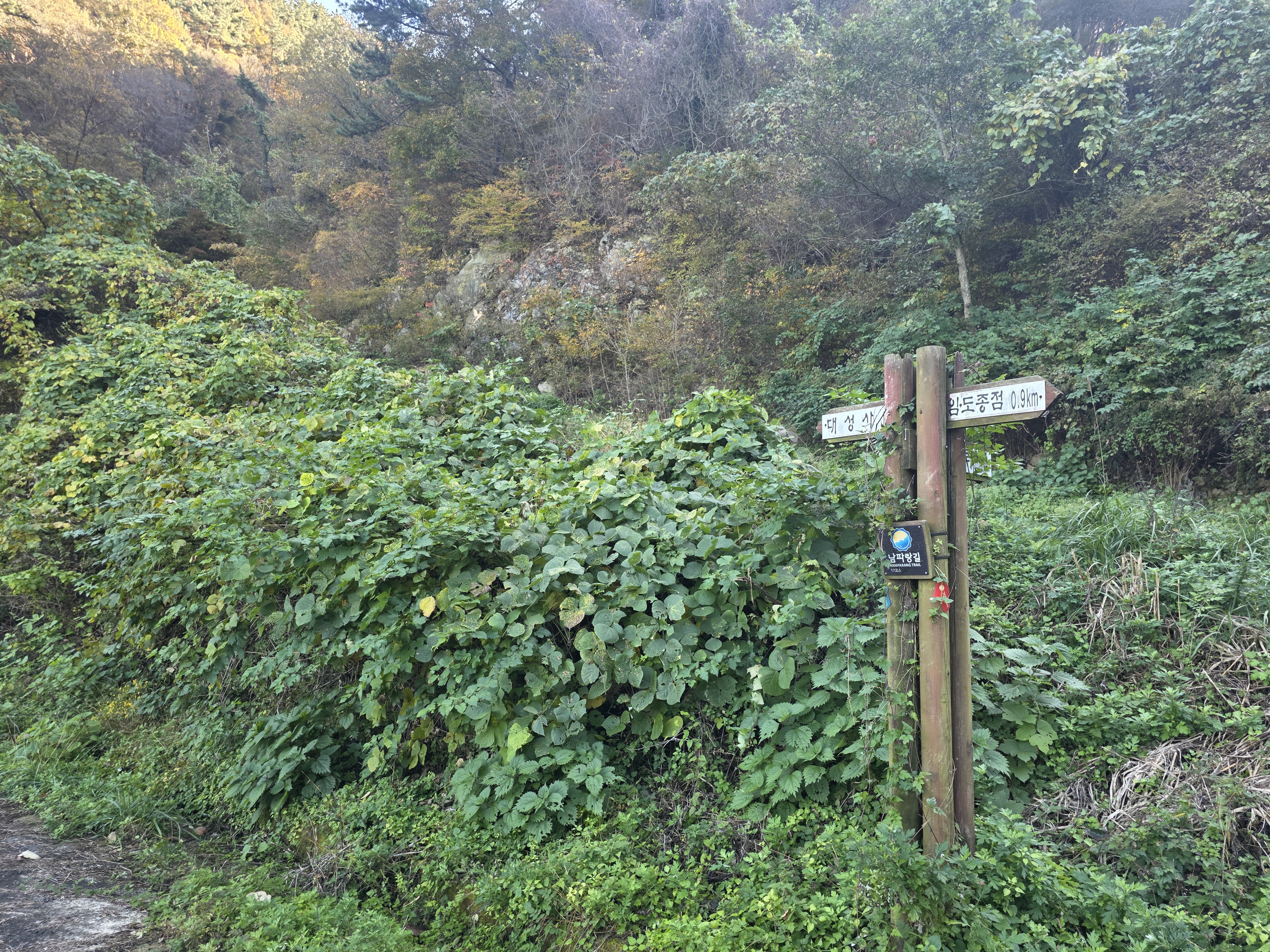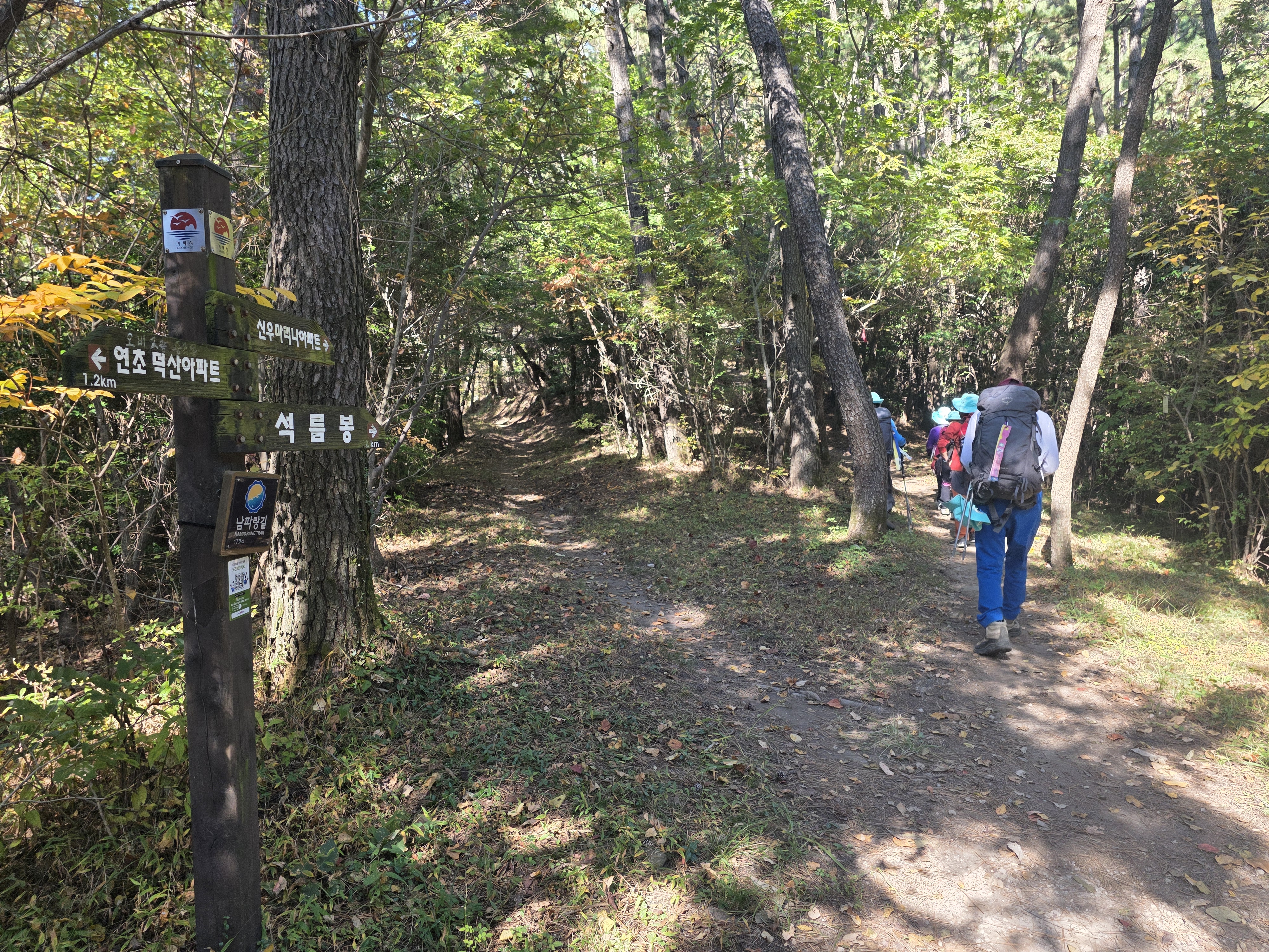 오늘의 여정은 남파랑길 17코스로, 석름봉을 지나 장목파출소까지 이어지는 19km의 긴 코스. 산길 위주의 경로이지만 늦가을 숲길은 걷는 이들의 마음을 단단히 채워주는 아름다움으로 가득했습니다.