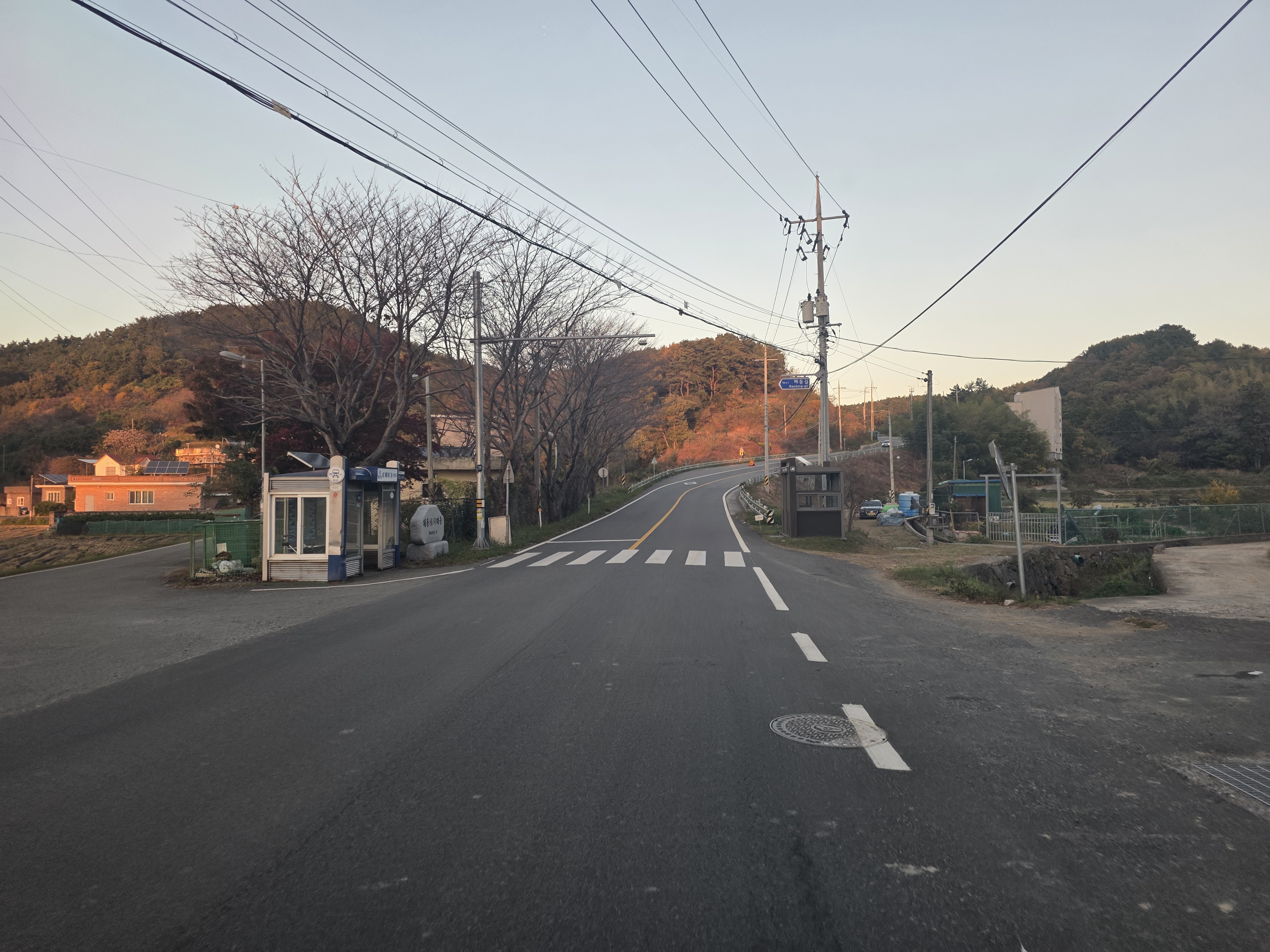임도를 따라 하청야구장 방향으로 향하면, 농촌 마을과 바다 풍경이 어우러진 거제 특유의 아름다운 풍광이 펼쳐집니다.