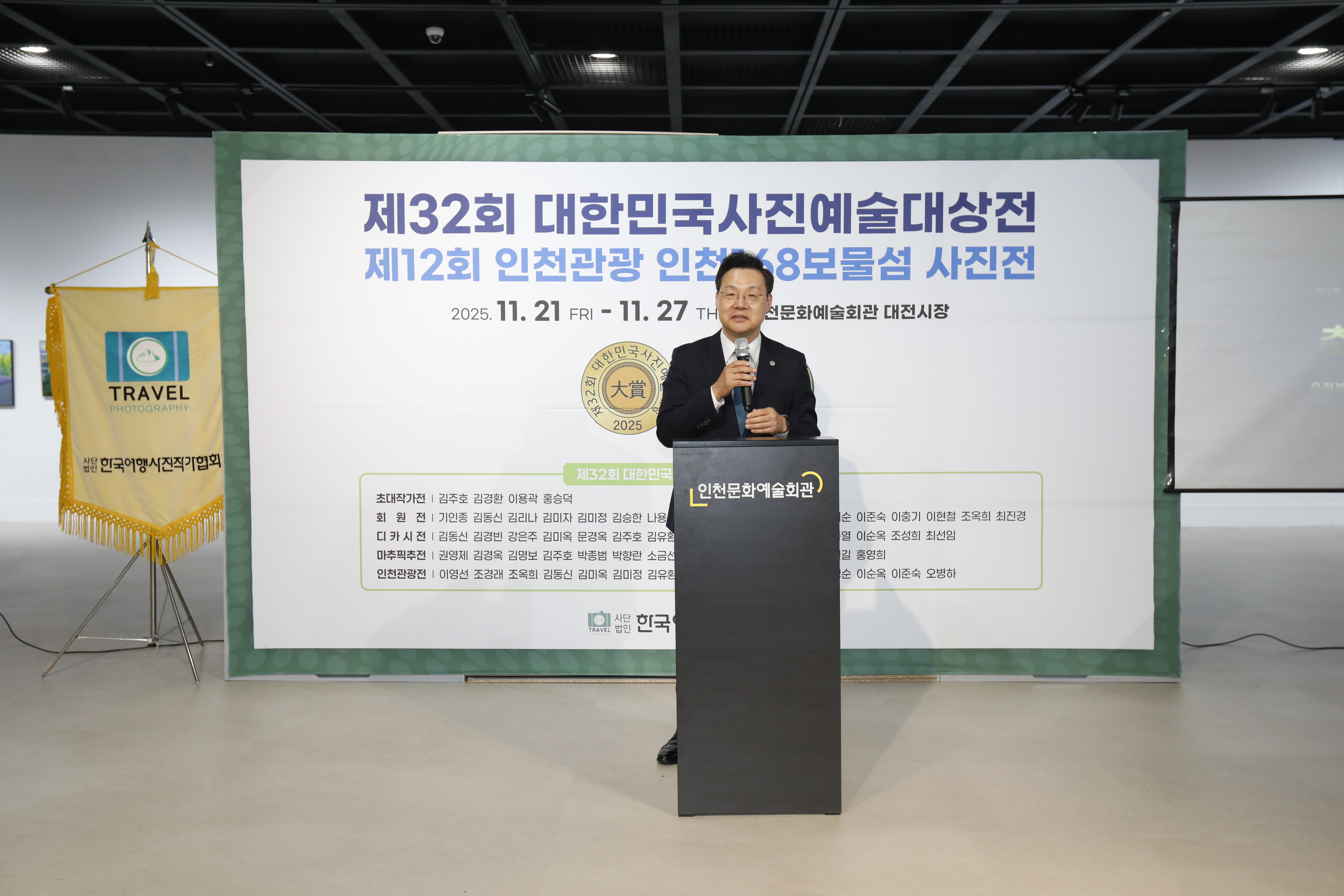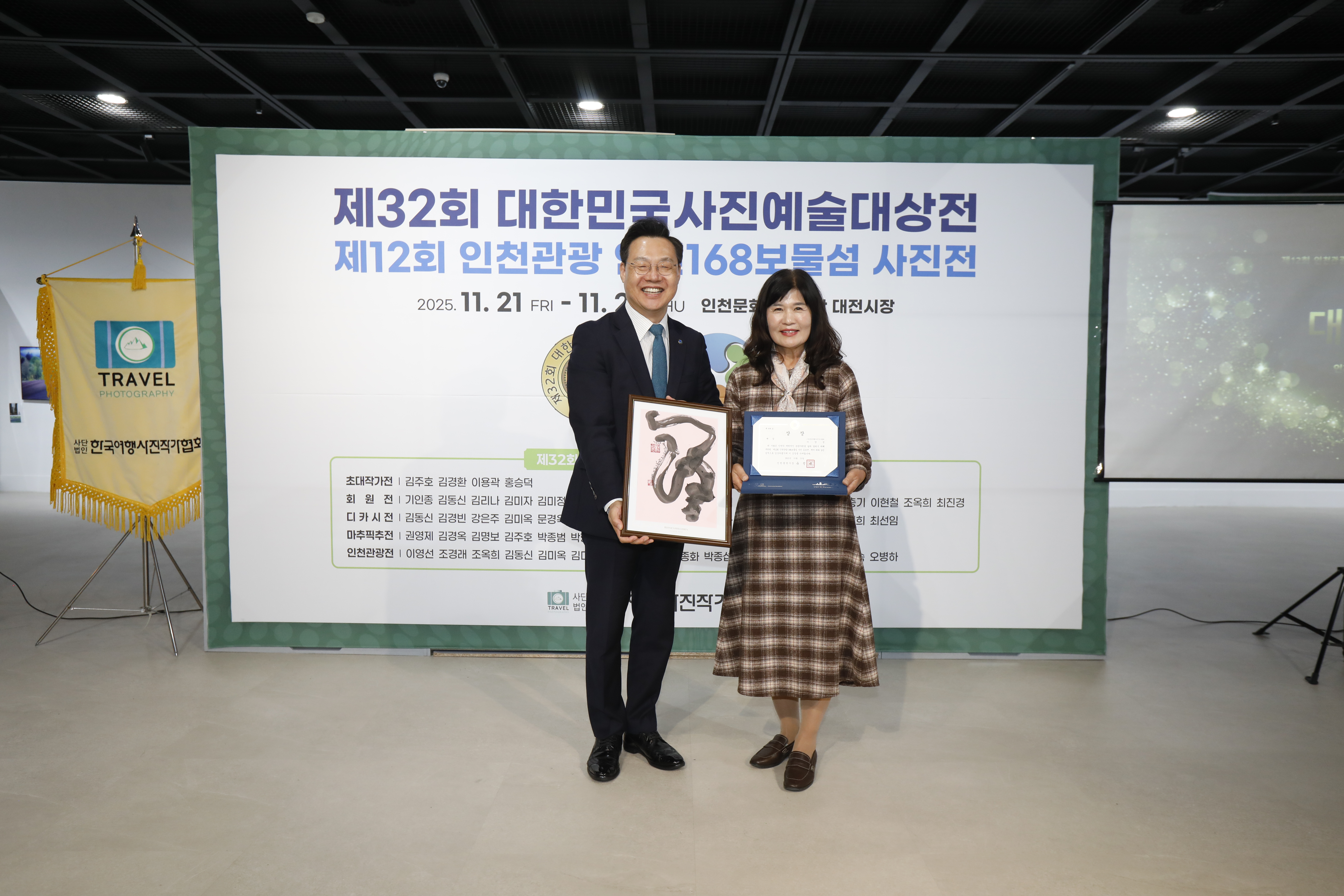 【한국아트뉴스 = 어랑】2025년 11월 21일, 인천문화예술회관 대전시실에서 제32회 대한민국여행사진예술대상전과 제12회 인천관광 인천168보물섬 사진전이 전국 사진작가 및 관람객 150여 명이 참석한 가운데 성대하게 개막했다.