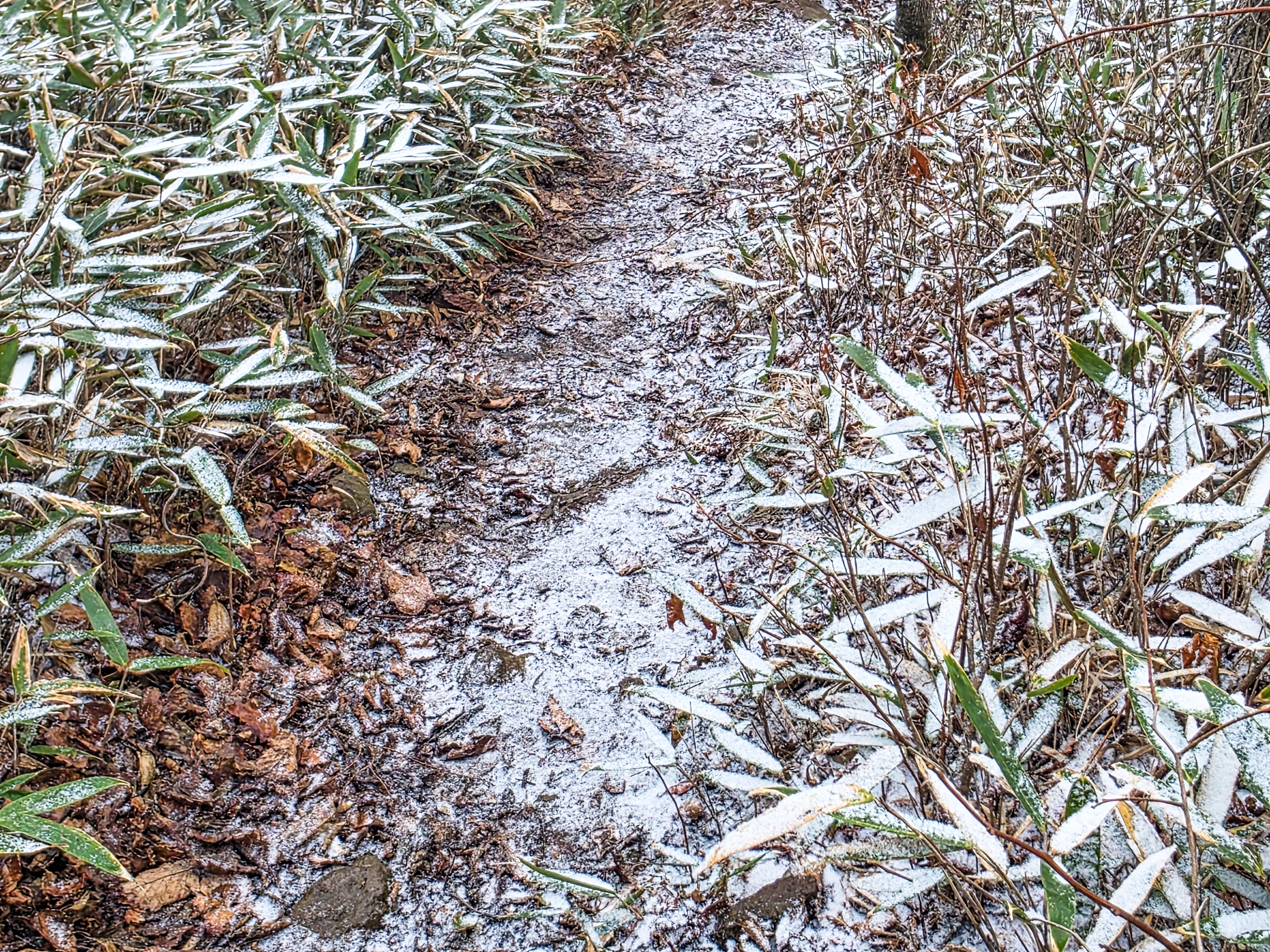 발아래에는 낙엽과 얇은 눈이 뒤섞여 있고, 숲 사이로 스며드는 겨울 햇살이 길을 밝힌다.