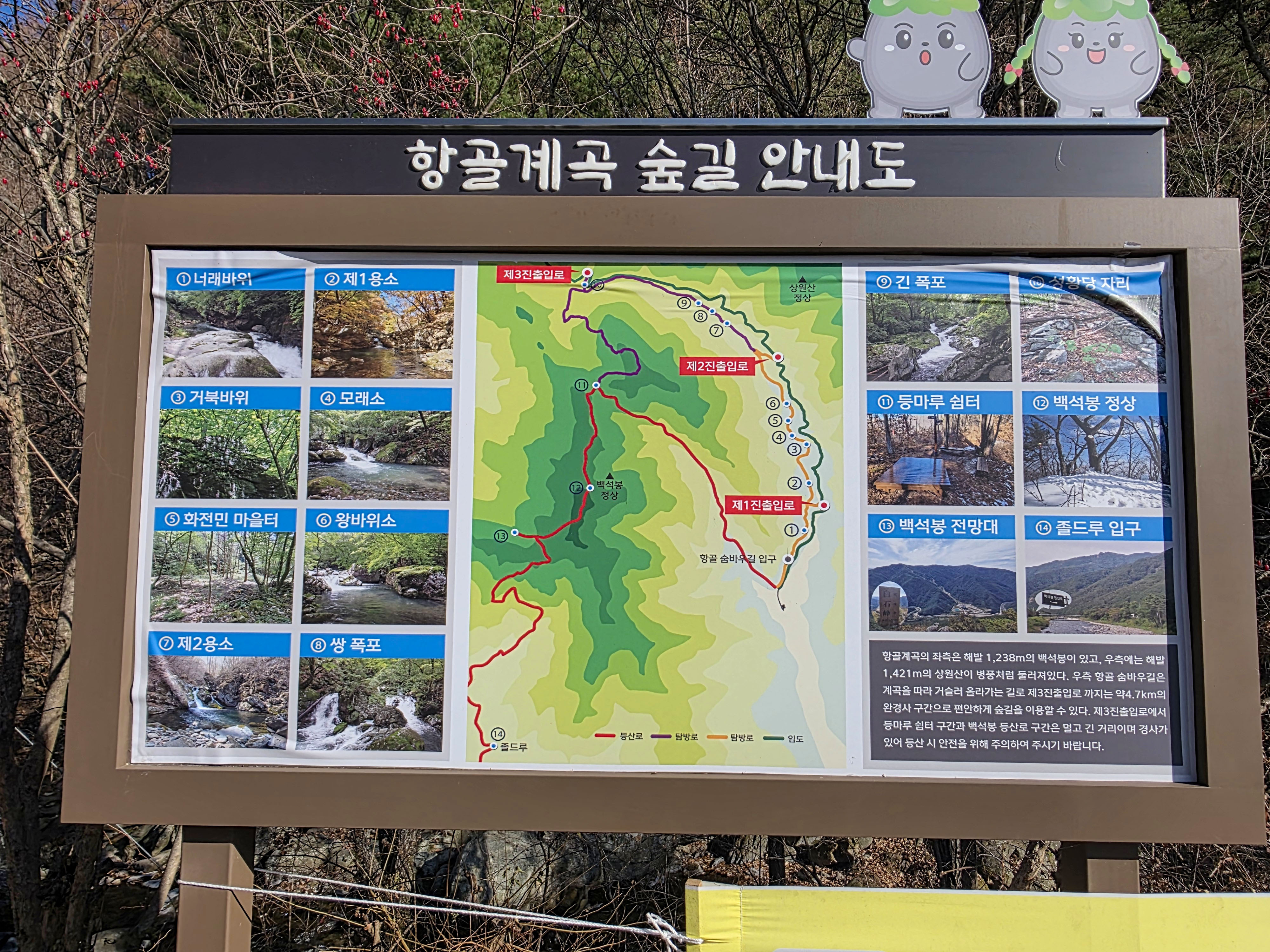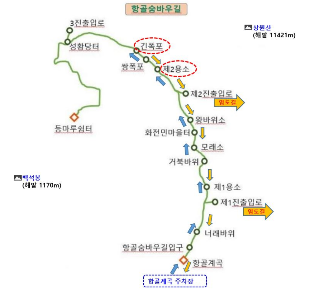 코스는 항골계곡 주차장 → 항골숨바우길 입구 → 너래바위 → 제1·2용소 → 왕바위소 → 쌍폭포·긴폭포 → 성황당터 → 상원산 방향 임도 하산으로 이어지는 ‘웰빙 트레킹 코스’다. 완만한 숲길과 시원한 계곡길이 자연스럽게 이어져 초보자부터 사진가까지 모두 만족시키는 것이 특징이다.