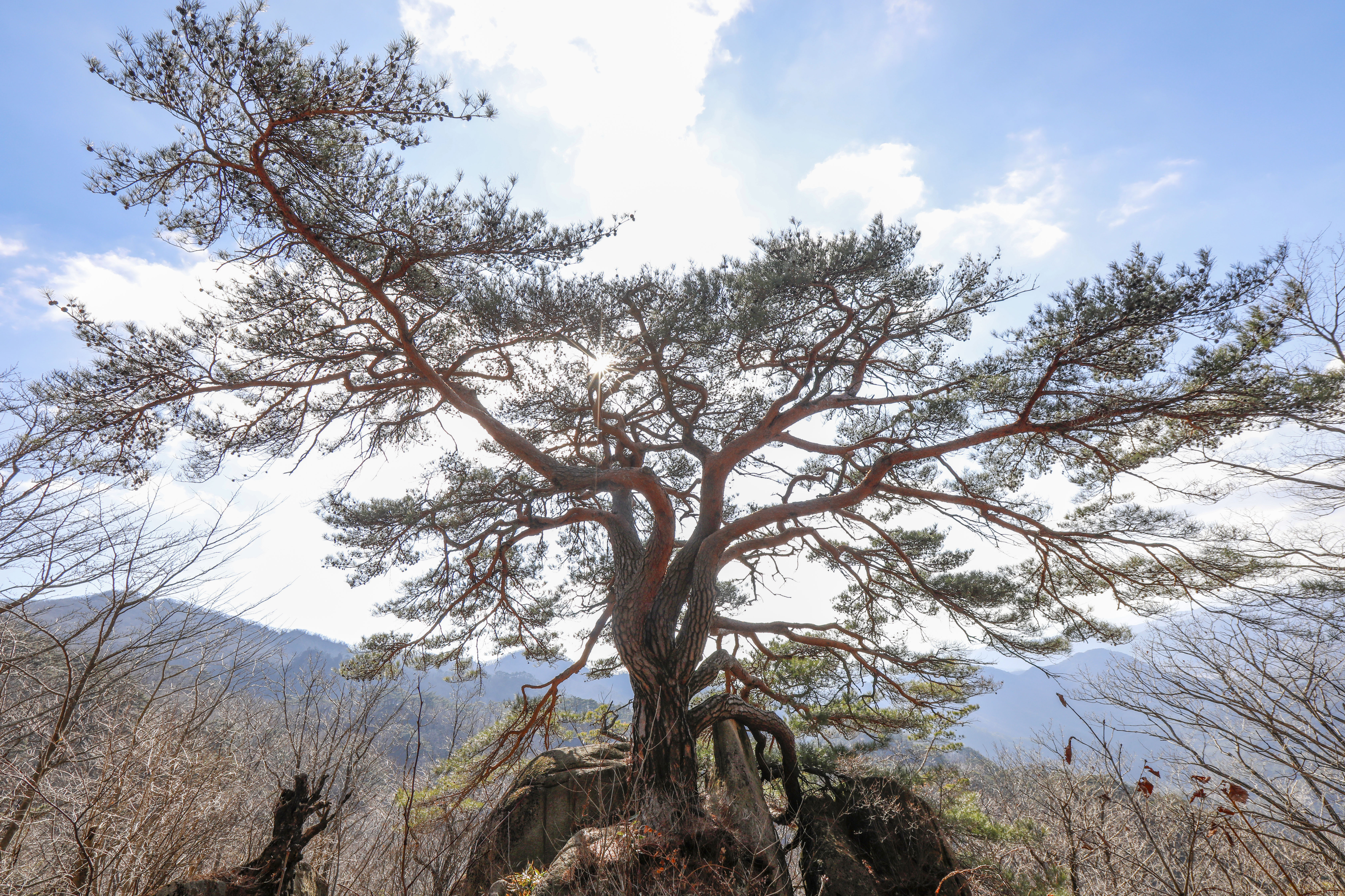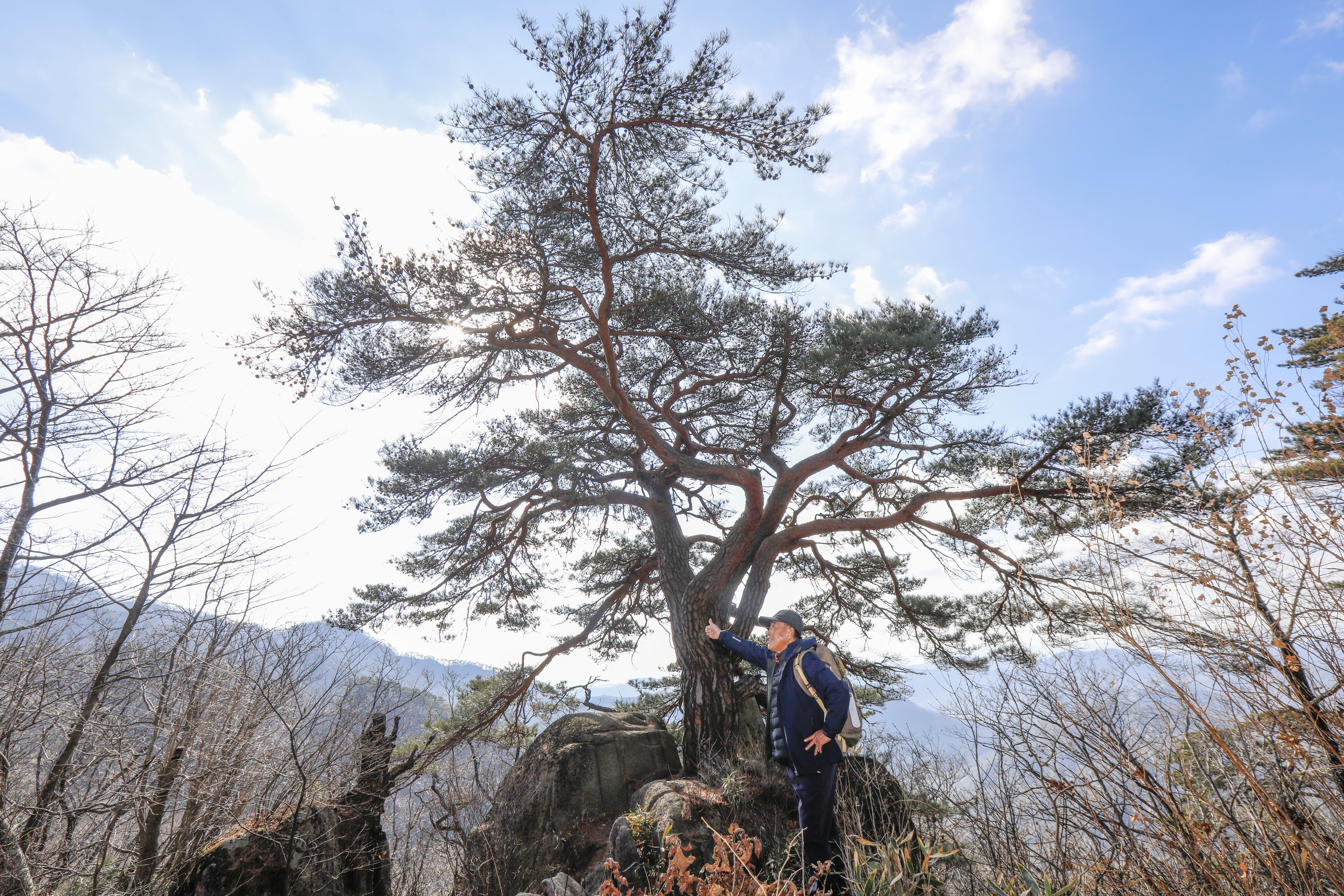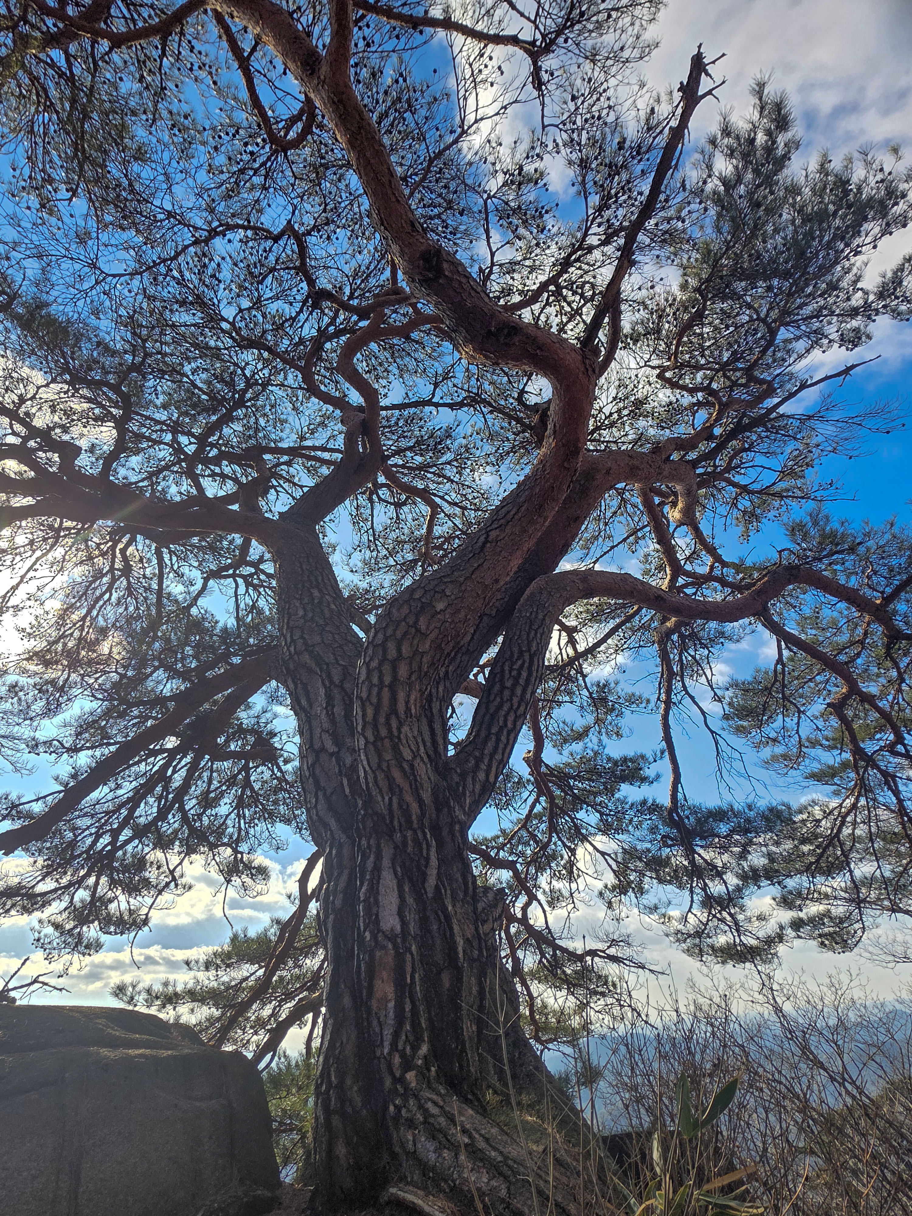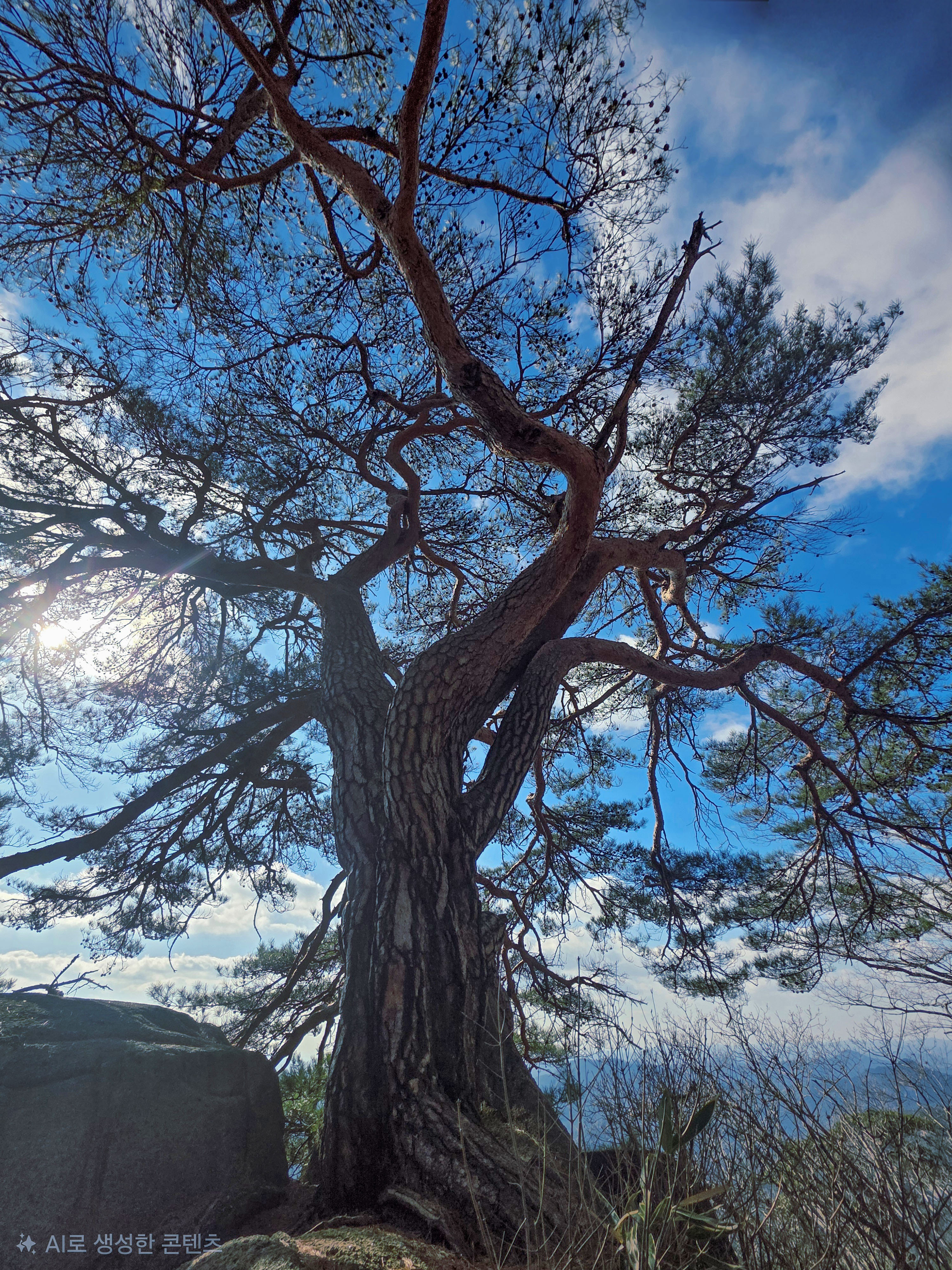바위 능선 위에 홀로 서서 수백 년 폭풍과 번개를 견뎌온 천년송이다.
