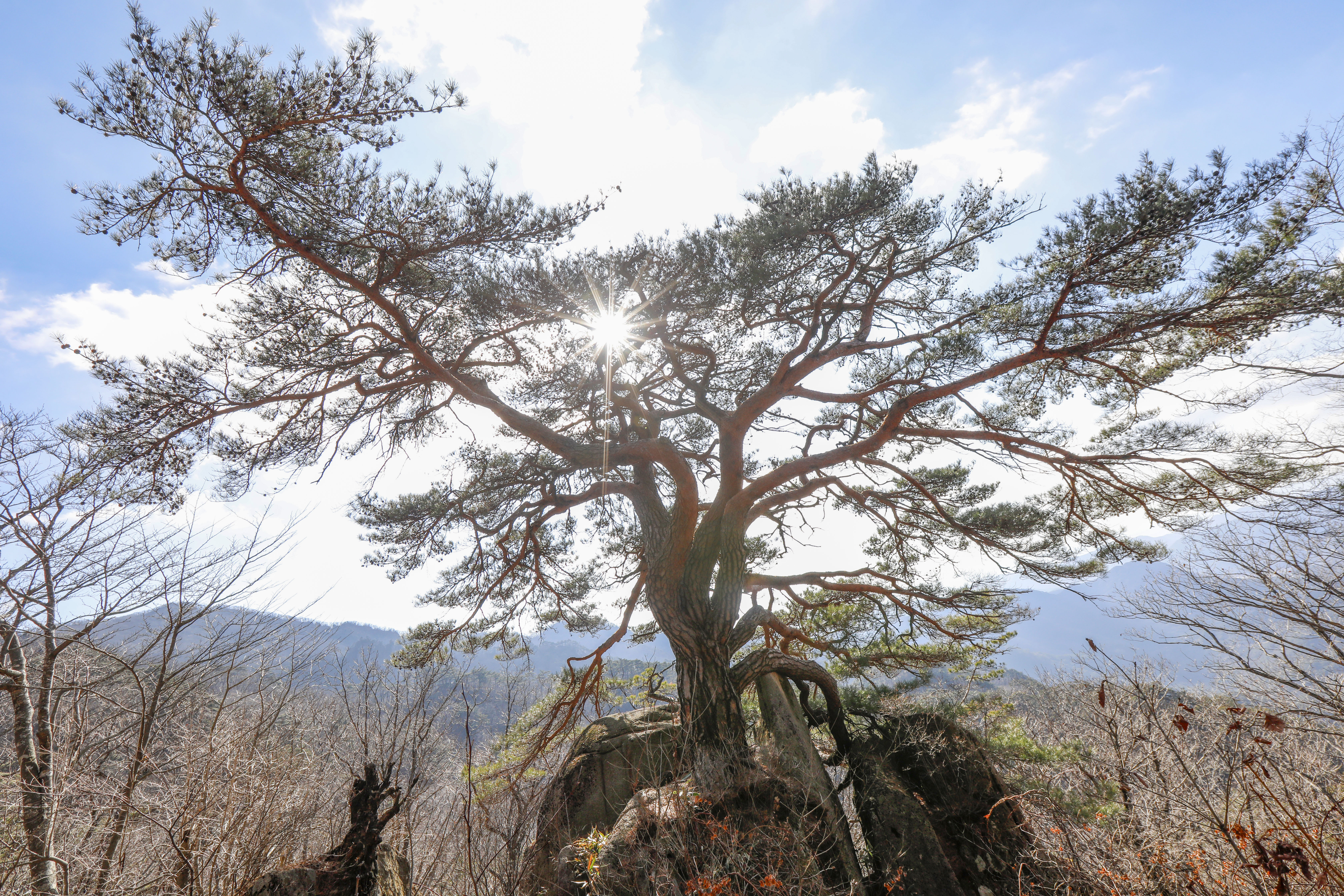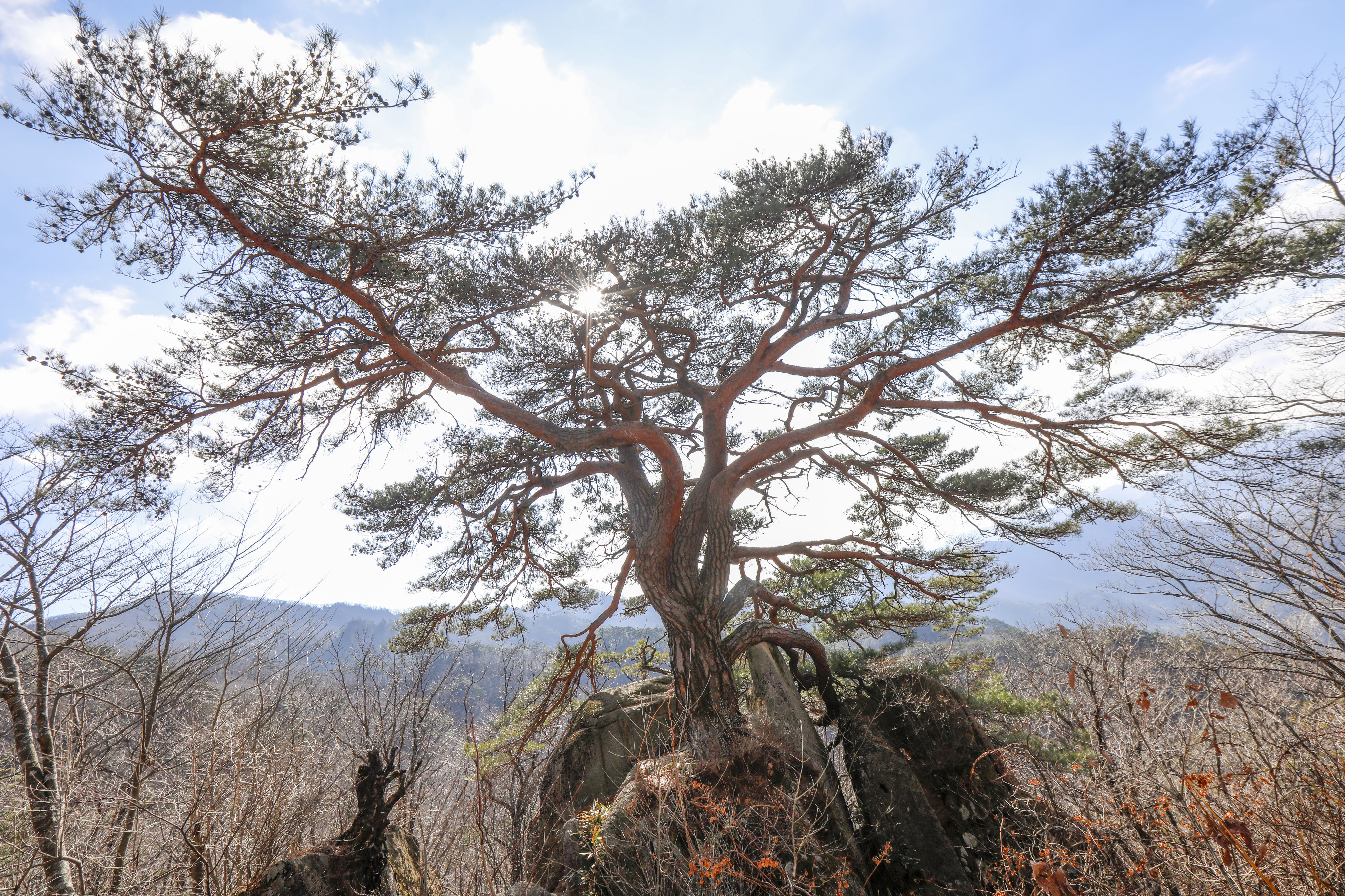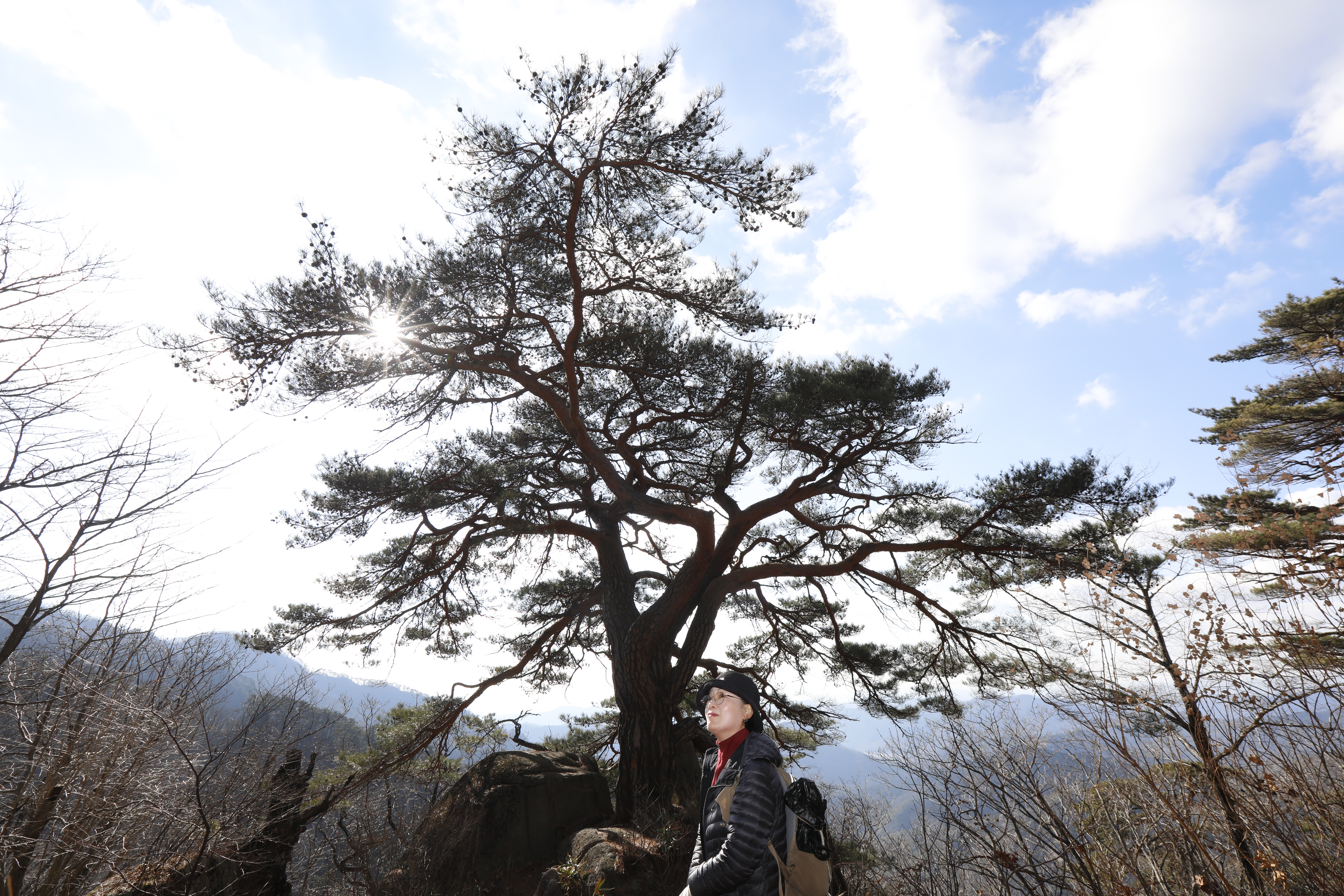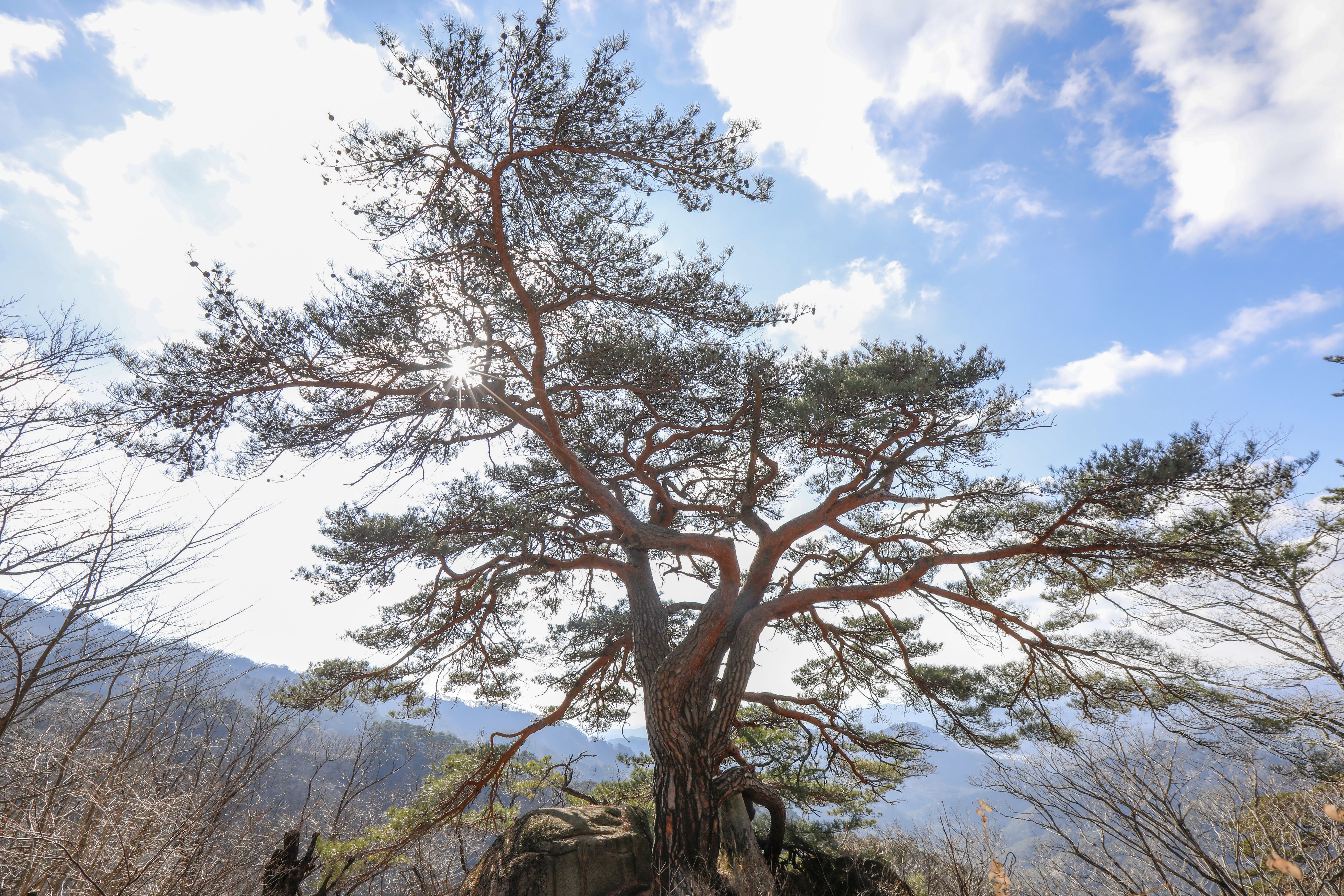 바위 능선 위에 홀로 서서 수백 년 폭풍과 번개를 견뎌온 천년송이다.