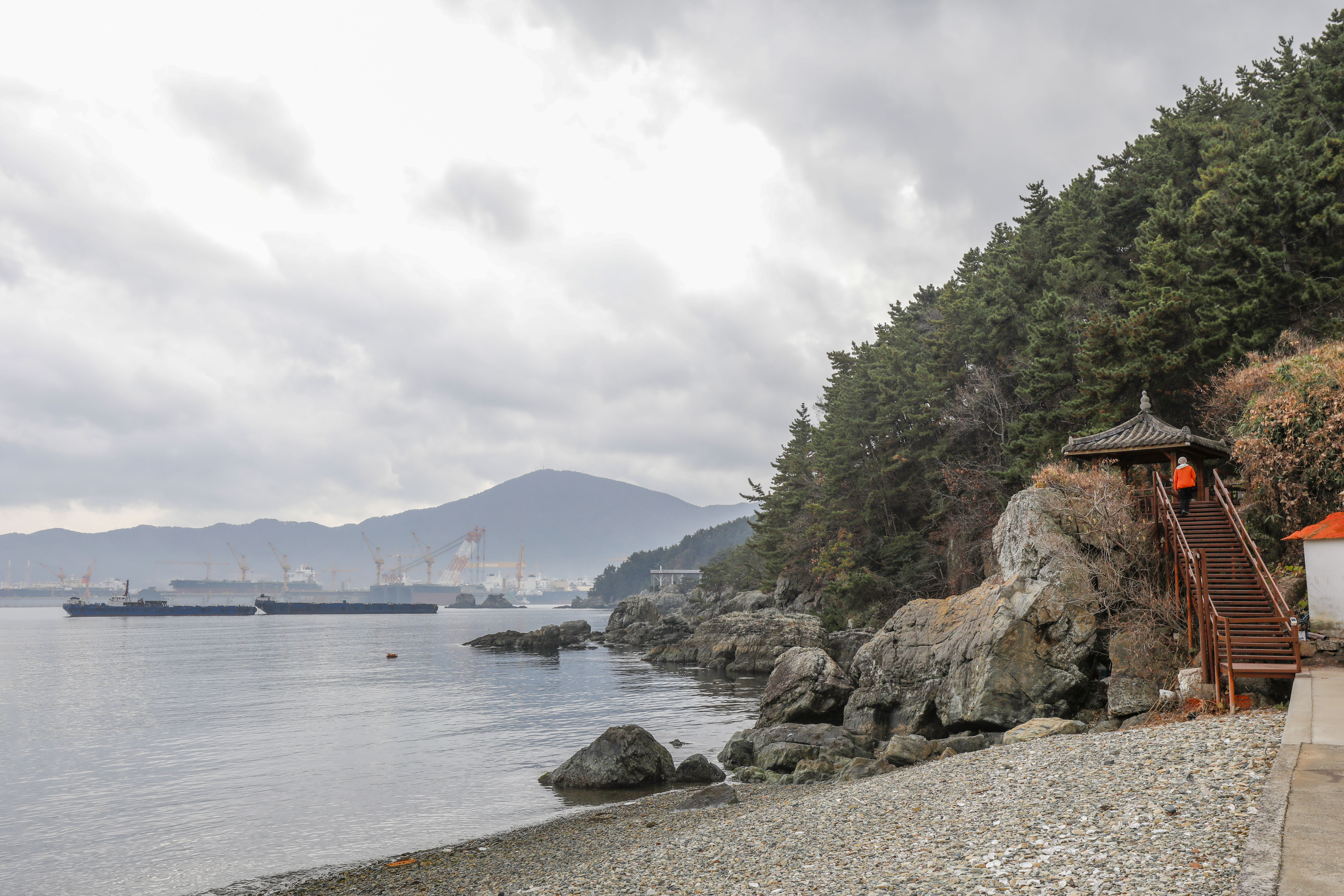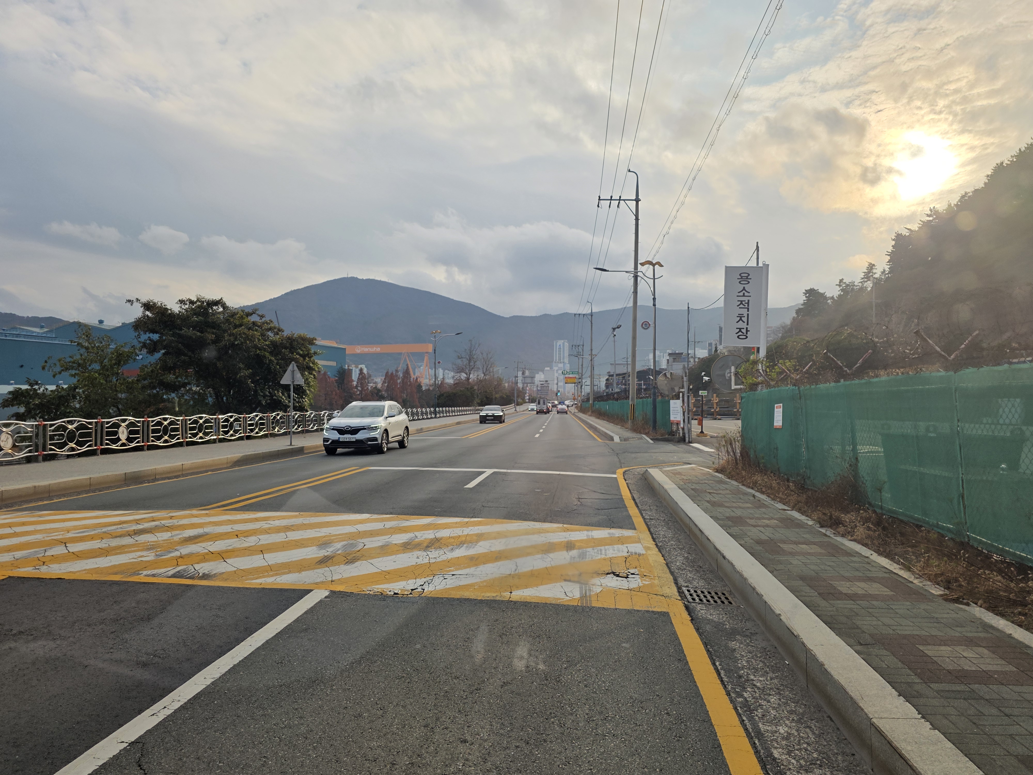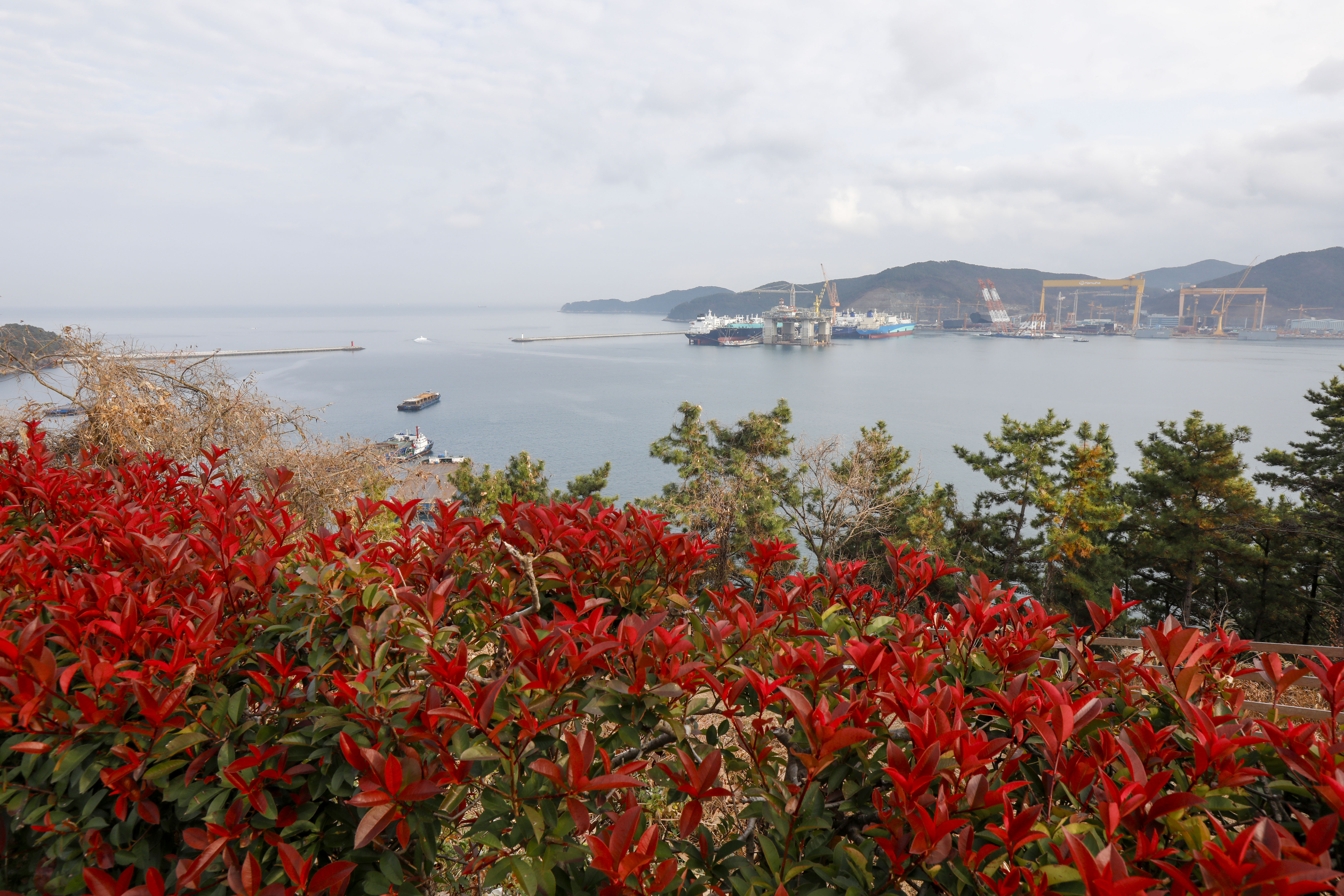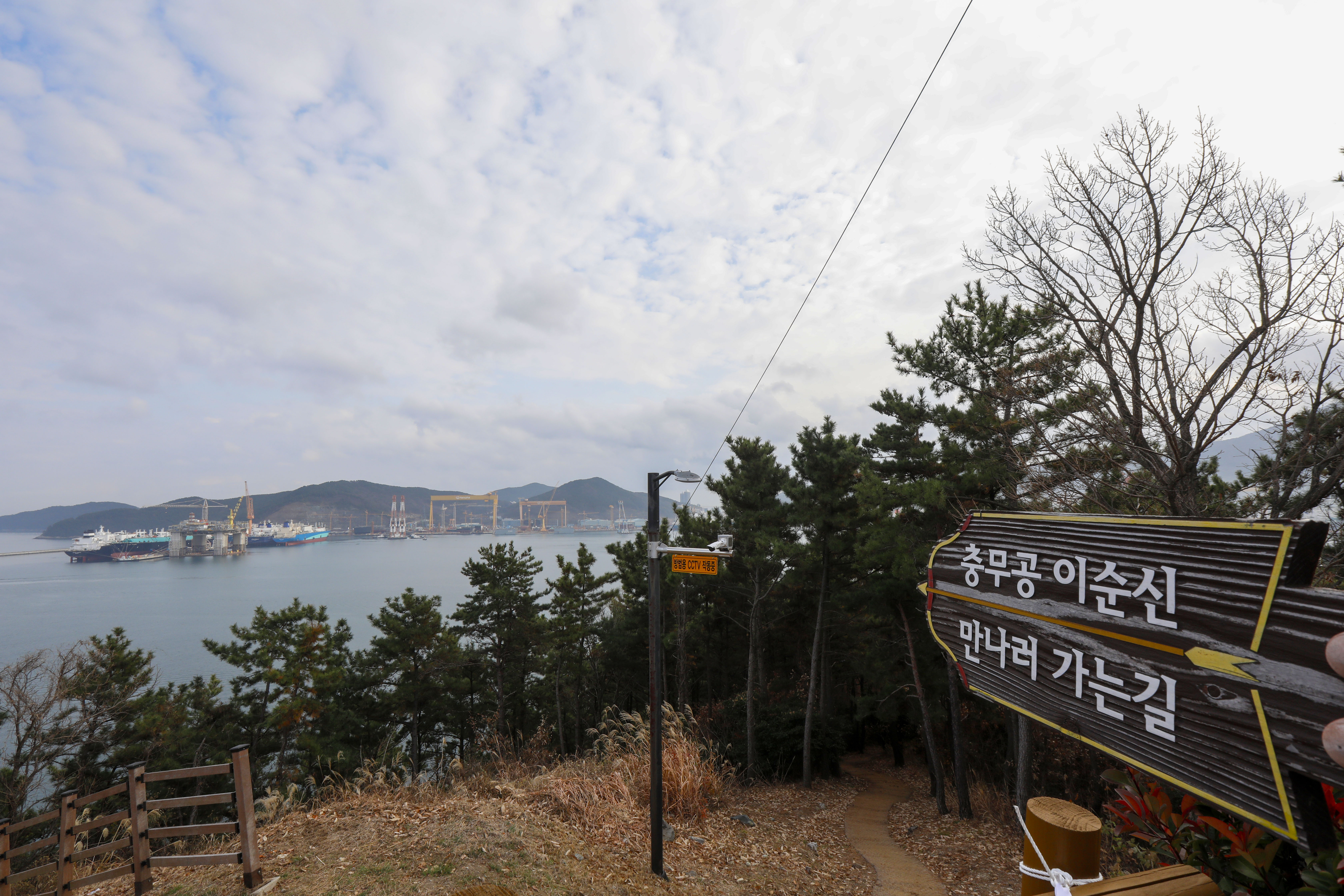 이 길은 남해의 푸른 바다와 함께 **대한민국 조선산업의 심장인 한화오션(구 대우조선해양)**의 거대한 선박 건조장을 함께 조망할 수 있어