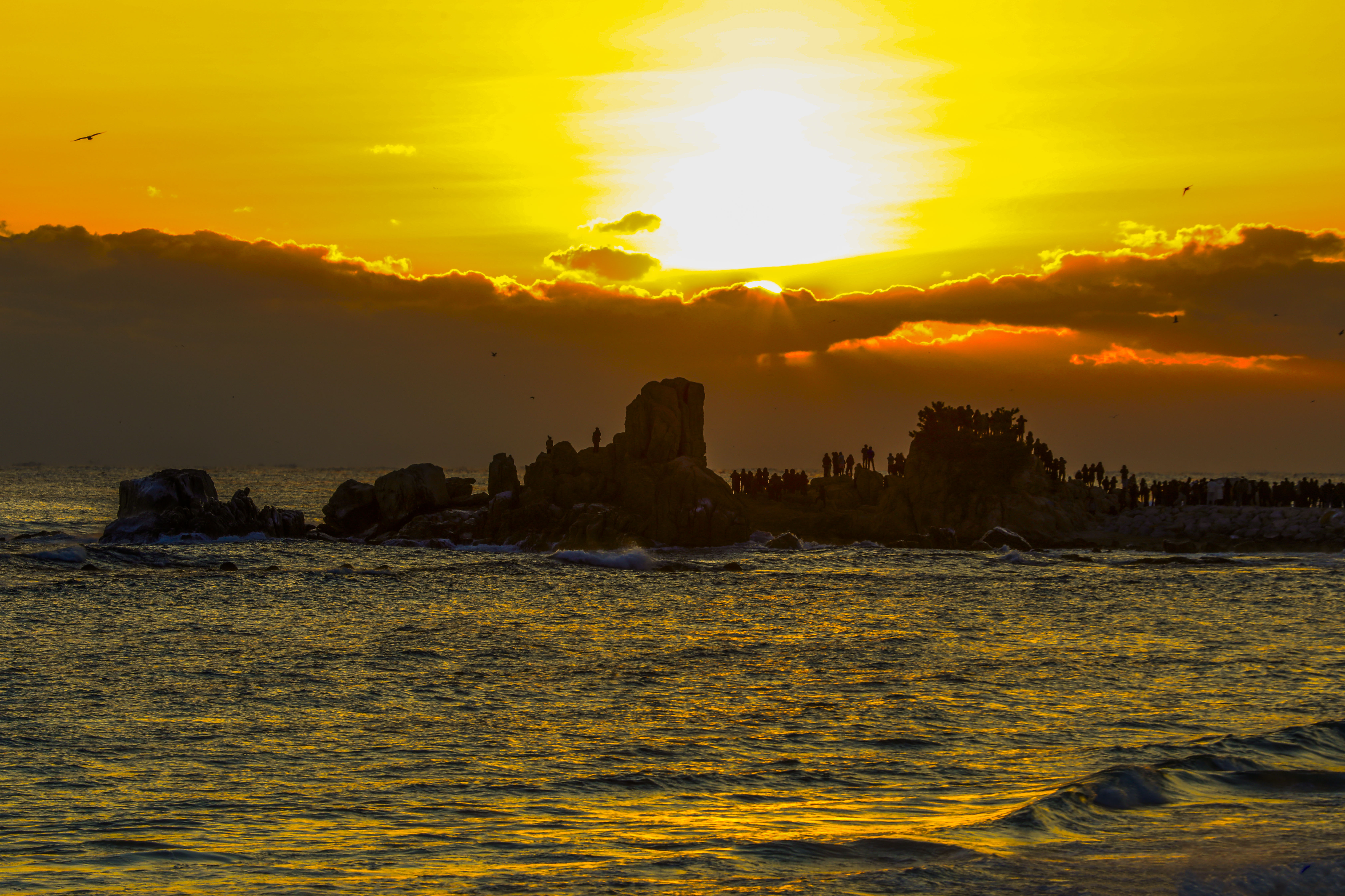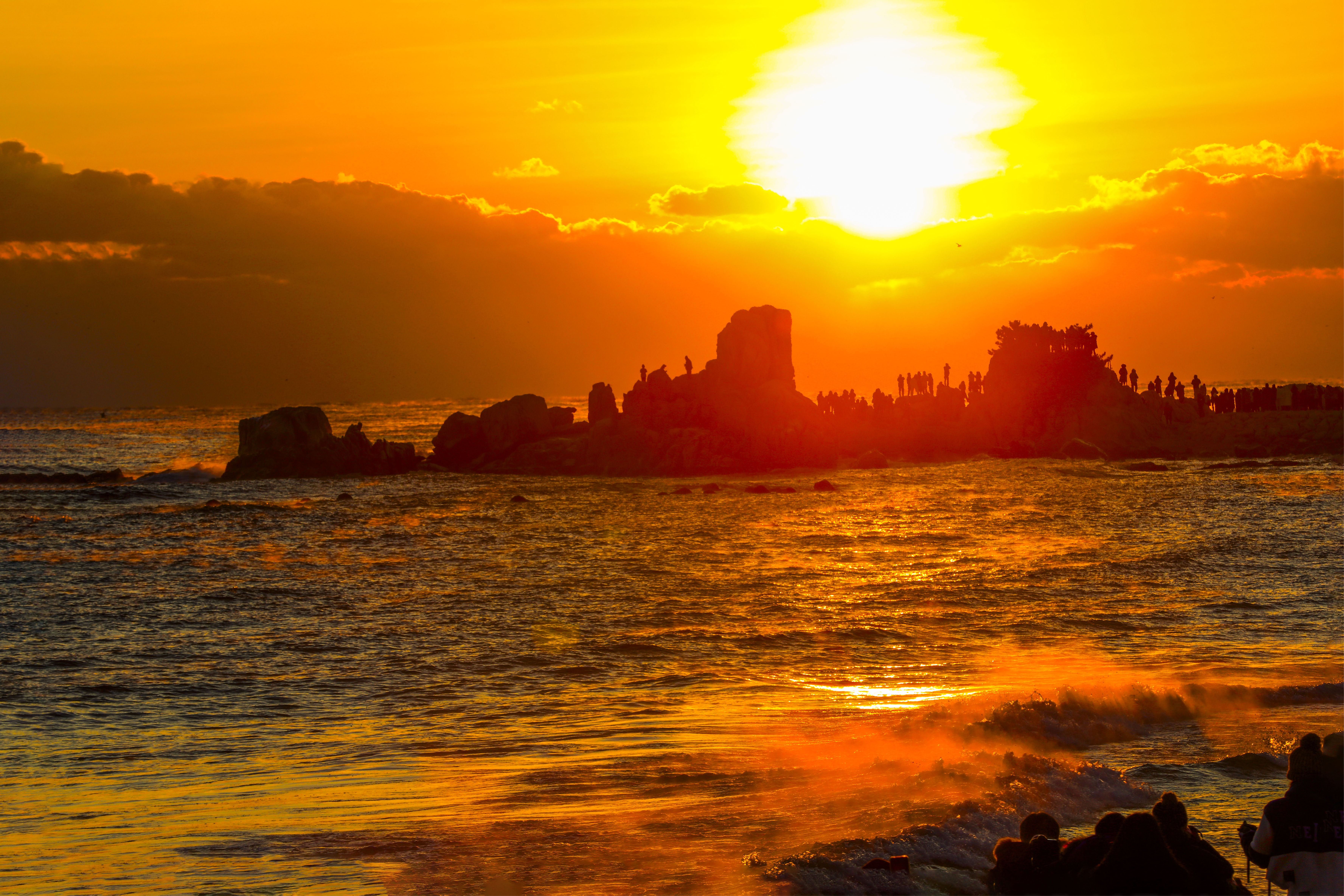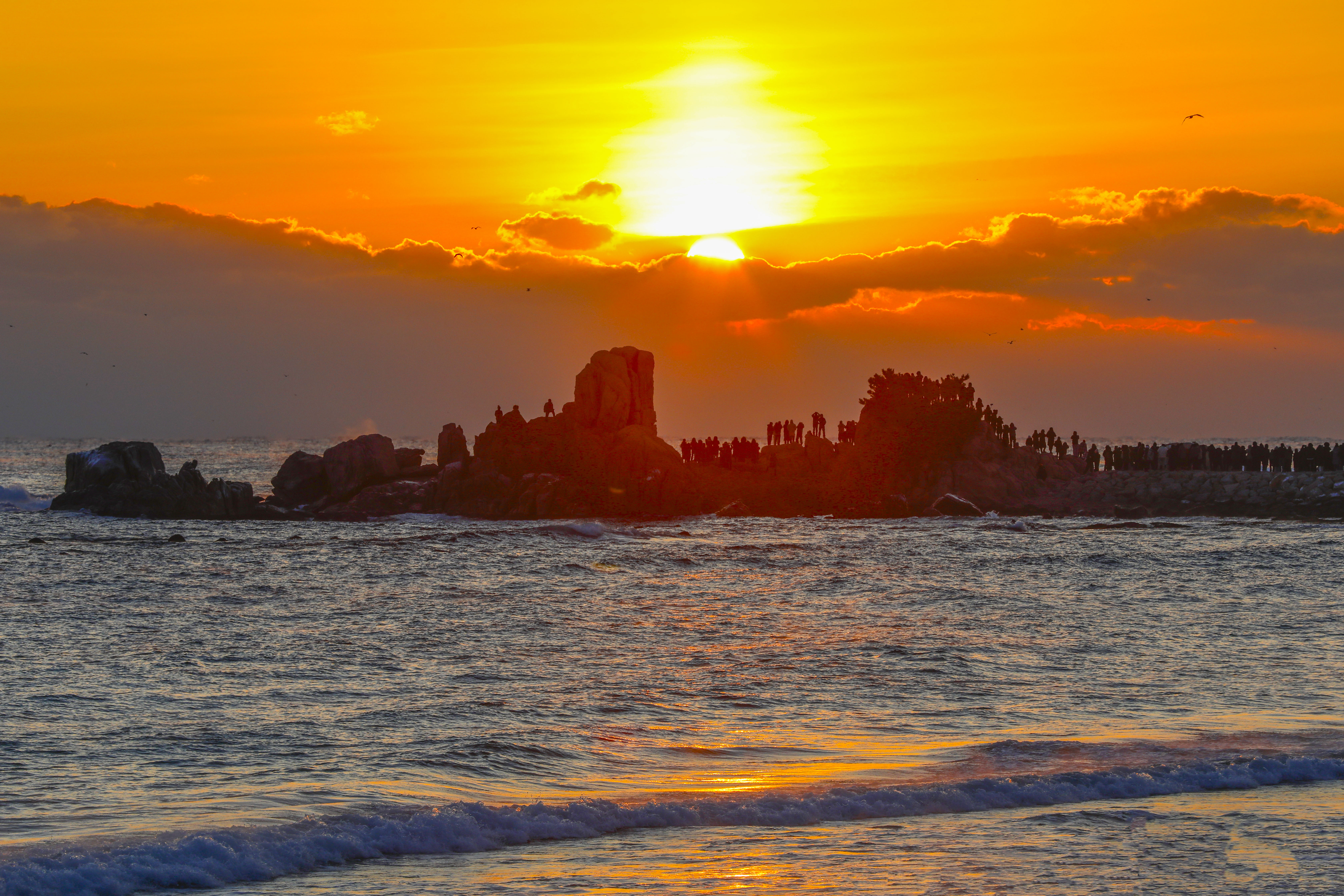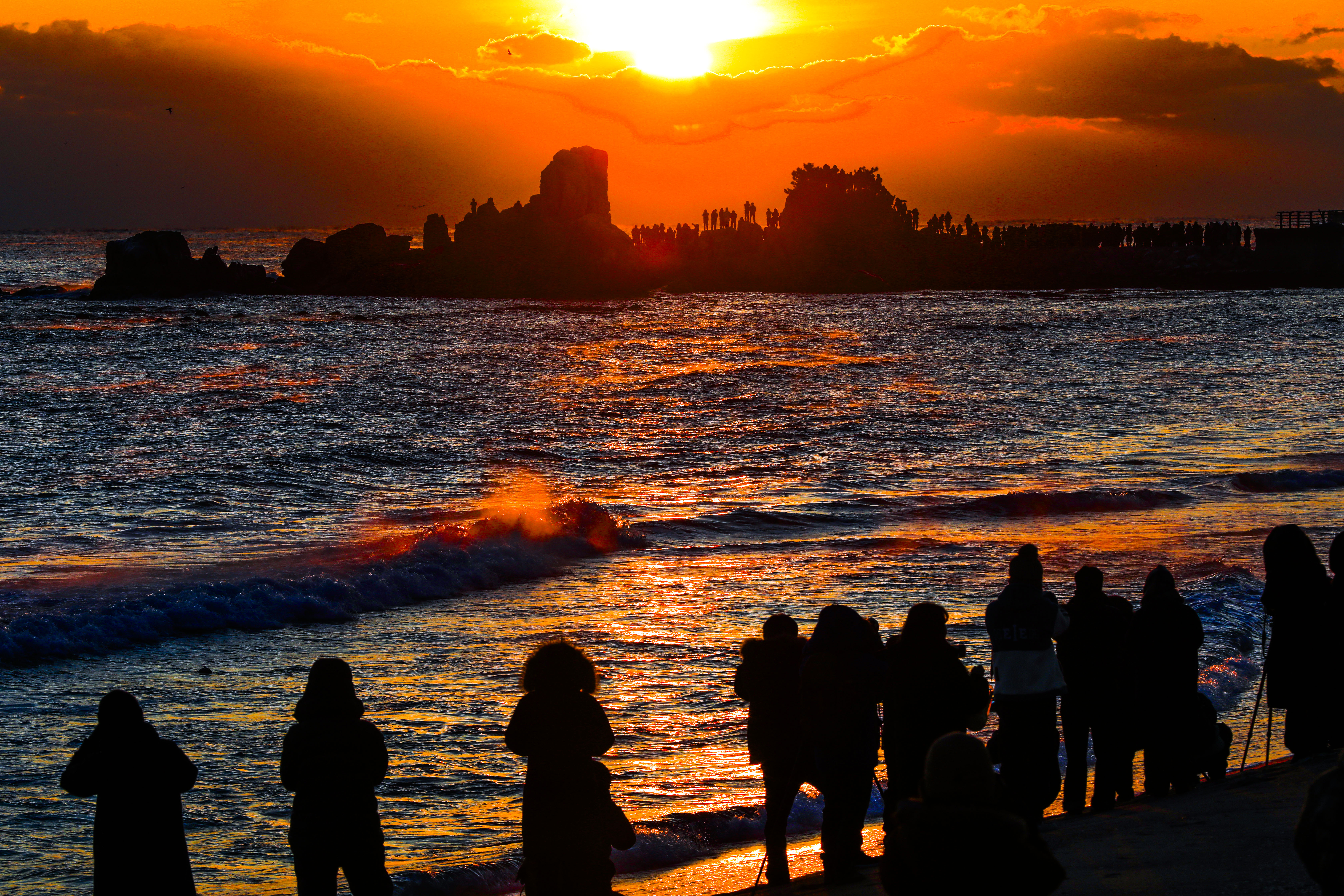 일출 순간, 파도 위로 퍼진 빛의 길과 옵바위에 서 있는 사람들의 실루엣이 더해지며 장엄한 새해 장면이 완성되었다.