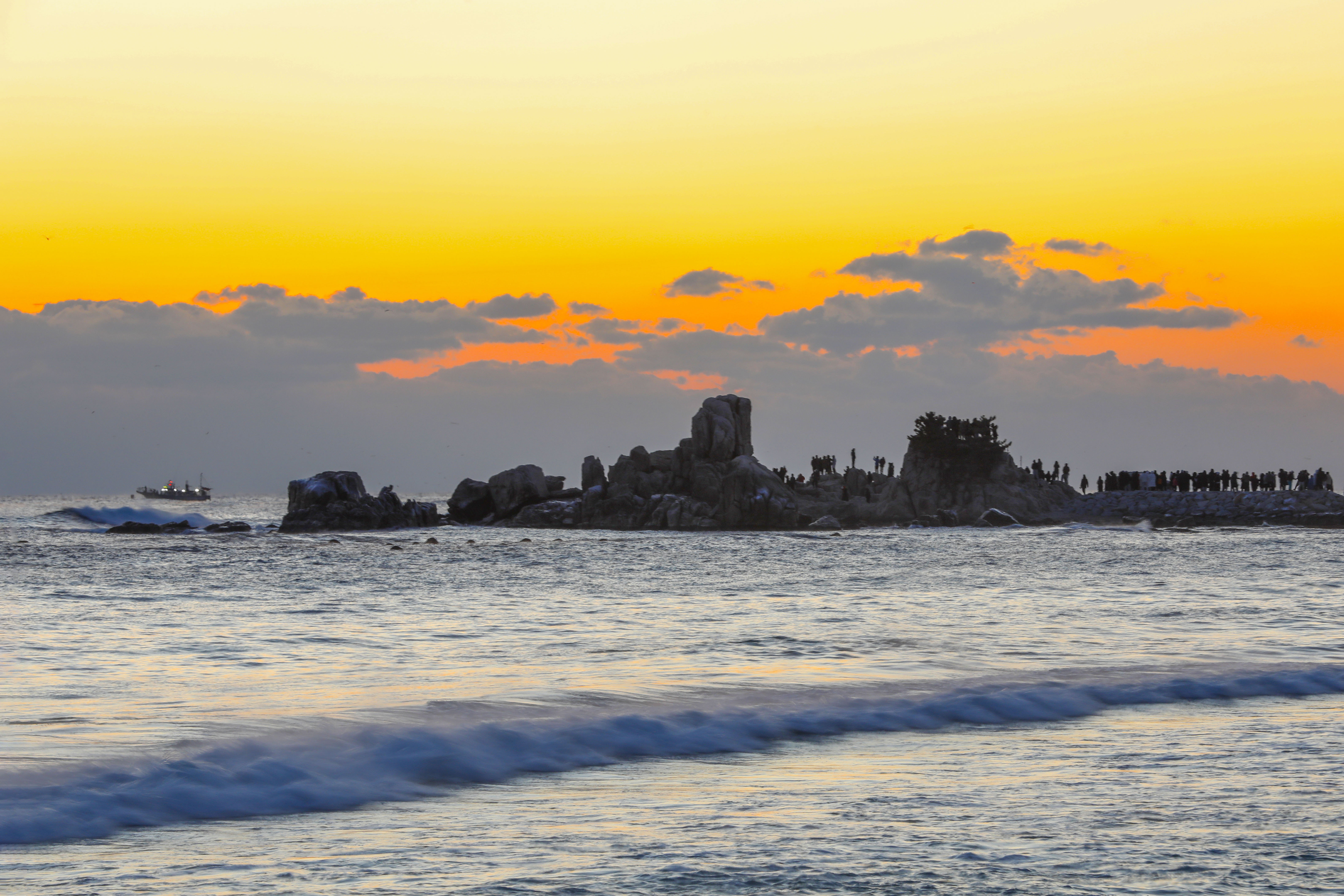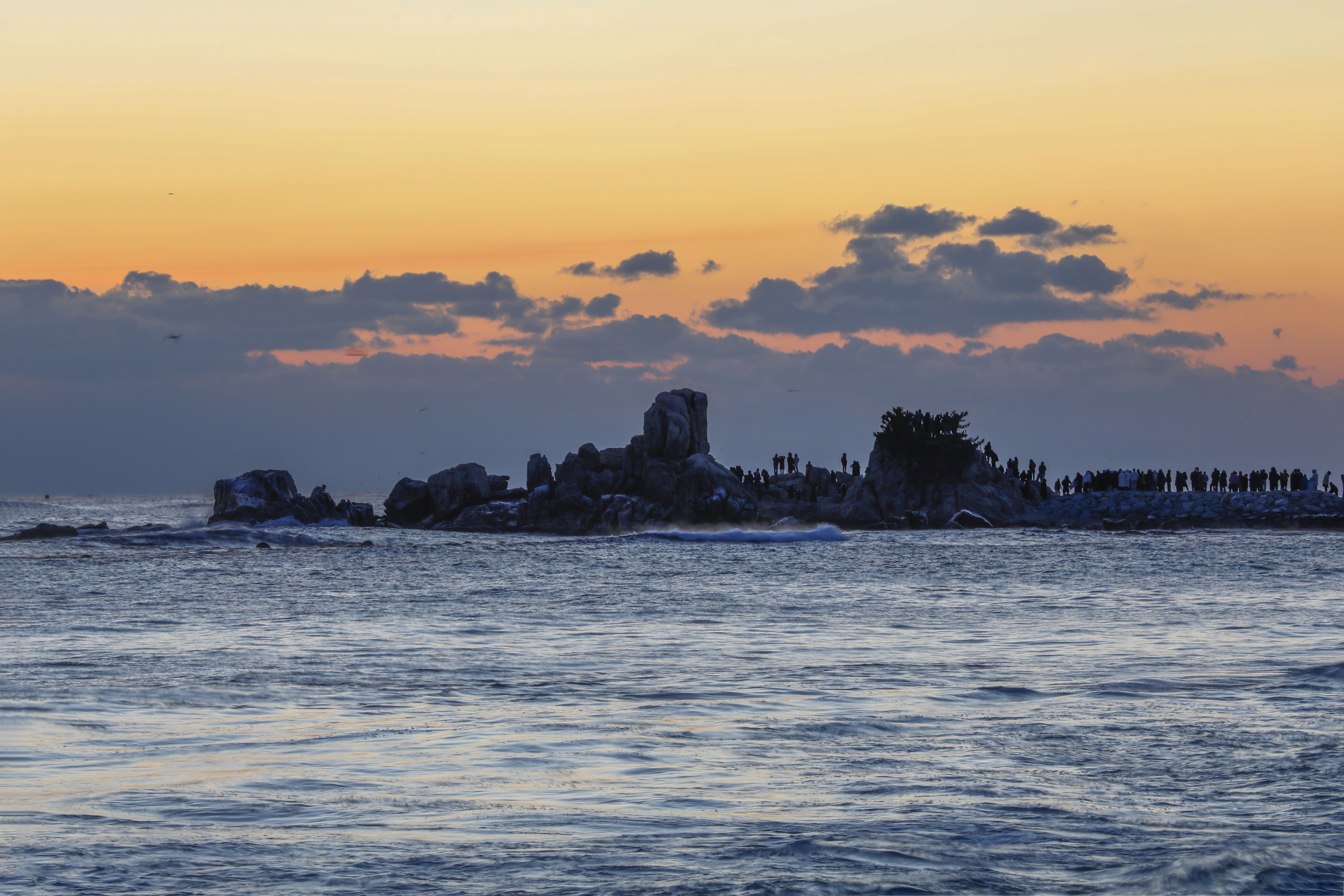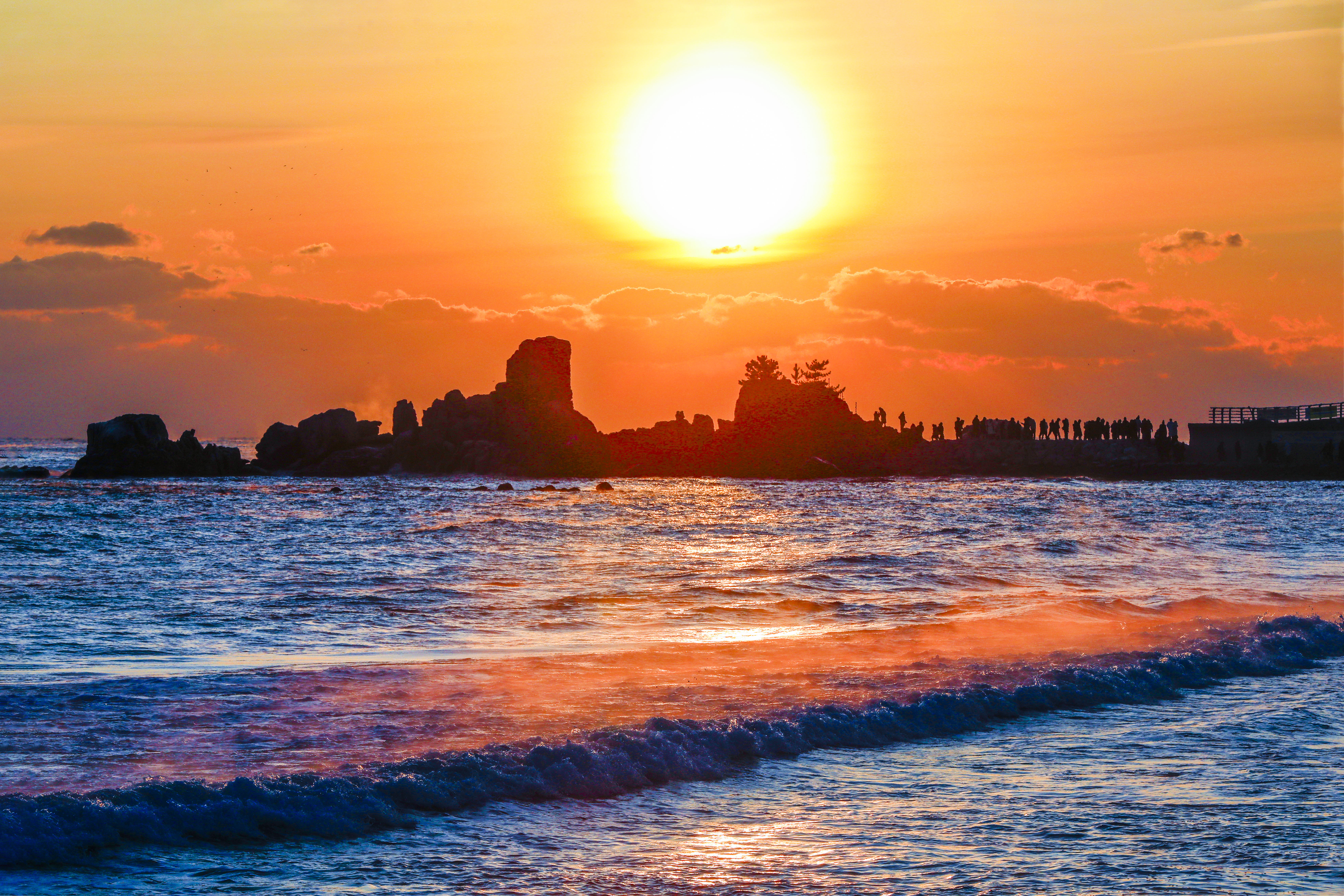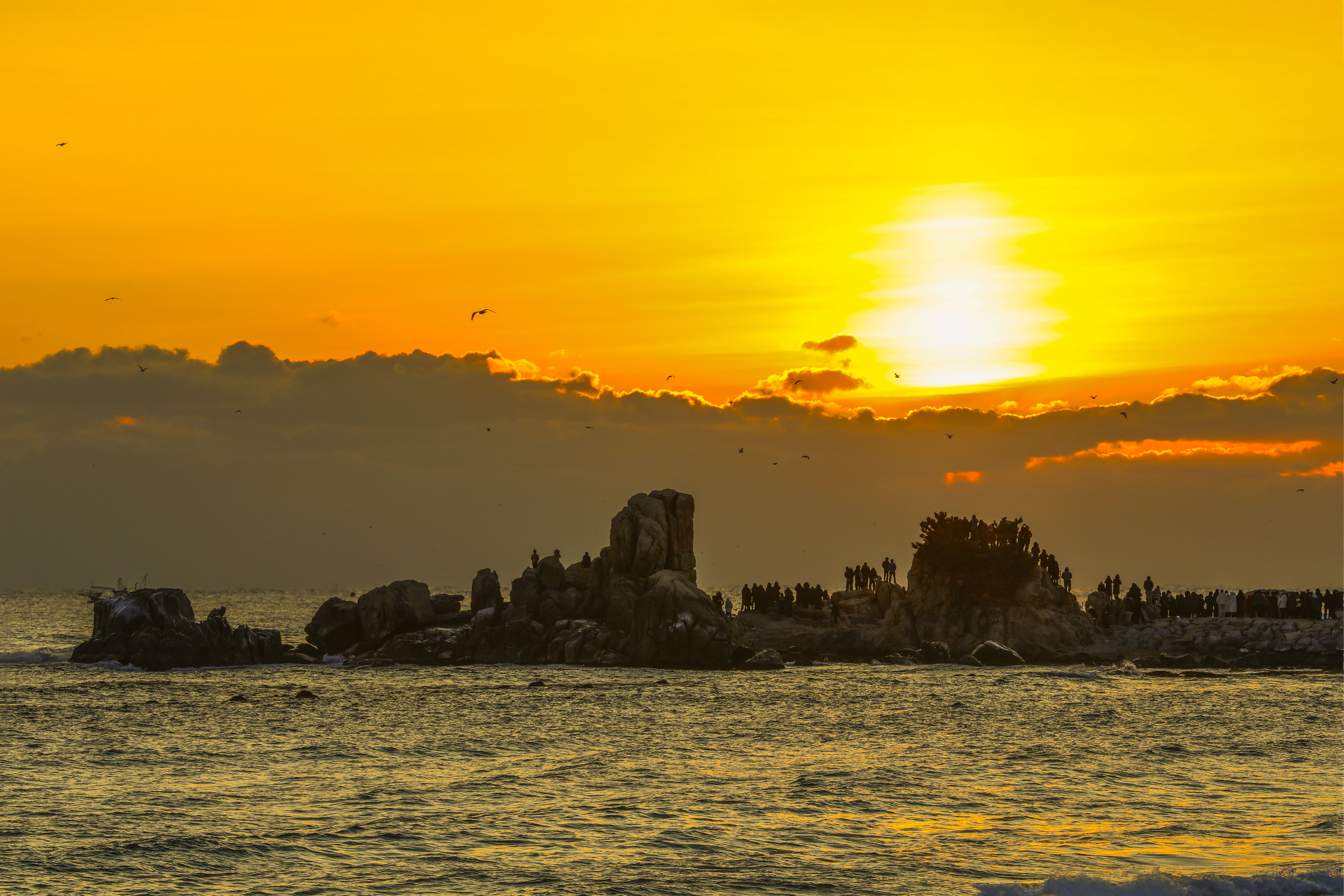 일출 순간, 파도 위로 퍼진 빛의 길과 옵바위에 서 있는 사람들의 실루엣이 더해지며 장엄한 새해 장면이 완성되었다.