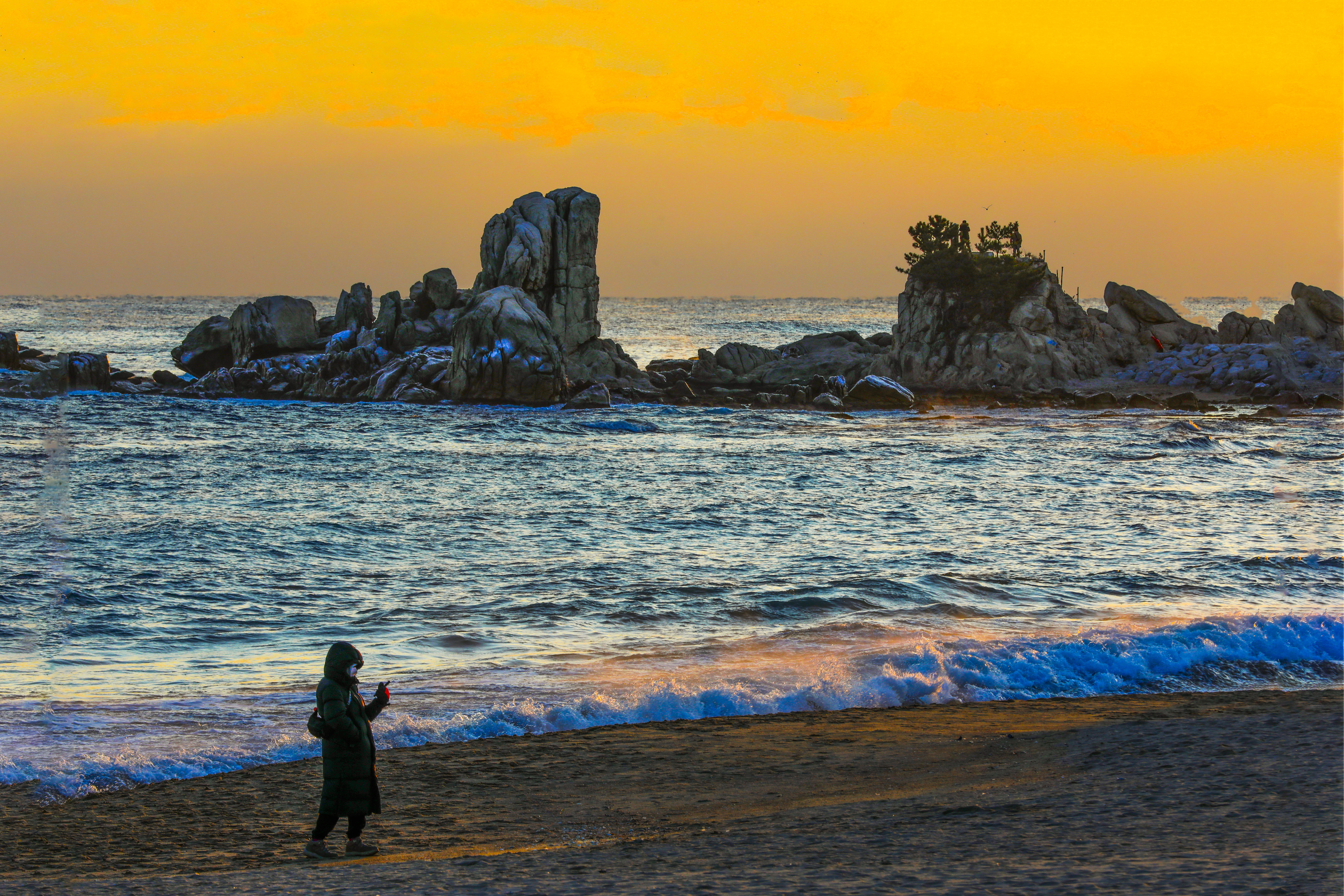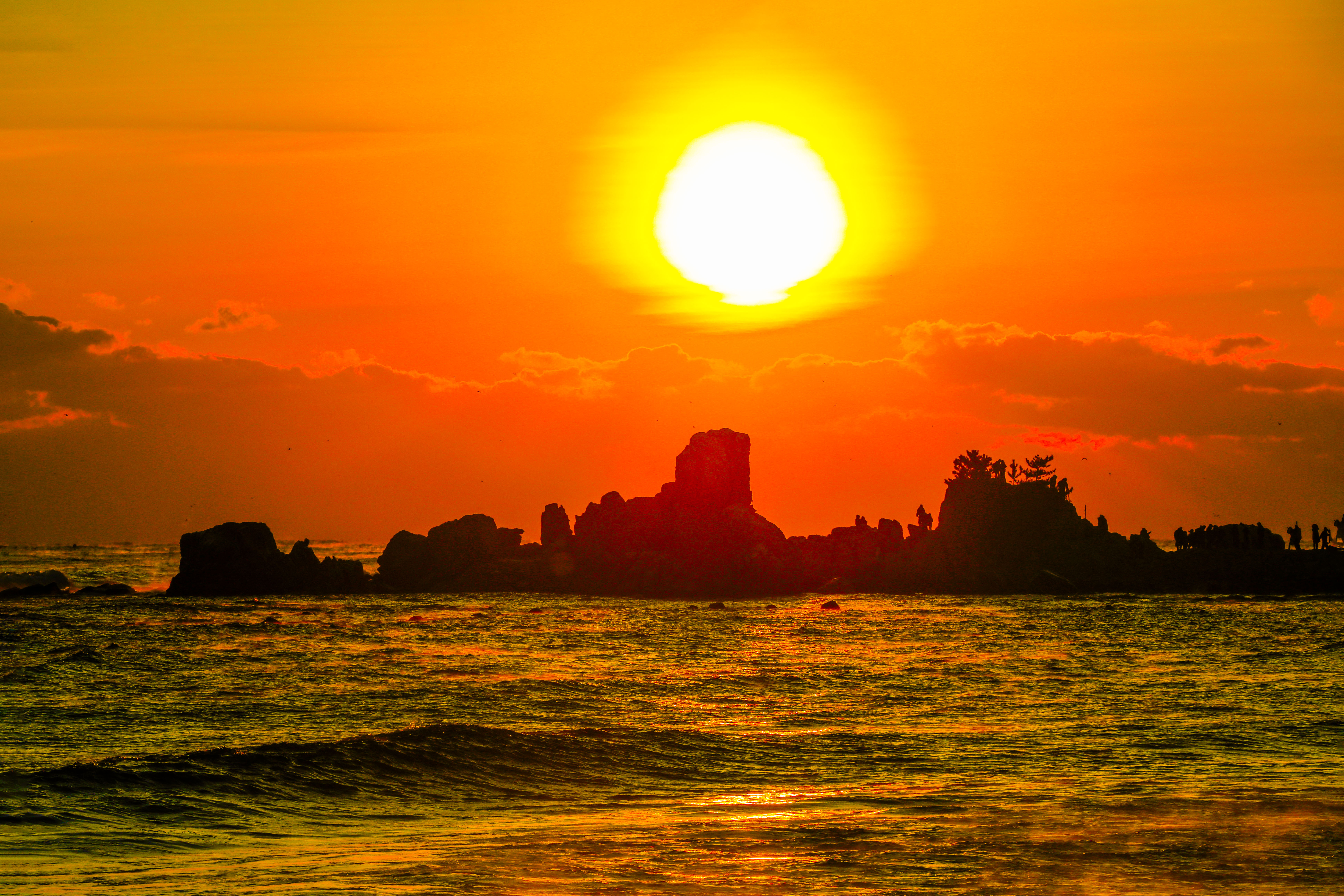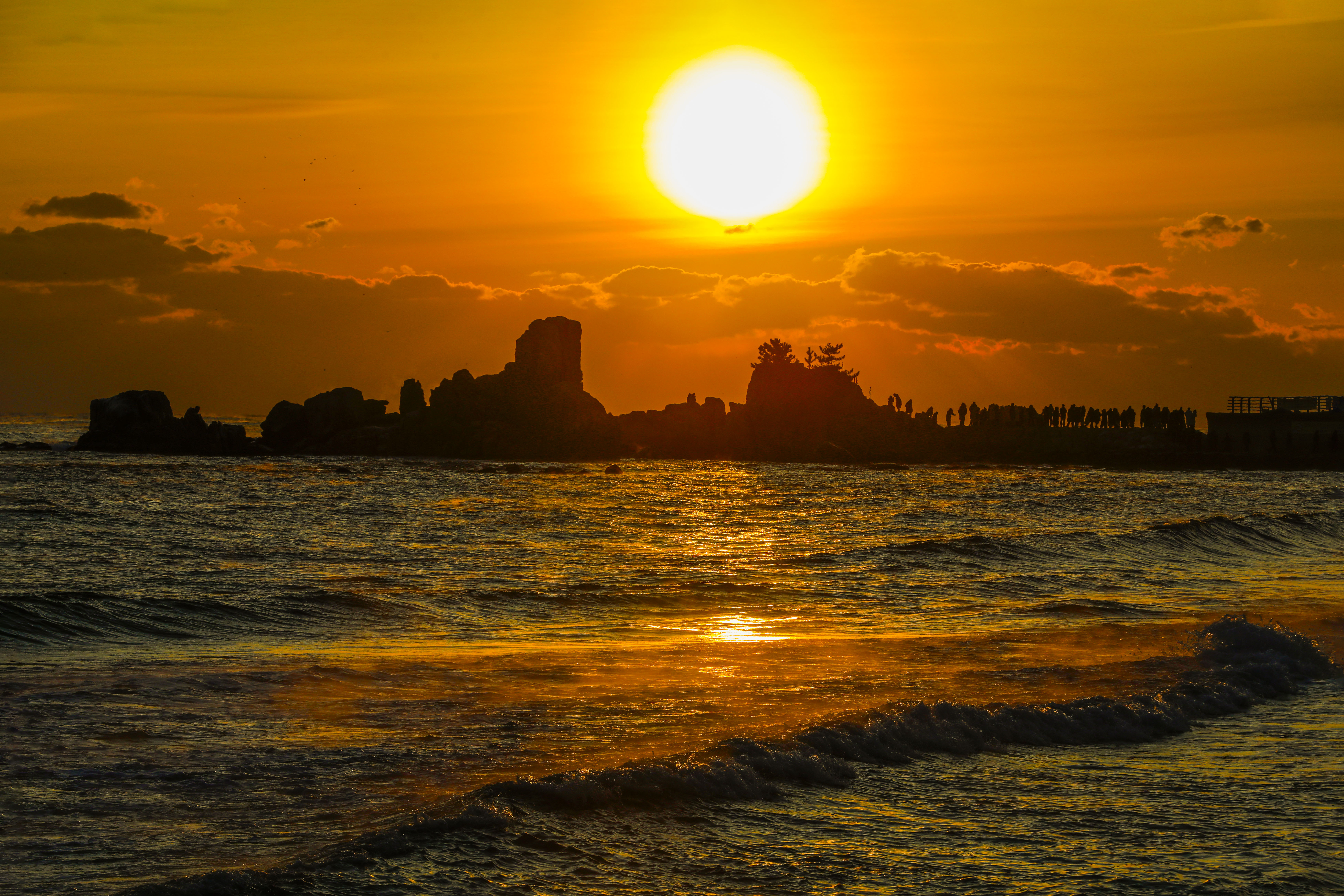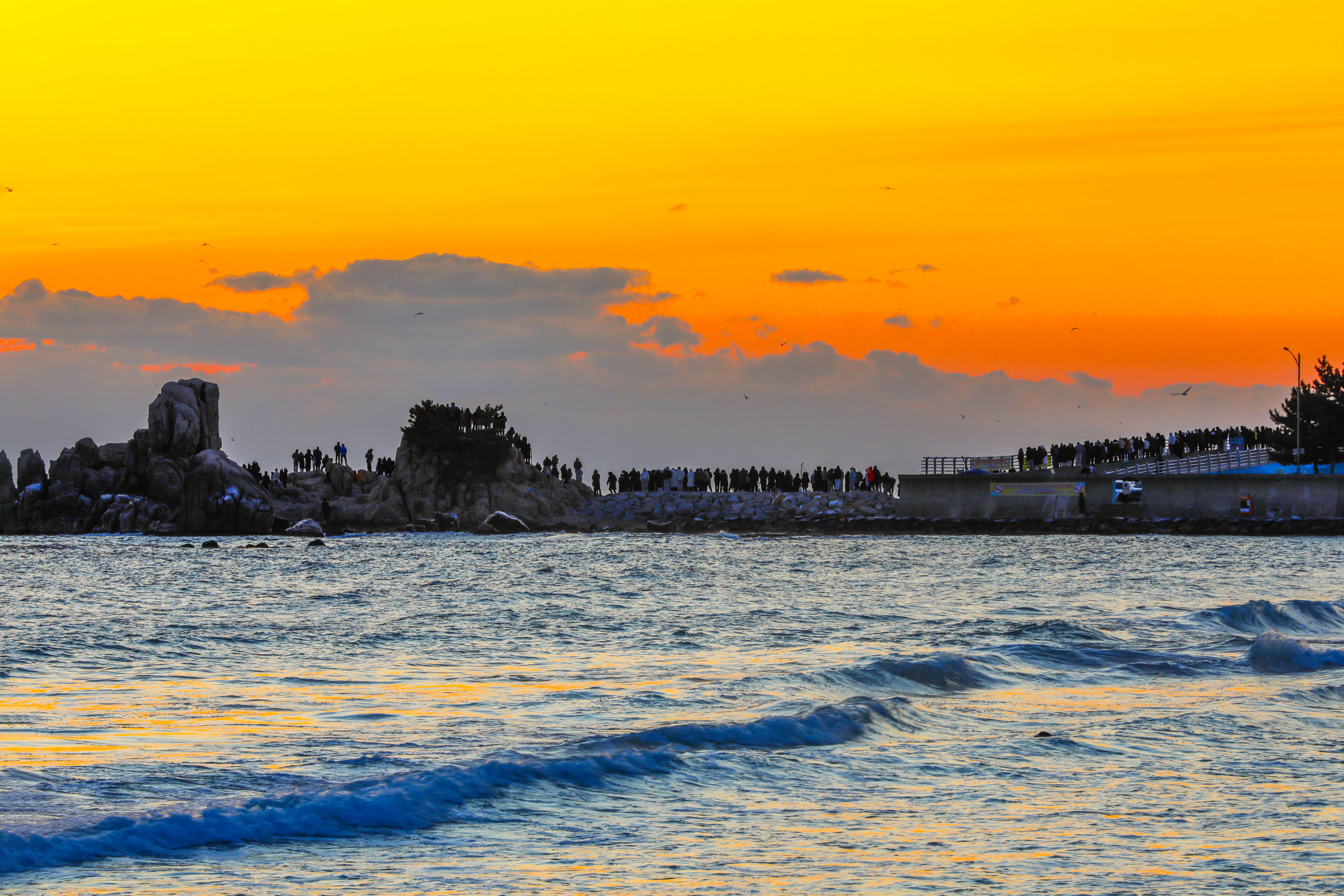 일출 순간, 파도 위로 퍼진 빛의 길과 옵바위에 서 있는 사람들의 실루엣이 더해지며 장엄한 새해 장면이 완성되었다.