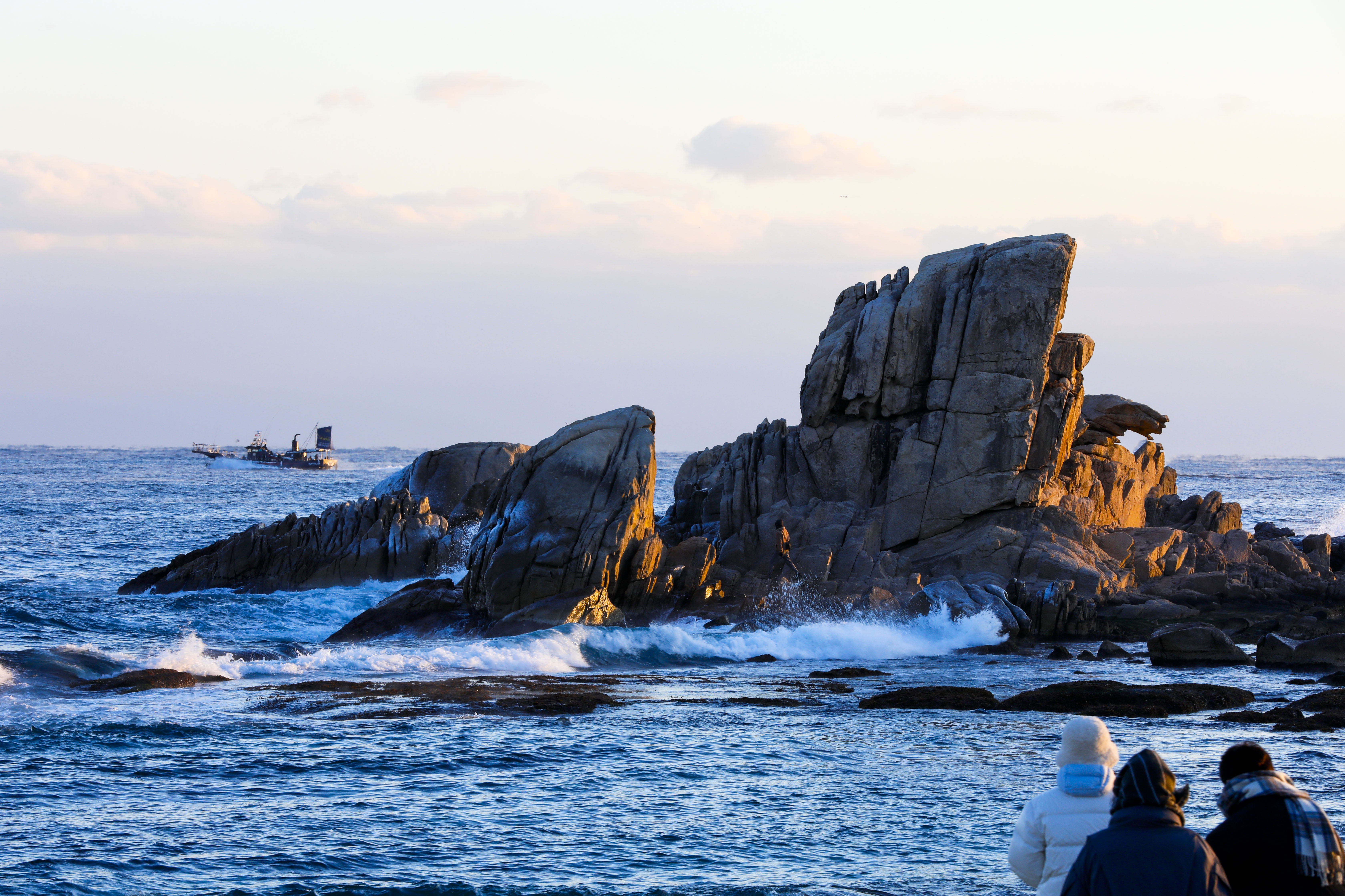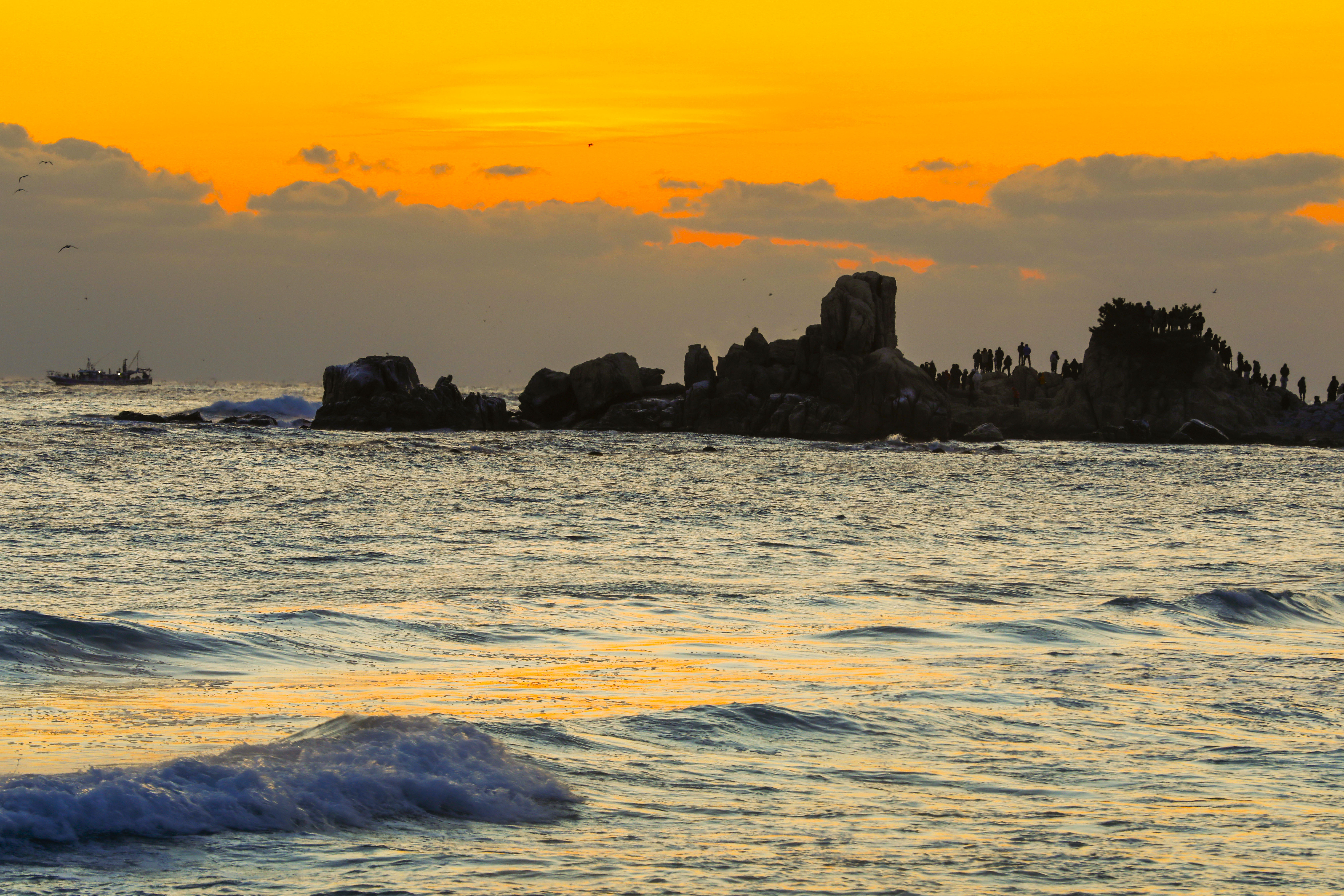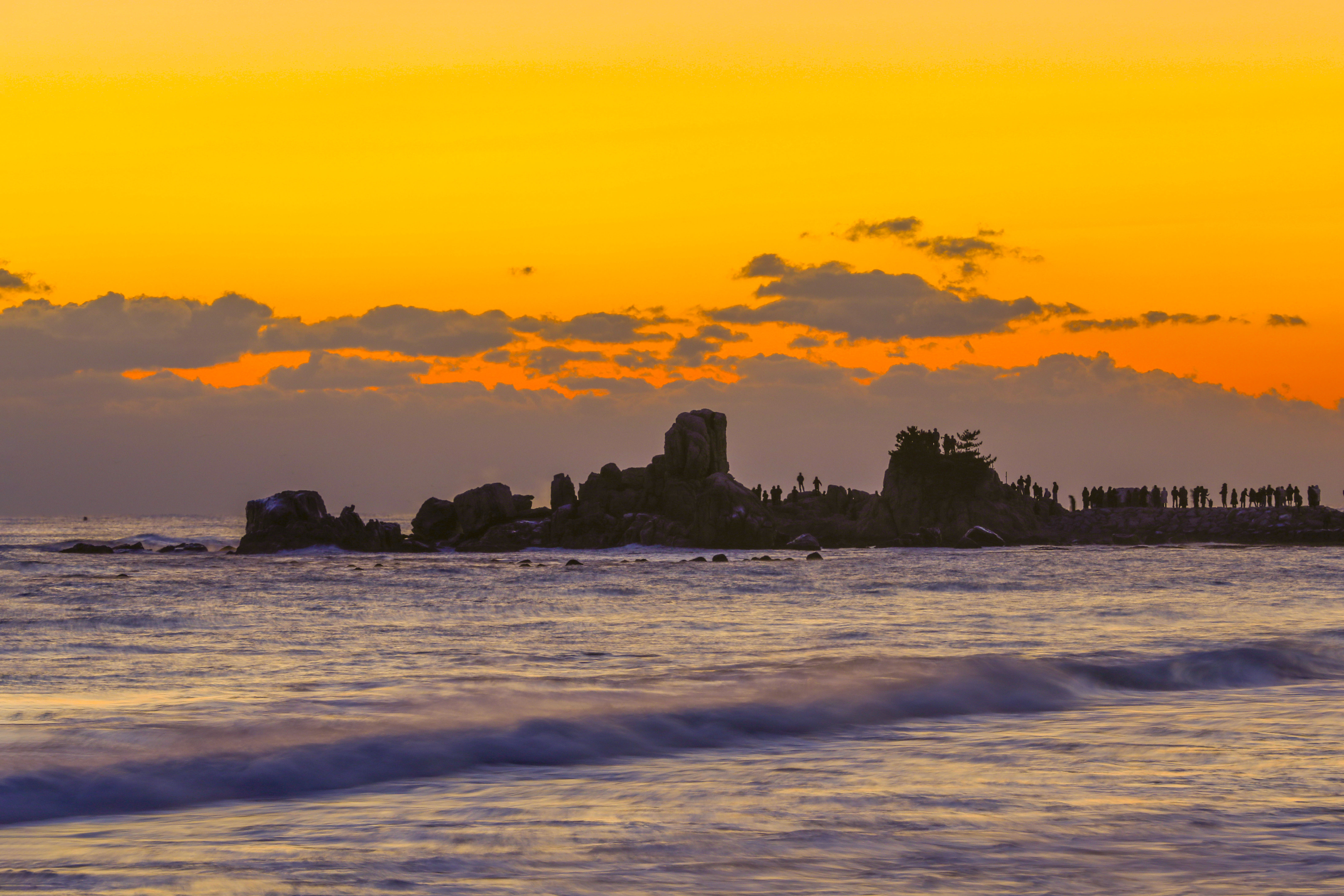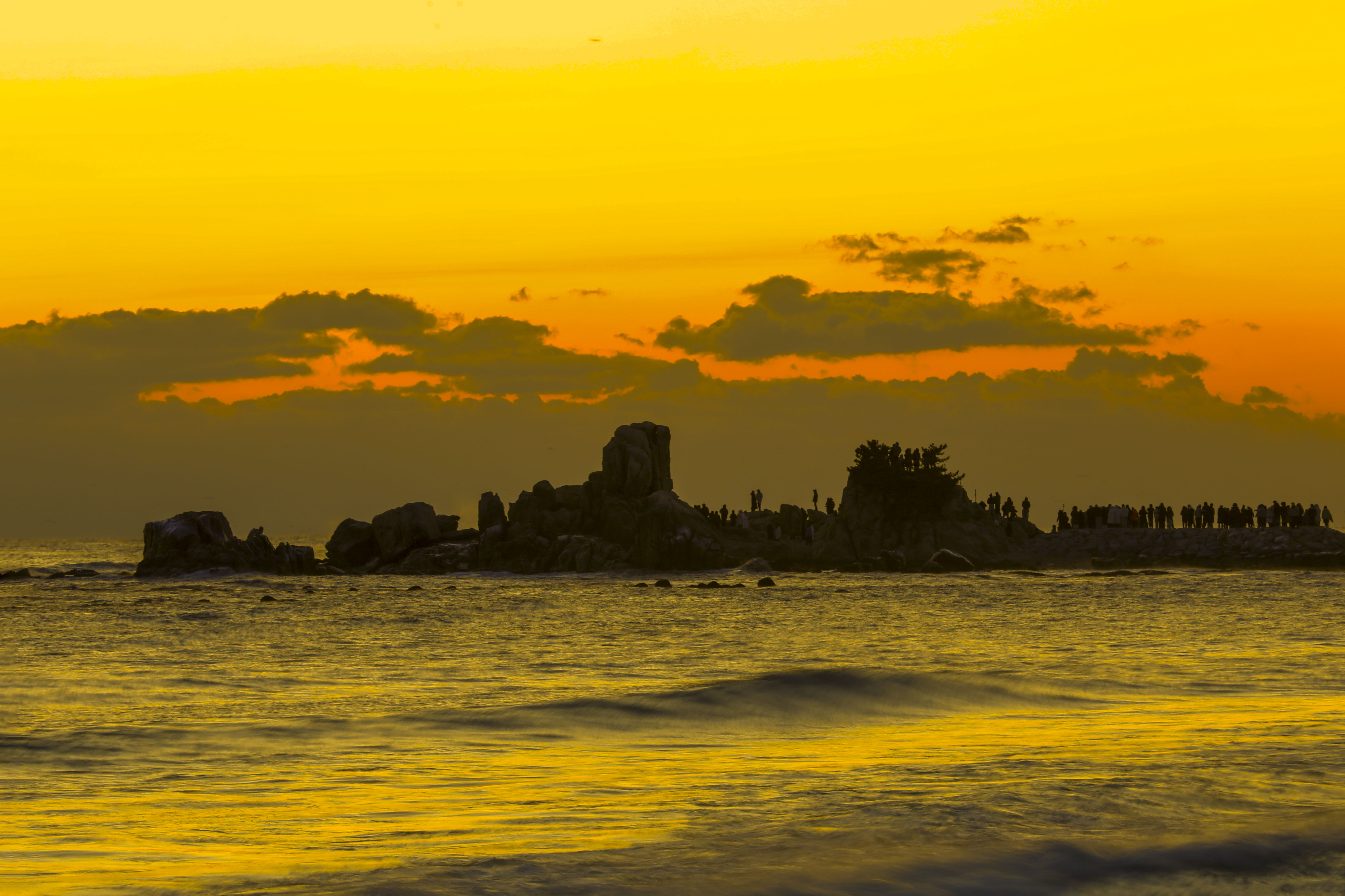 일출 순간, 파도 위로 퍼진 빛의 길과 옵바위에 서 있는 사람들의 실루엣이 더해지며 장엄한 새해 장면이 완성되었다.