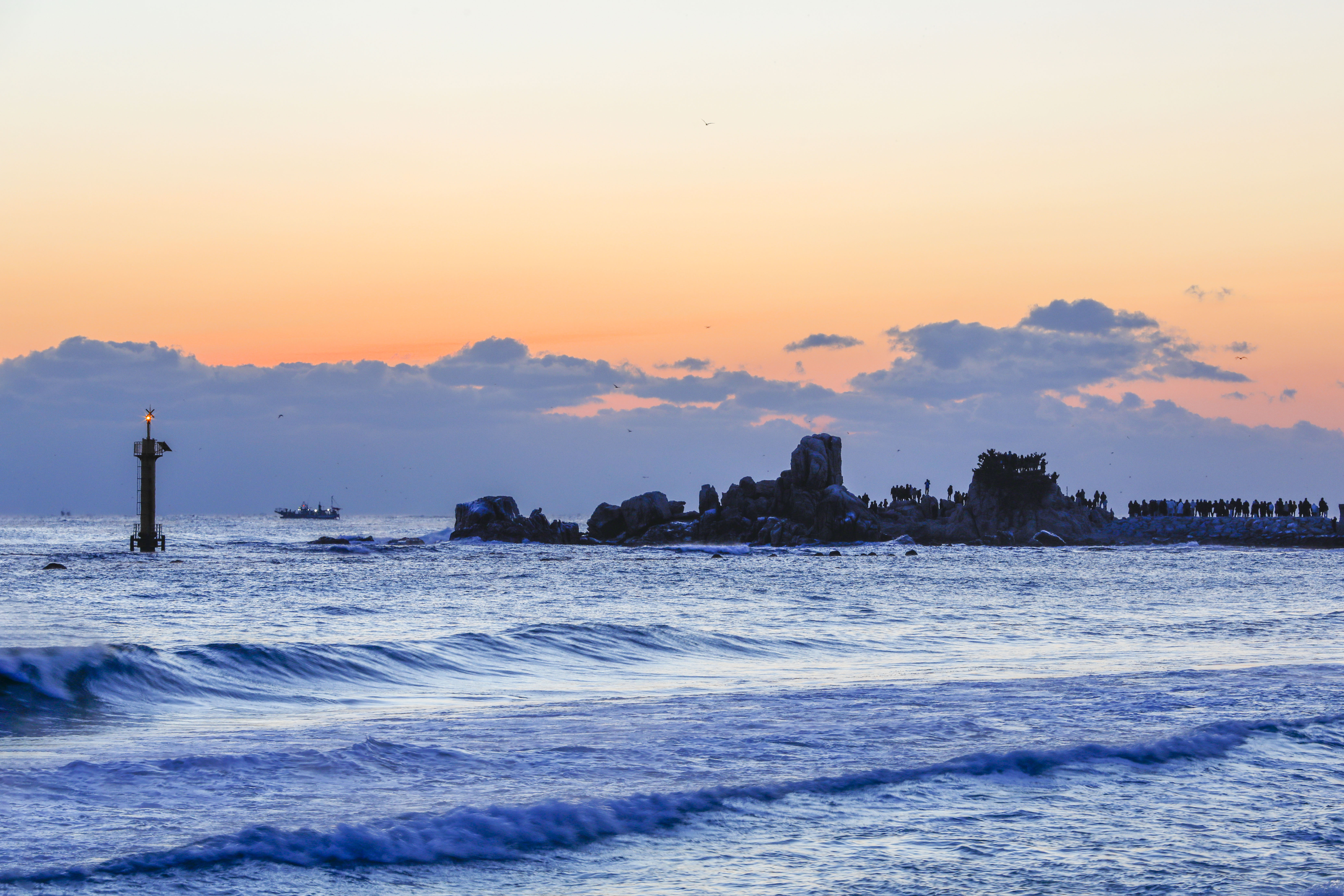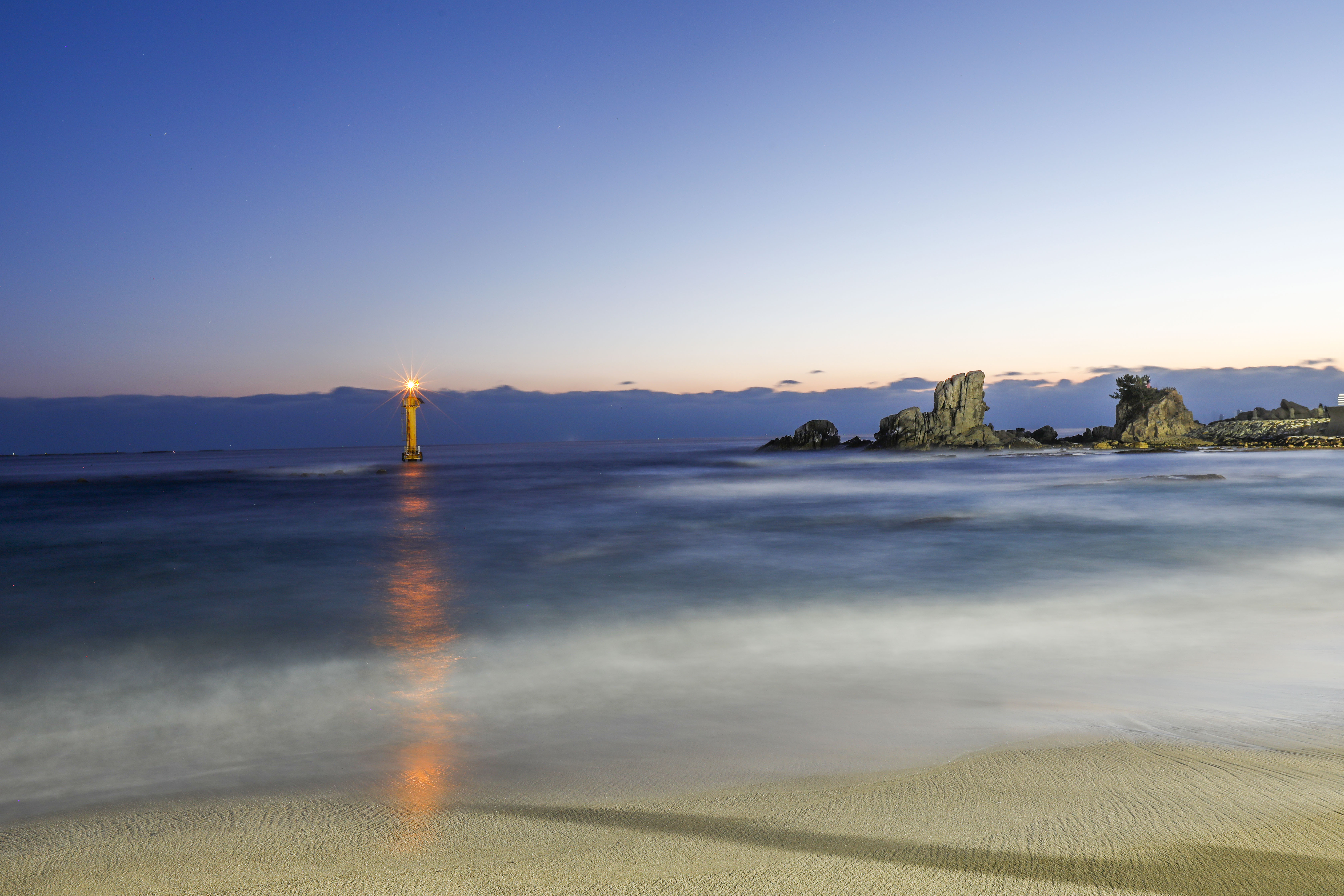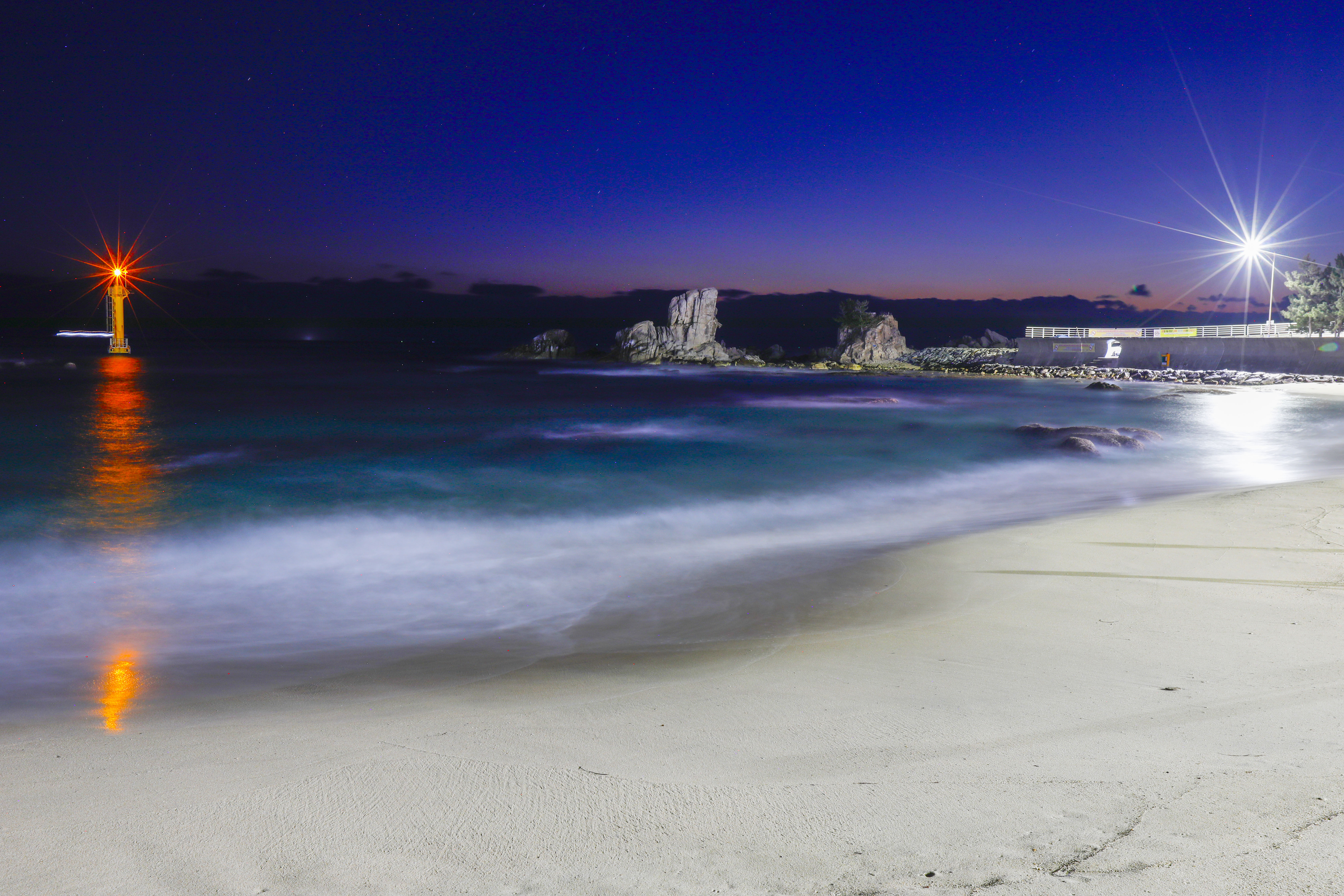 파도는 잔잔히 밀려왔다가 얇은 은빛 물결을 남기고 다시 물러나며 사진가들의 삼각대 앞에서 긴 호흡을 만들어 주었다.