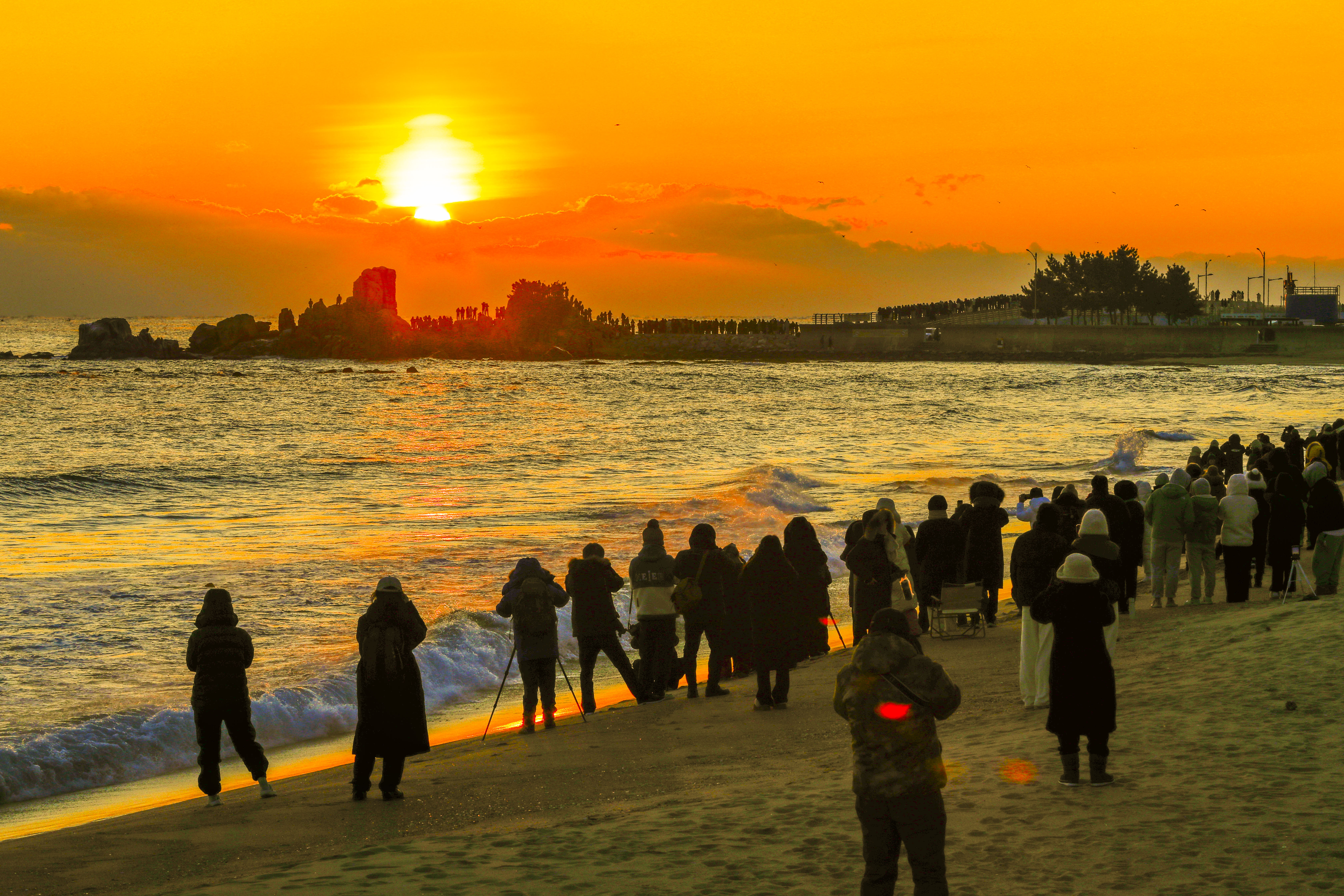 일출 순간, 해변 곳곳에서 연속 셔터음이 파도처럼 퍼져 나갔다.