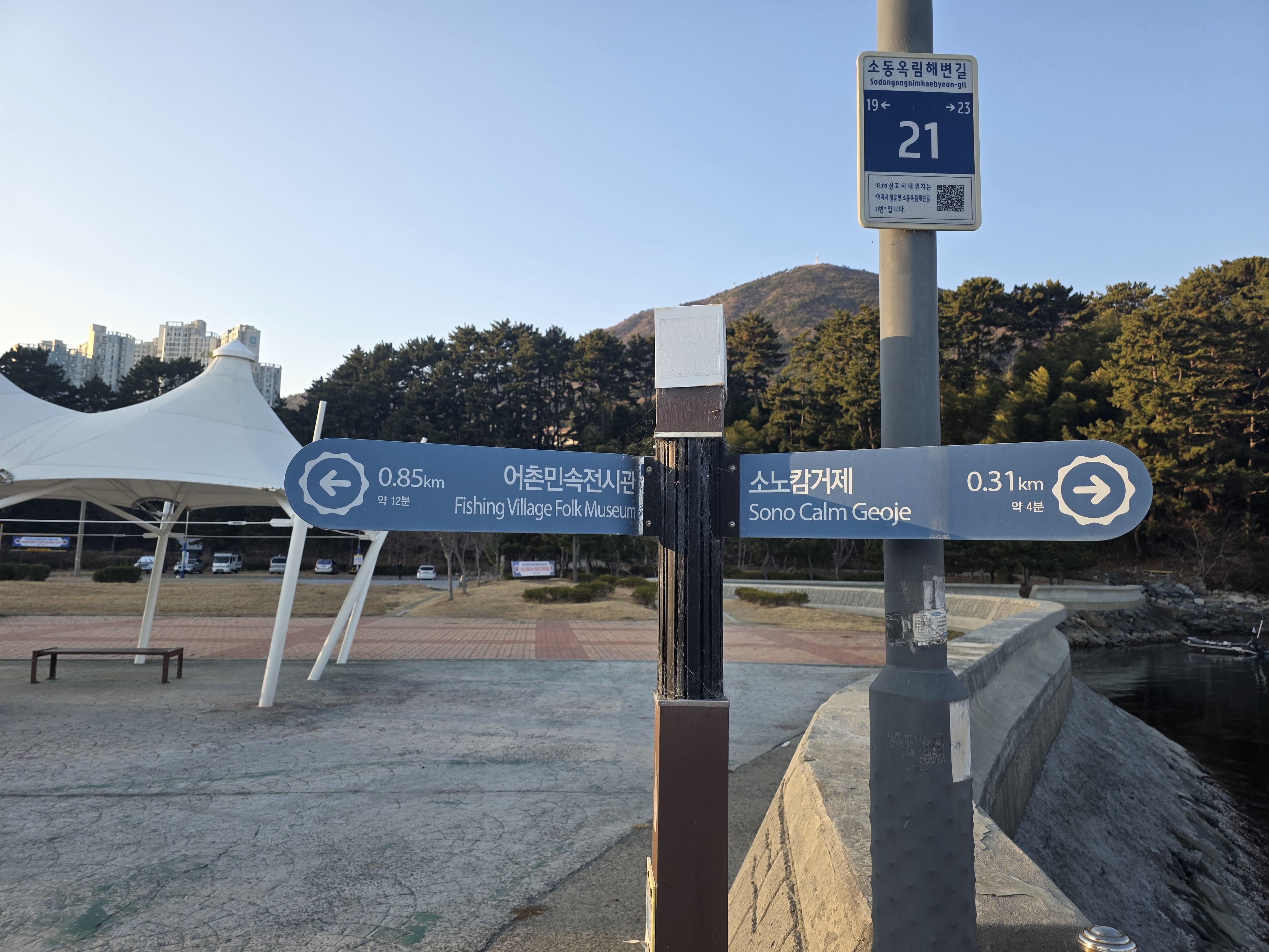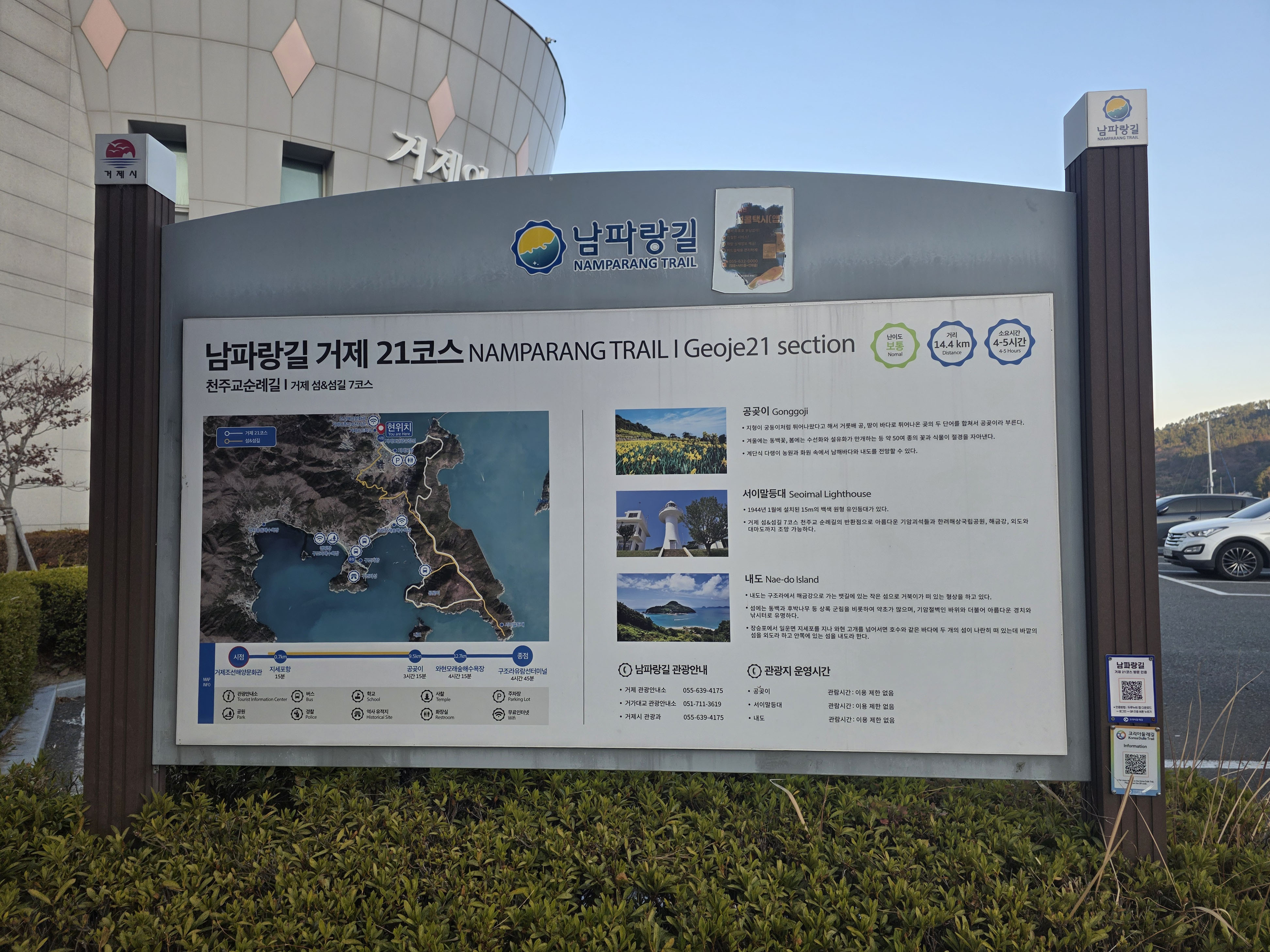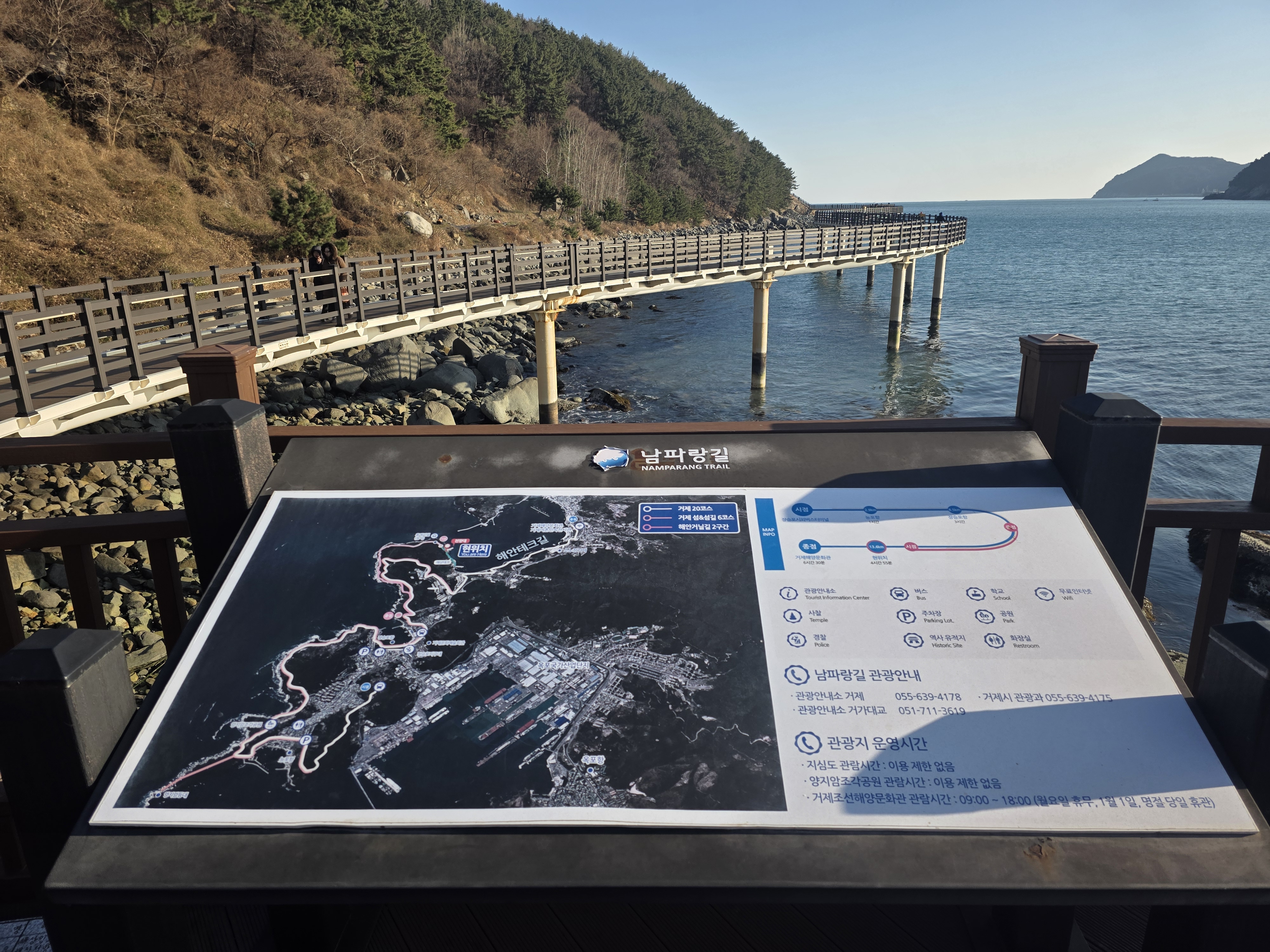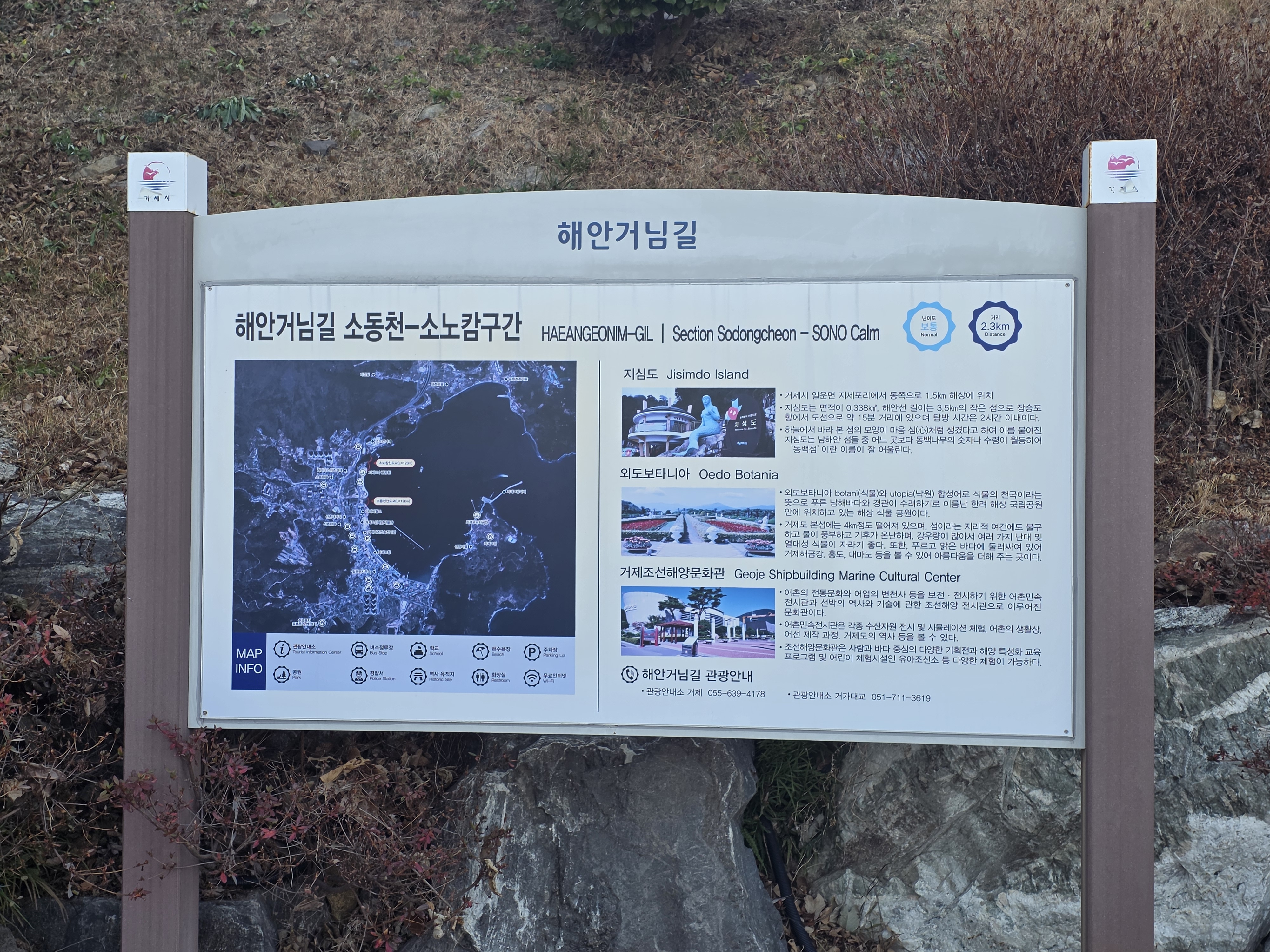 이번 여정은 장승포 시외버스터미널에서 도심을 지나 높이 180m의 능포 봉수대 언덕을 오르면 첫 오르막과 내리막은 몸을 풀어주고, 이후 길은 능포항 방향으로 완만하게 이어집니다..