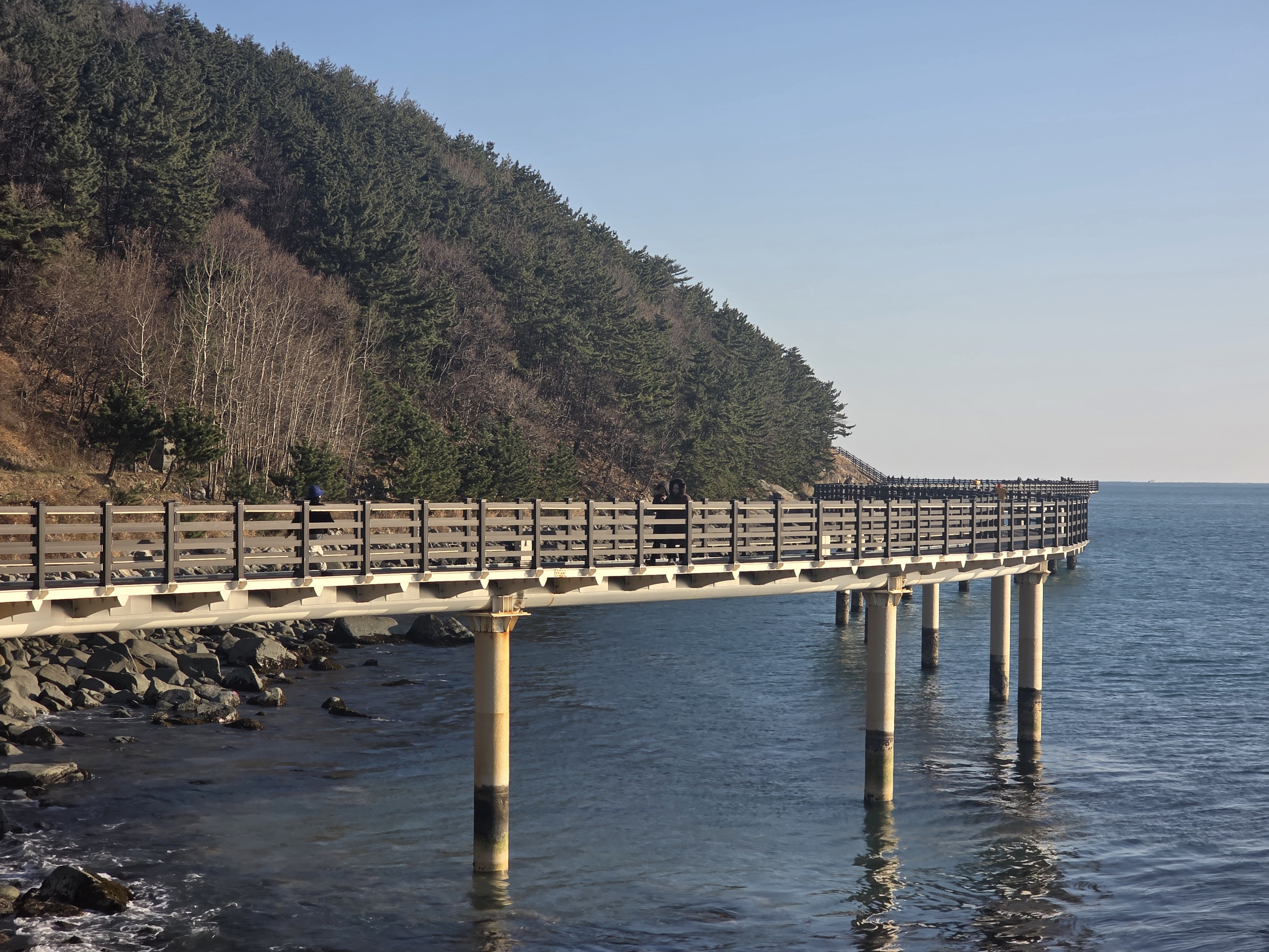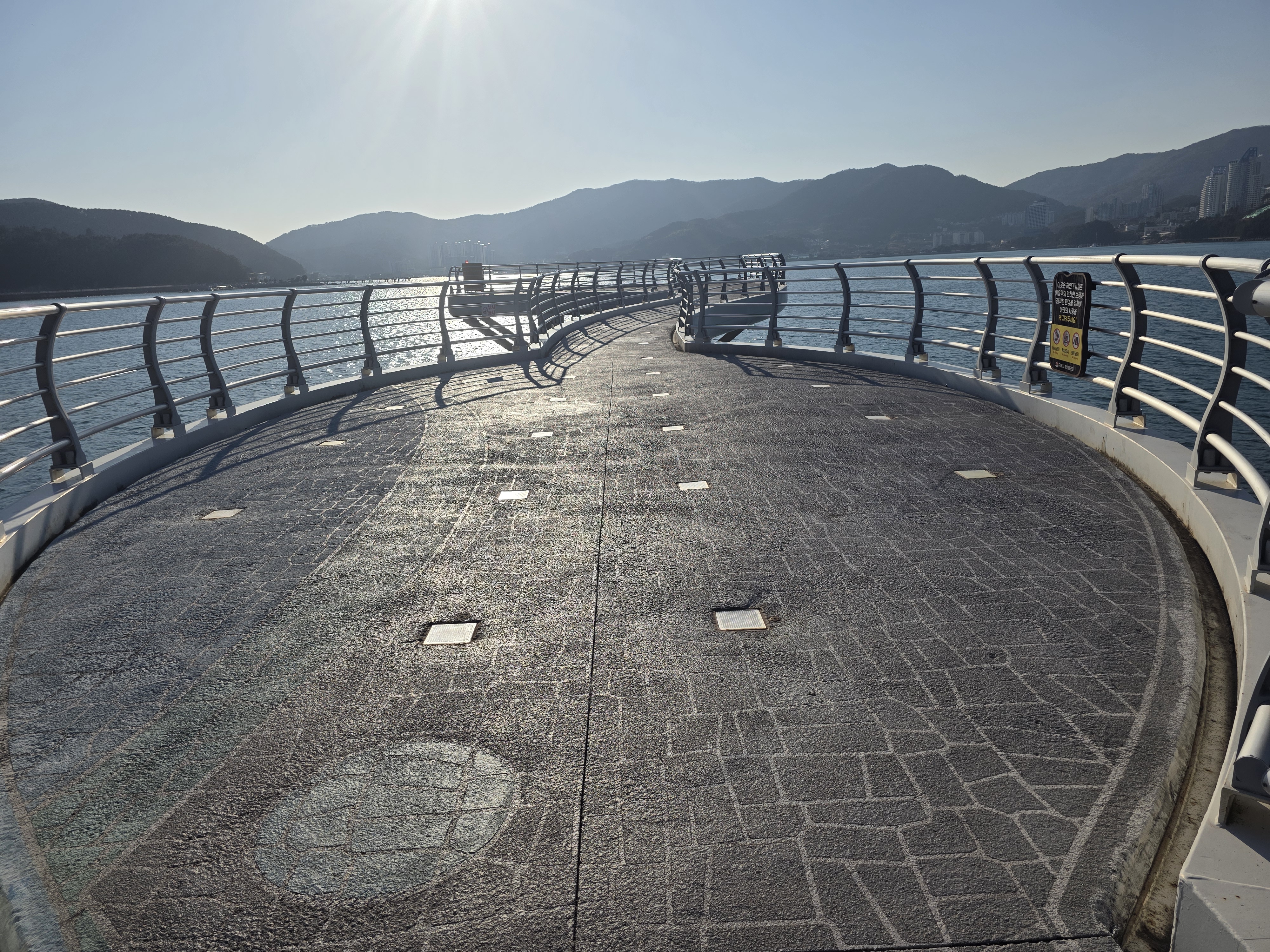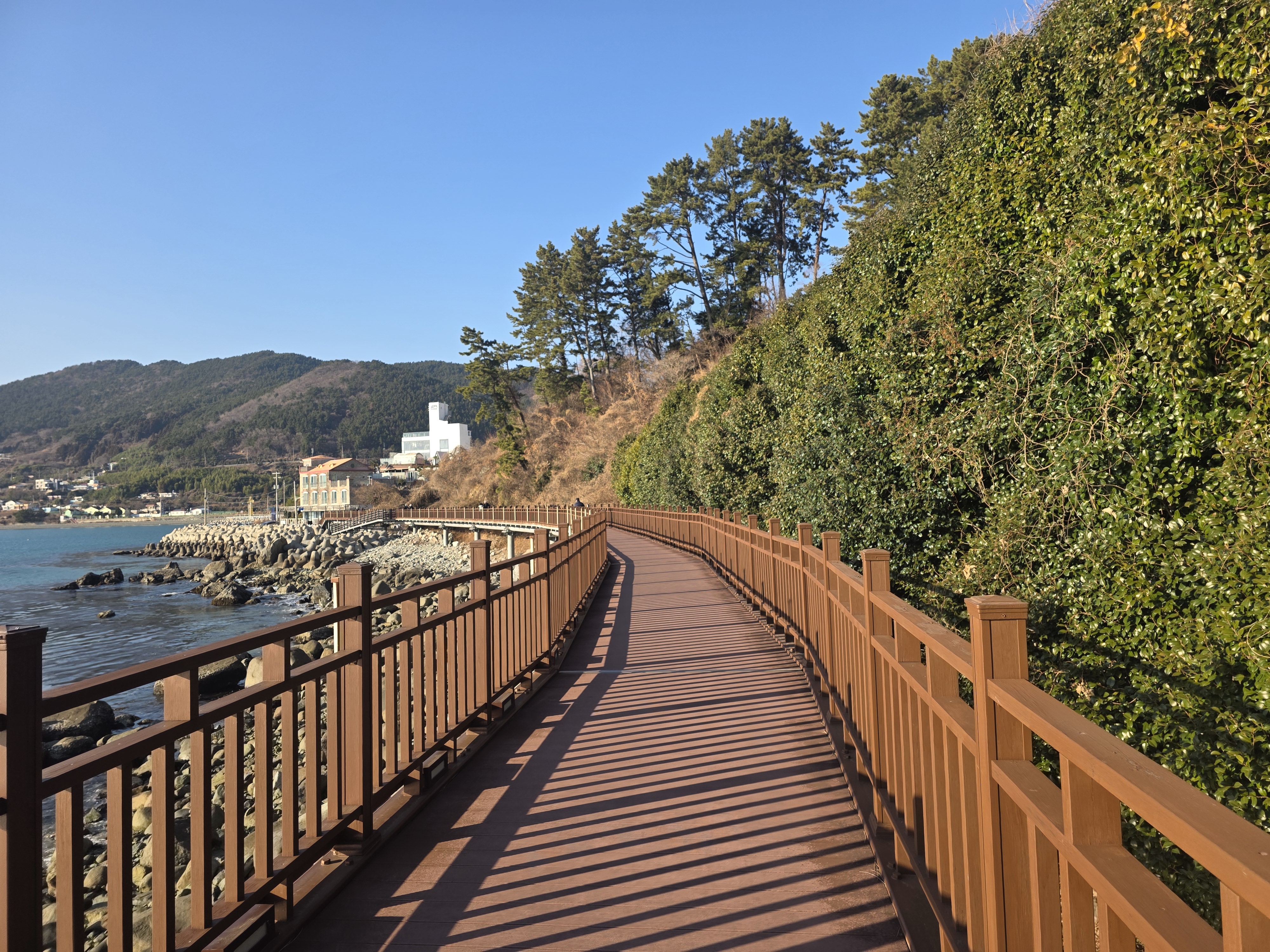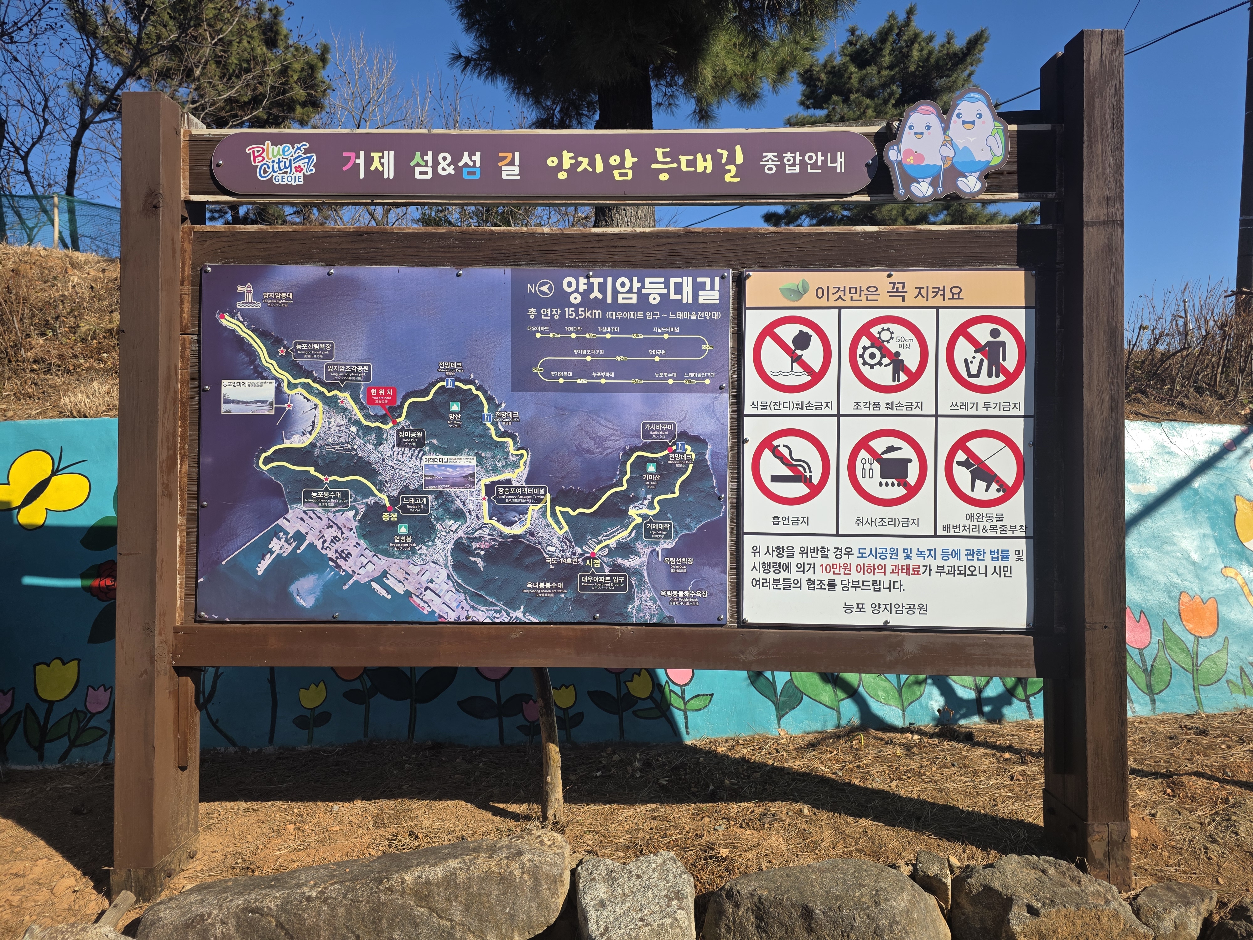 이후 길은 거제대학교 해안 길로 이어지며, 약 3km 정도를 걷다 보면 아름다운 무지개 해안 데크길이 모습을 드러냅니다.