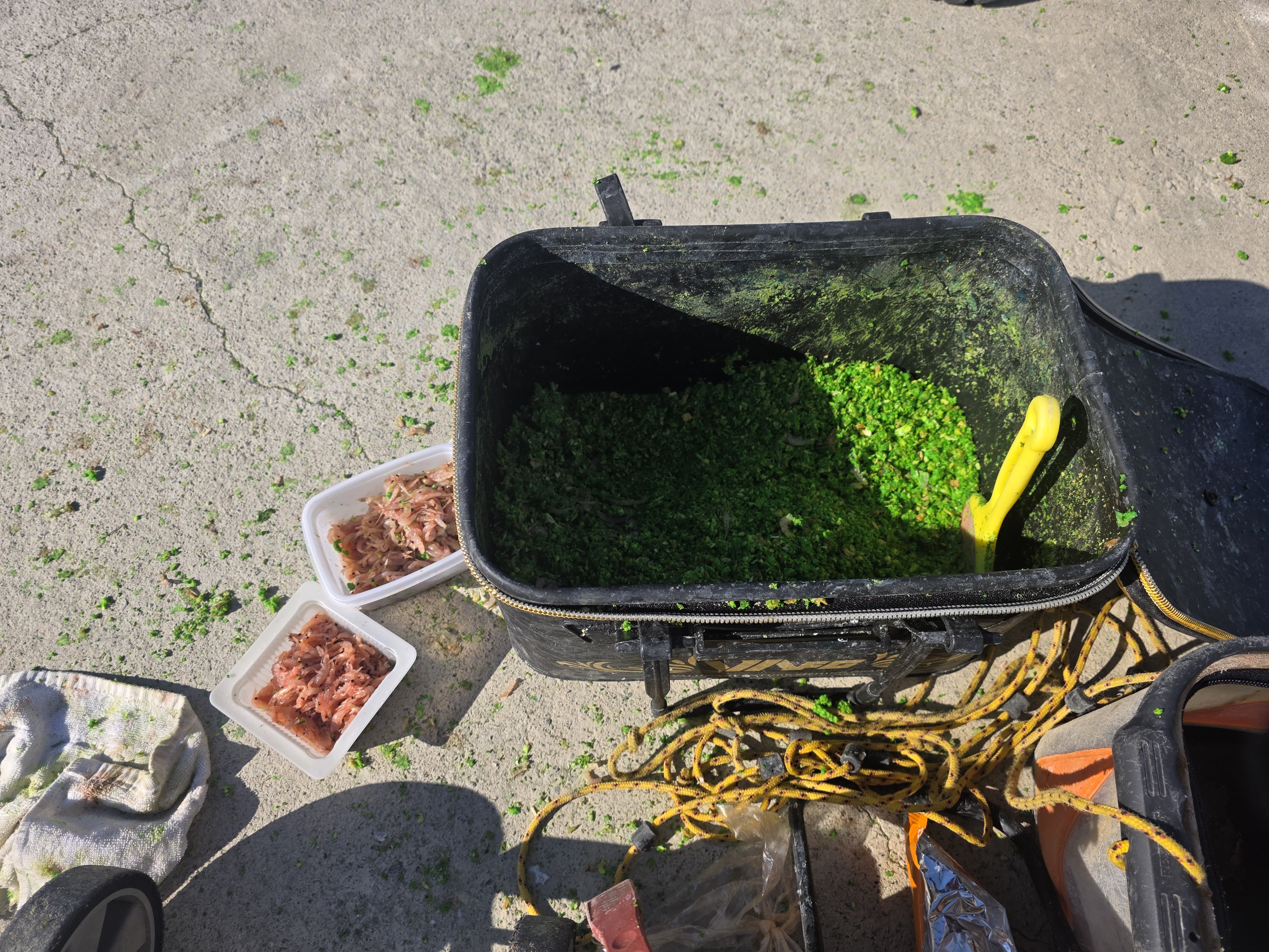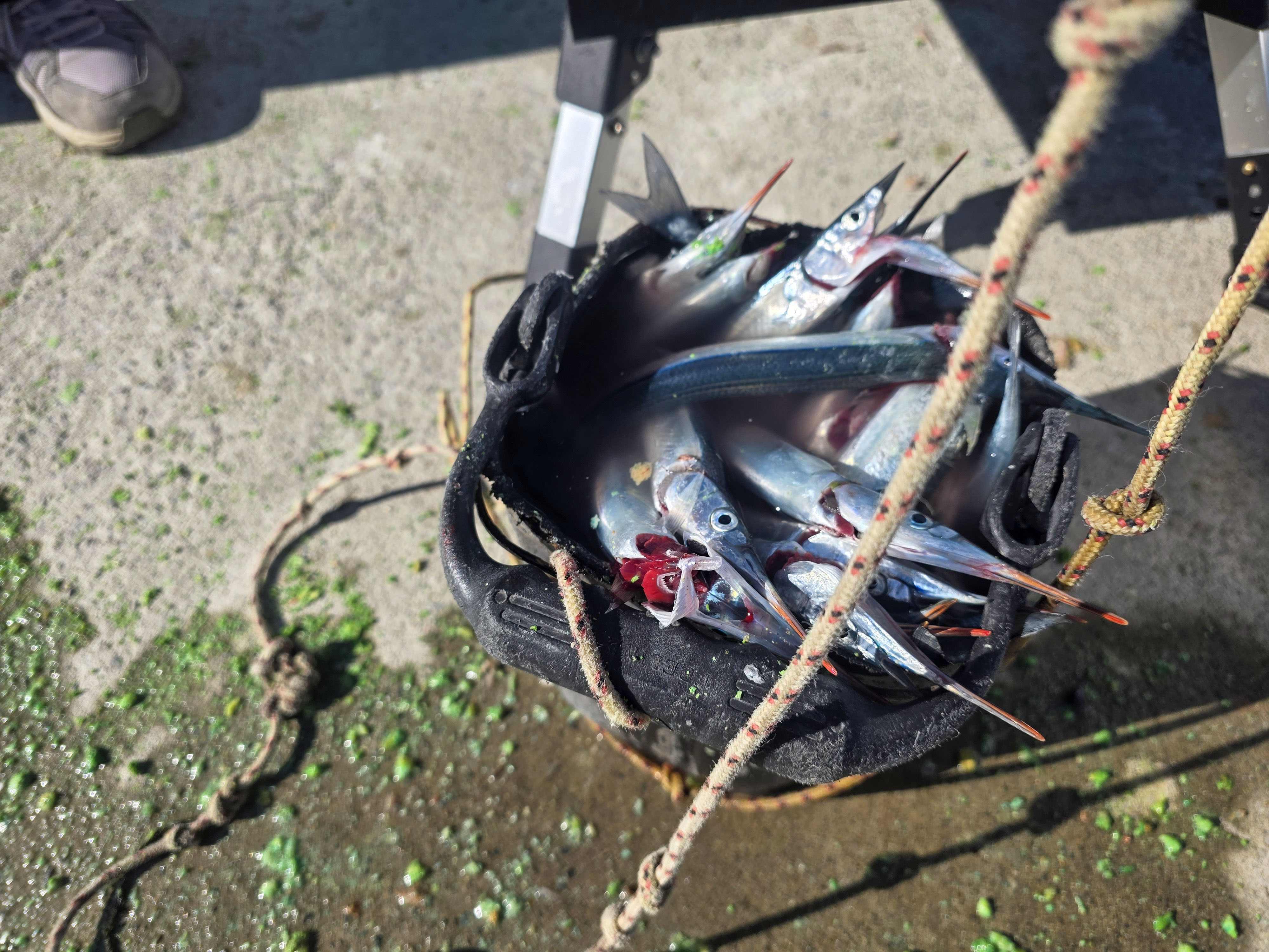학꽁치를 낚기 위해 새우와 빵가루를 사용하는 모습은 지나가는 이들의 발걸음을 멈추기에 충분합니다.