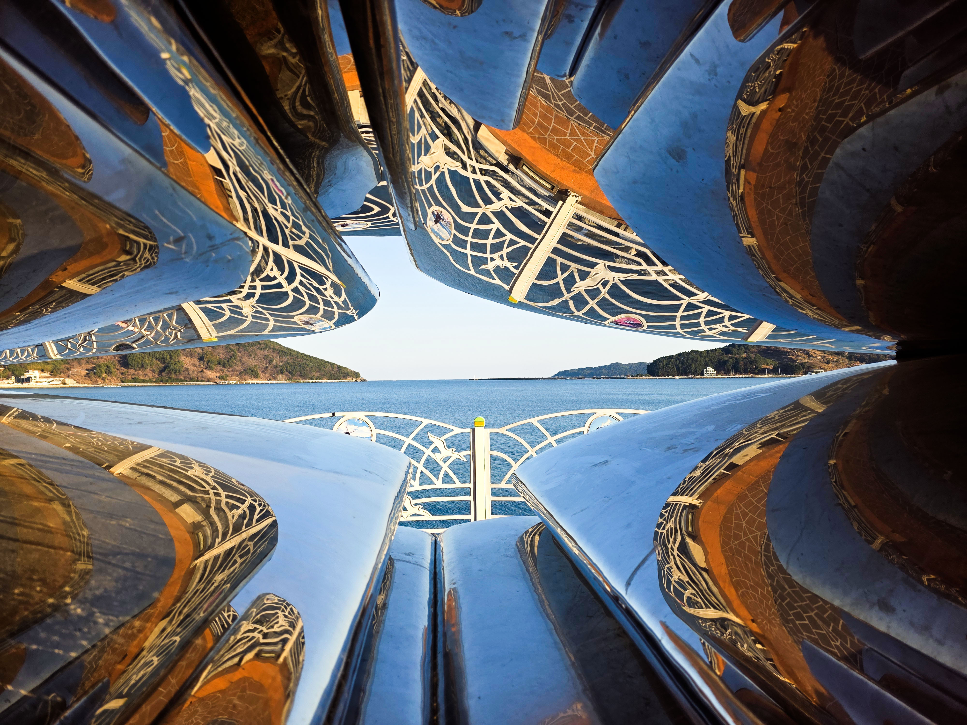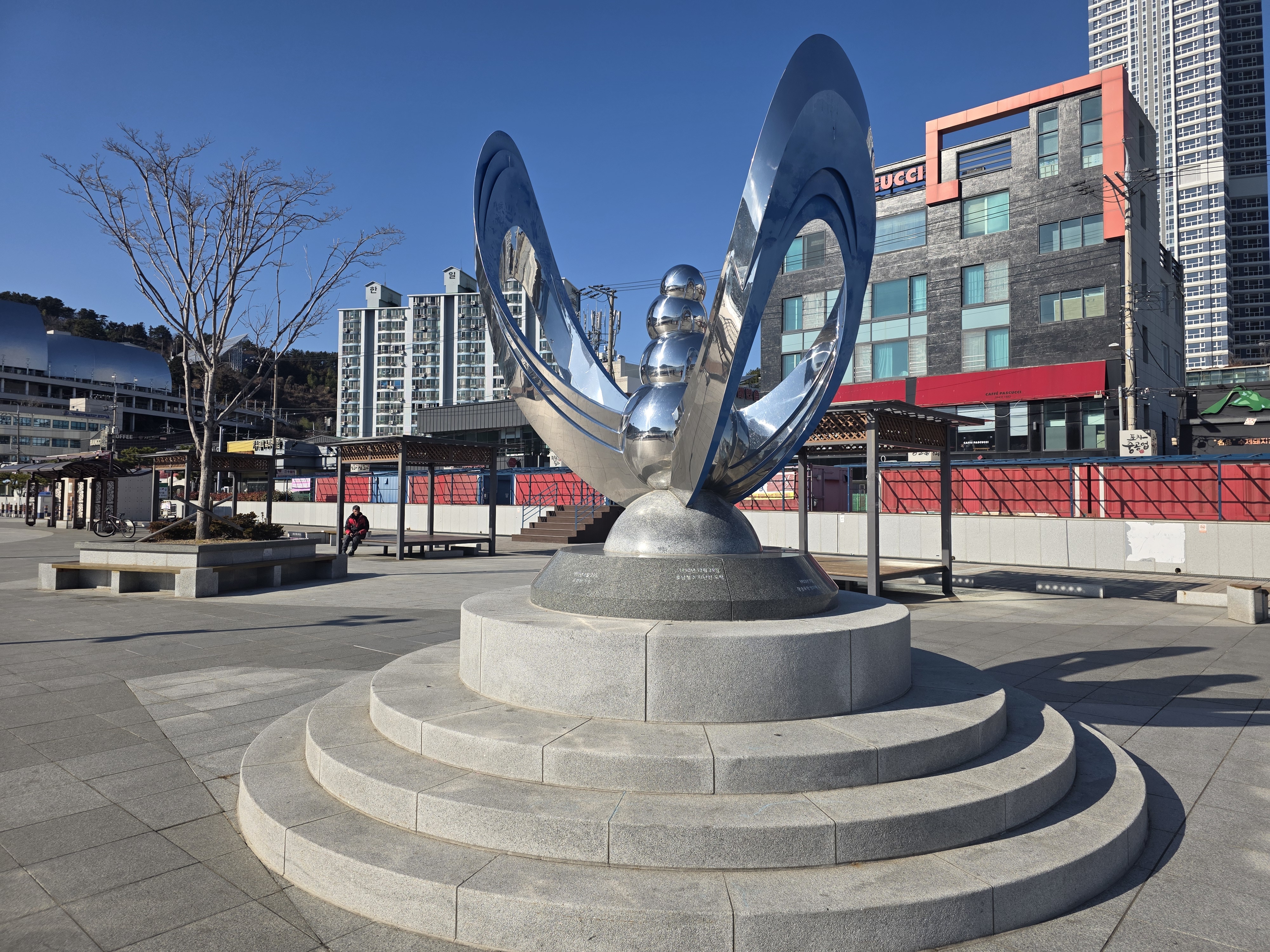 능포수변공원에 도착하면 탁트인 남해 바다가 한눈에 펼쳐지고, 공원 곳곳에는 다양한 조각 작품이 설치되어 여행자의 시선을 사로 잡습니다.