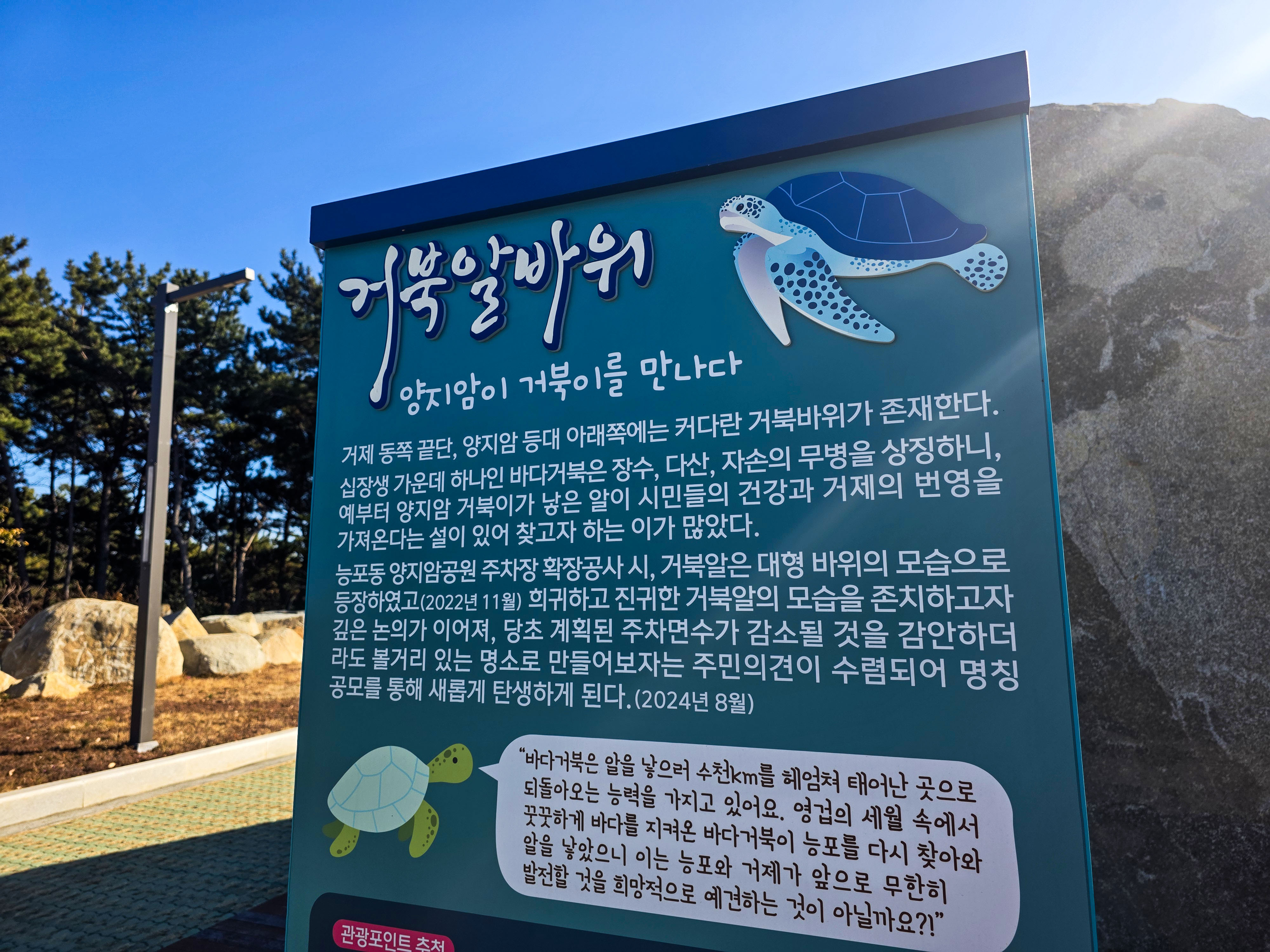 이 길은 양지 장미공원으로 이어지고, 공원 입구에는 ‘거북알 바위’라고 불리는 독특한 바위군이 나타나 시선을 끕니다.
