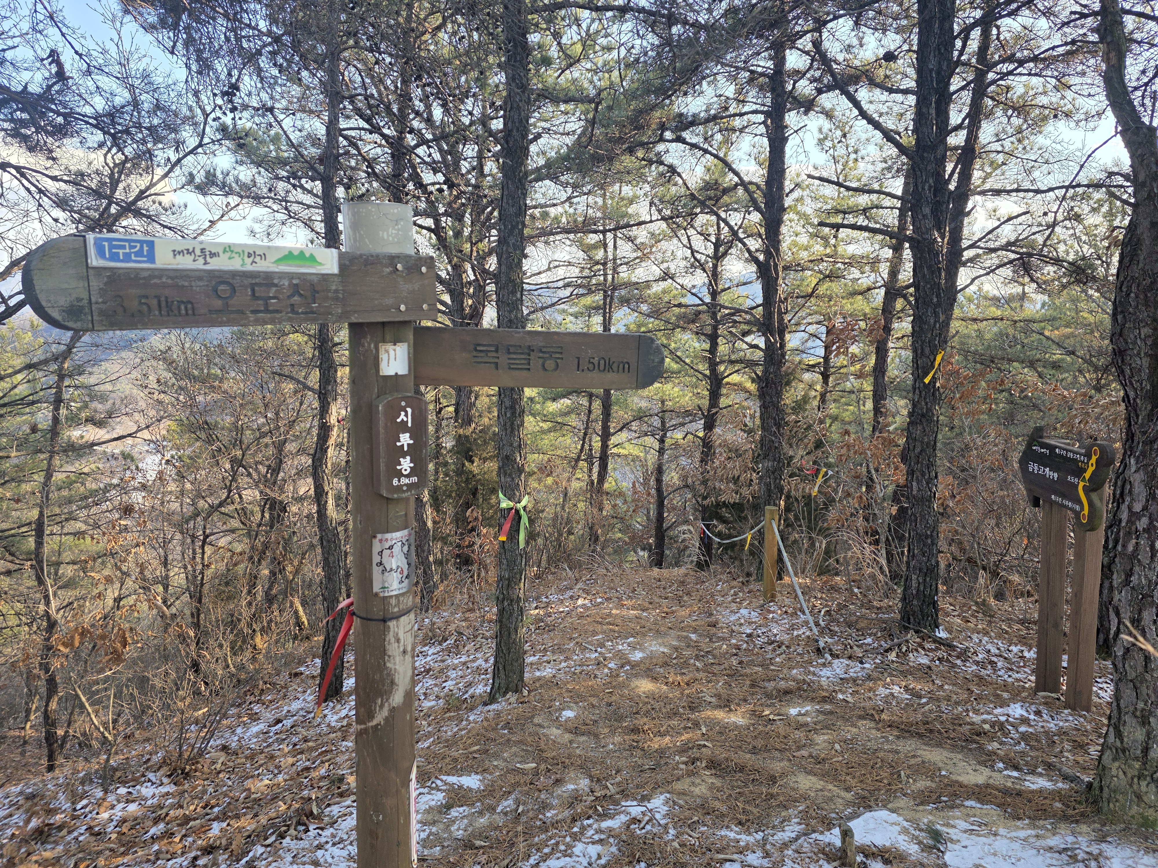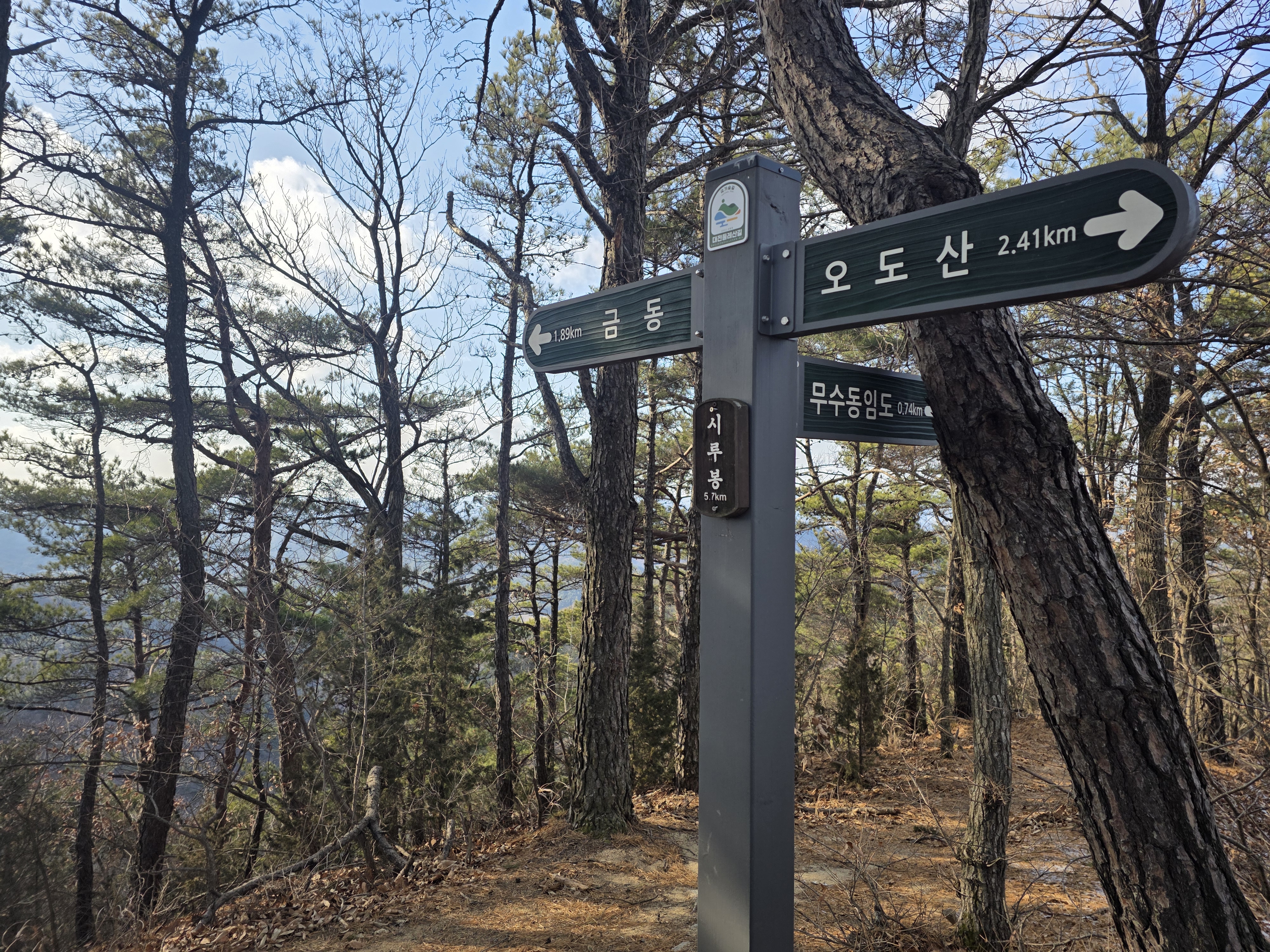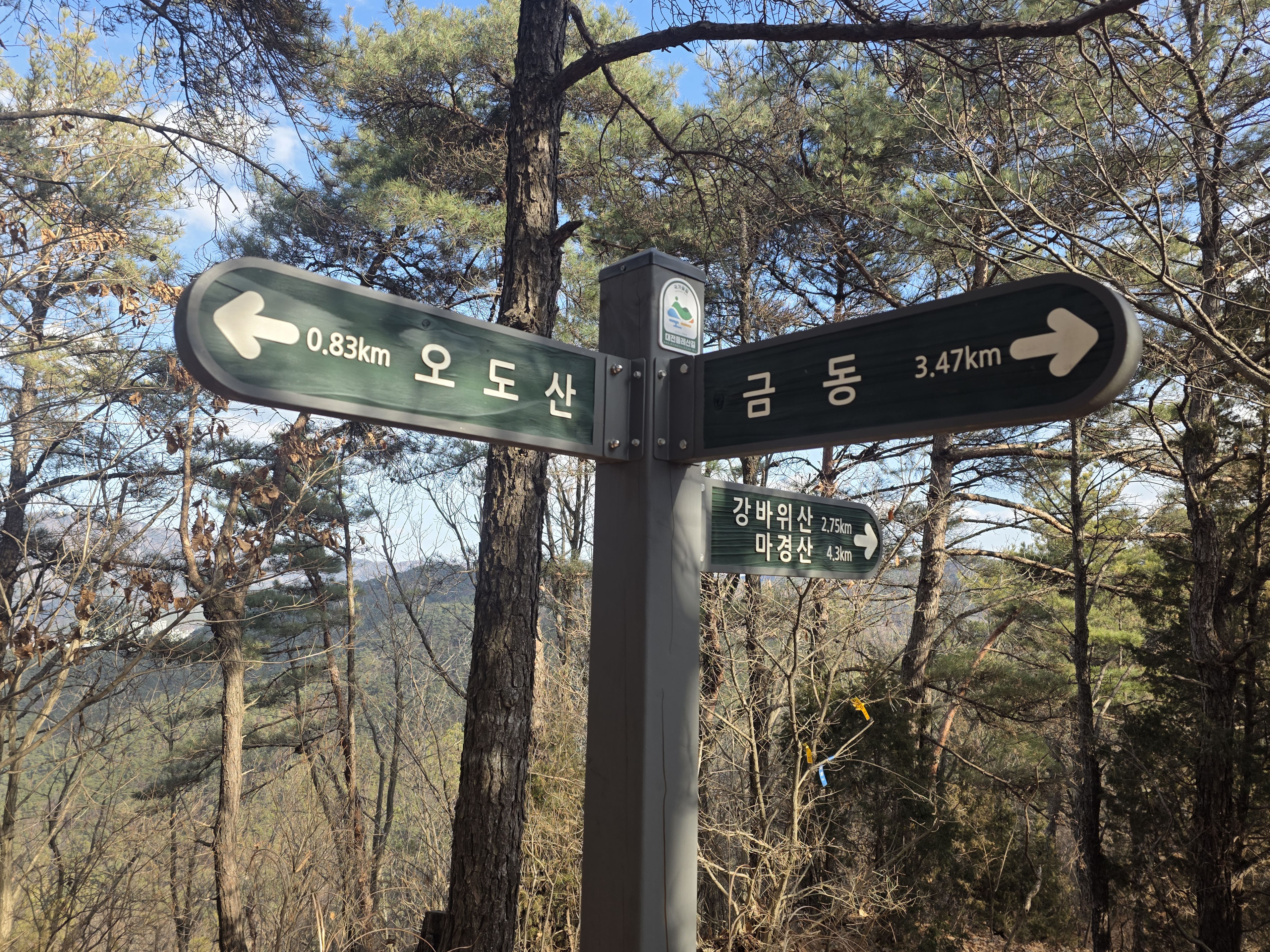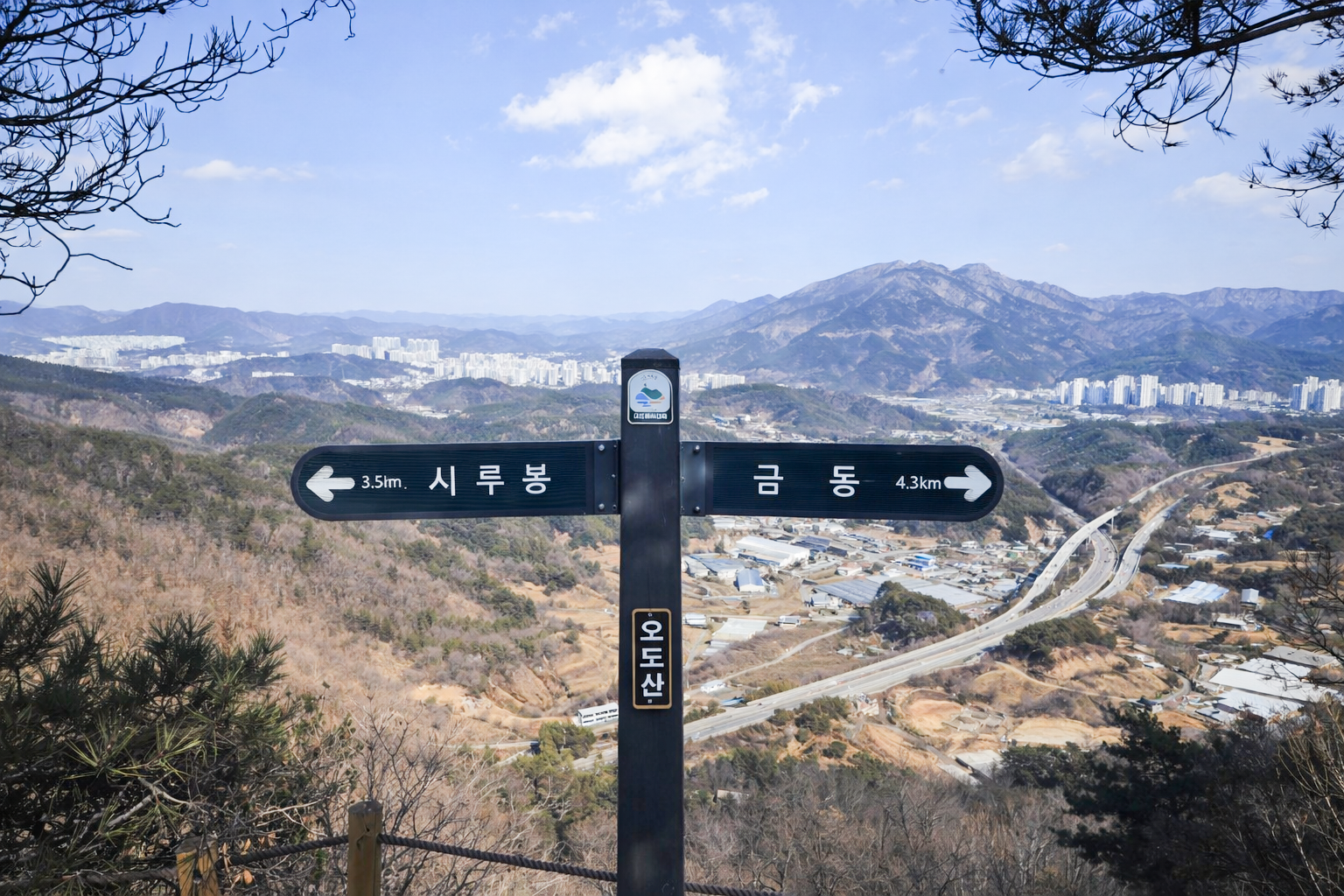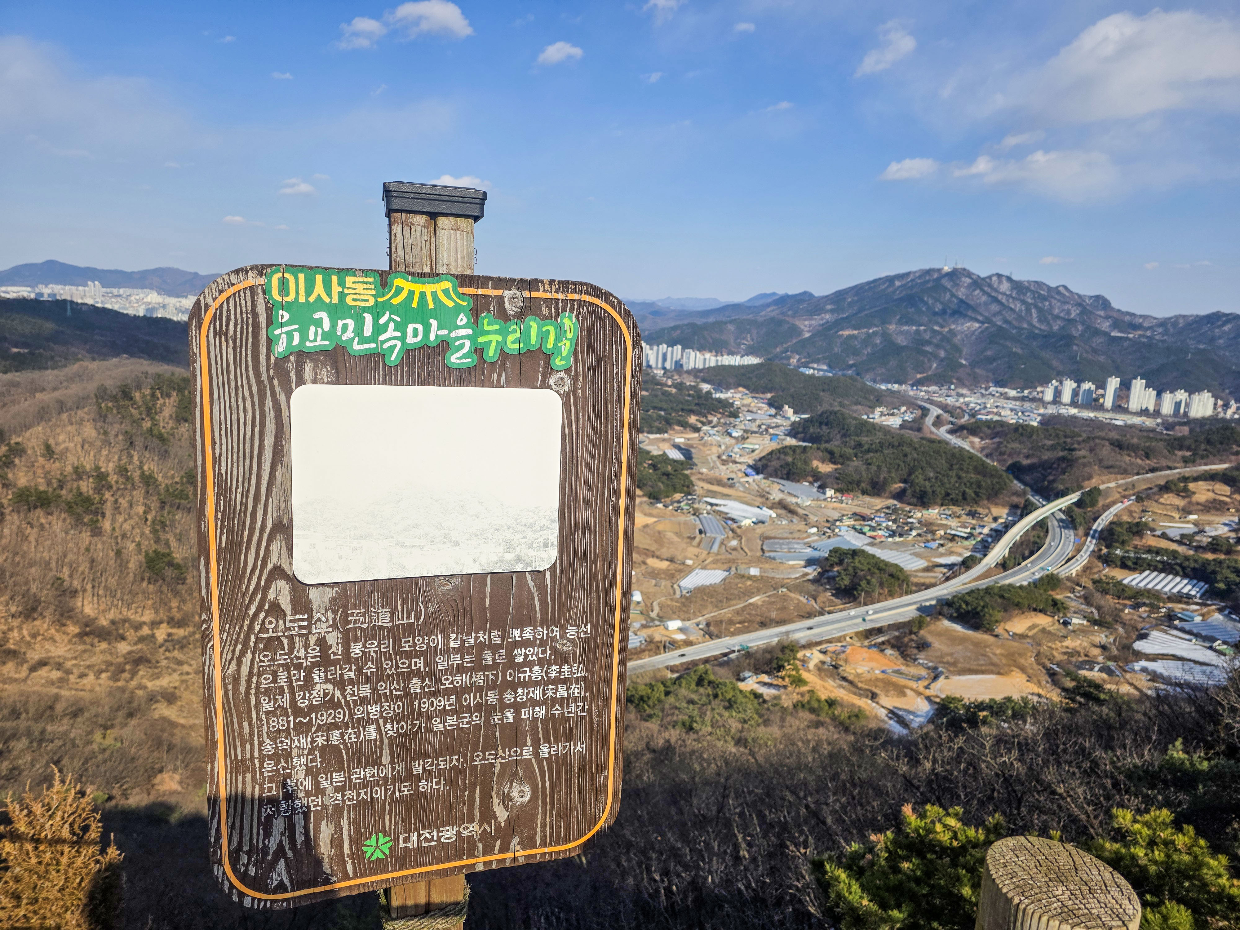 능선을 따라 이어지는 길은 점차 인공의 흔적이 사라지고 숲의 결이 깊어진다. 오도산 정상에서는 잠시 걸음을 멈추고 간식을 나누며 휴식을 취했다. 발아래로는 고속도로가 실처럼 이어지고, 그 위에서는 마치 깊은 산중에서 만찬을 즐기는 듯한 여유가 흐른다. 오도산은 예로부터 마을을 지키는 수호산으로 여겨졌으며, 지금도 조용히 대전 남부의 능선을 지키고 서 있다.