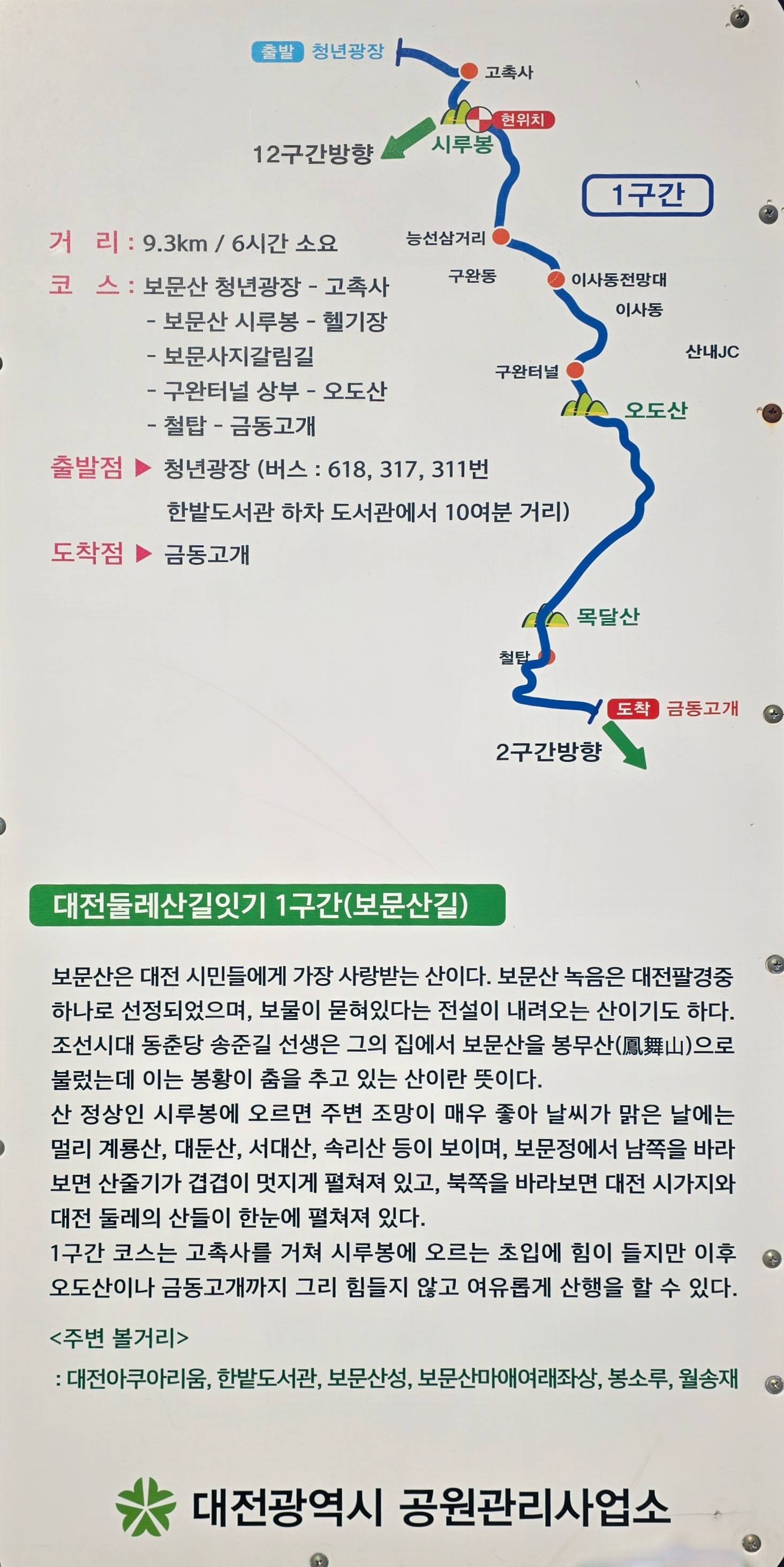 도심 가까이에서 이만한 거리와 깊은 자연을 동시에 만날 수 있다는 점에서, 대전둘레산길 1구간은 사계절 내내 사랑받을 만한 명품 코스임을 다시 한 번 확인했다.