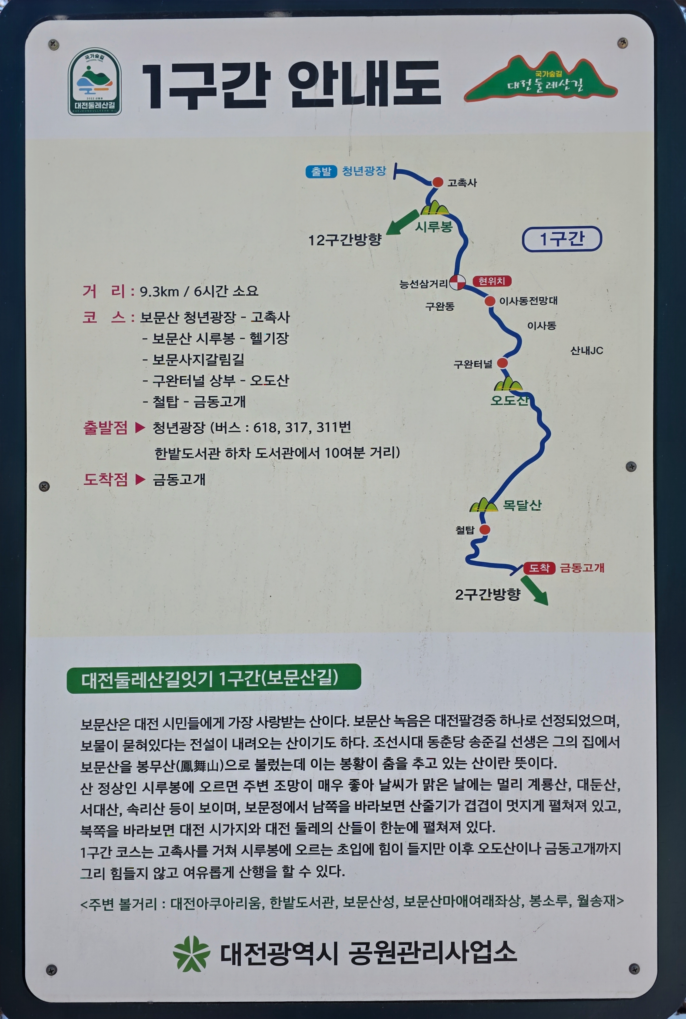 오늘 걸어온길은 대전둘레산길 1구간은 보문산 청년광장 →고척사- 보문산 시루봉 → 헬기장 → 보문사지 갈림길 → 이사동 전망대 - 구완터널 상부 → 오도산 → 쉼터 → 금동고개로 이어지며, 총 약 9.3km, 약 5시간이 소요되는 숲길 코스다.