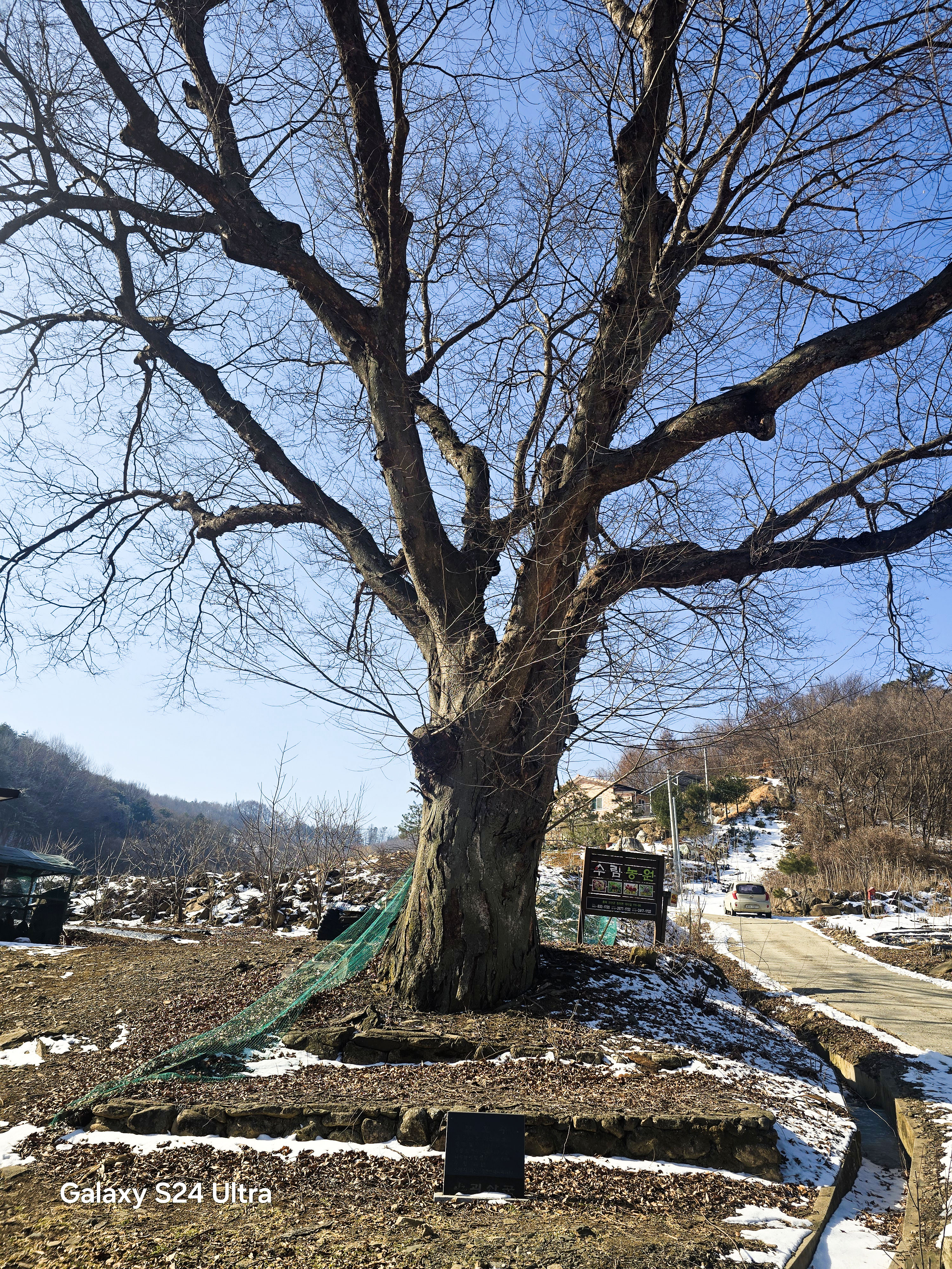 300년 보호수롤 지정되고 있다는 표지석을 바라보며 펜션 단지를 지난다.