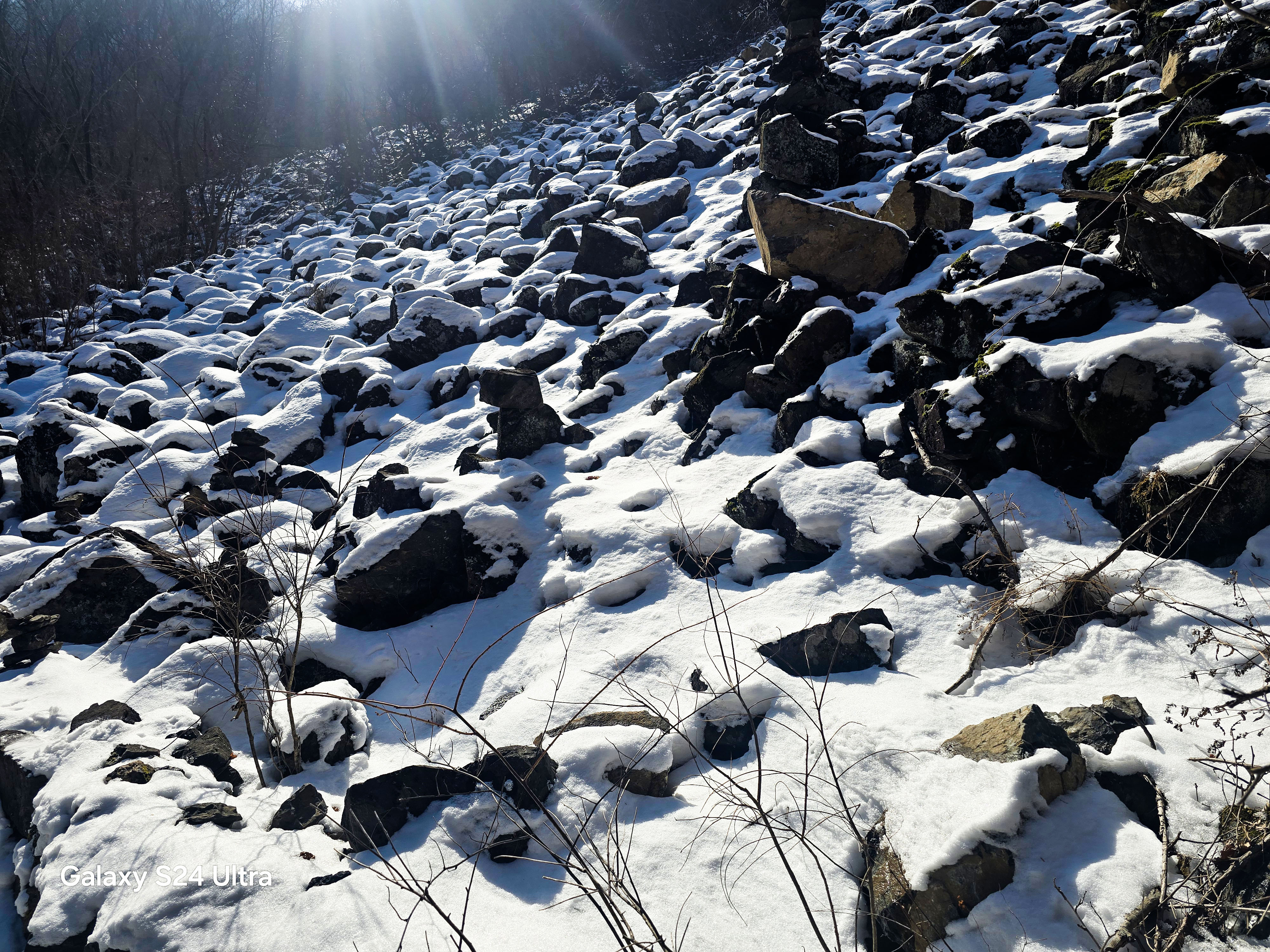 작고 큰 돌덩이에 소복히 쌓인 눈덩이가 돌무리가 흐르다 멈춘 듯한 모습으로 쌓여있었다.