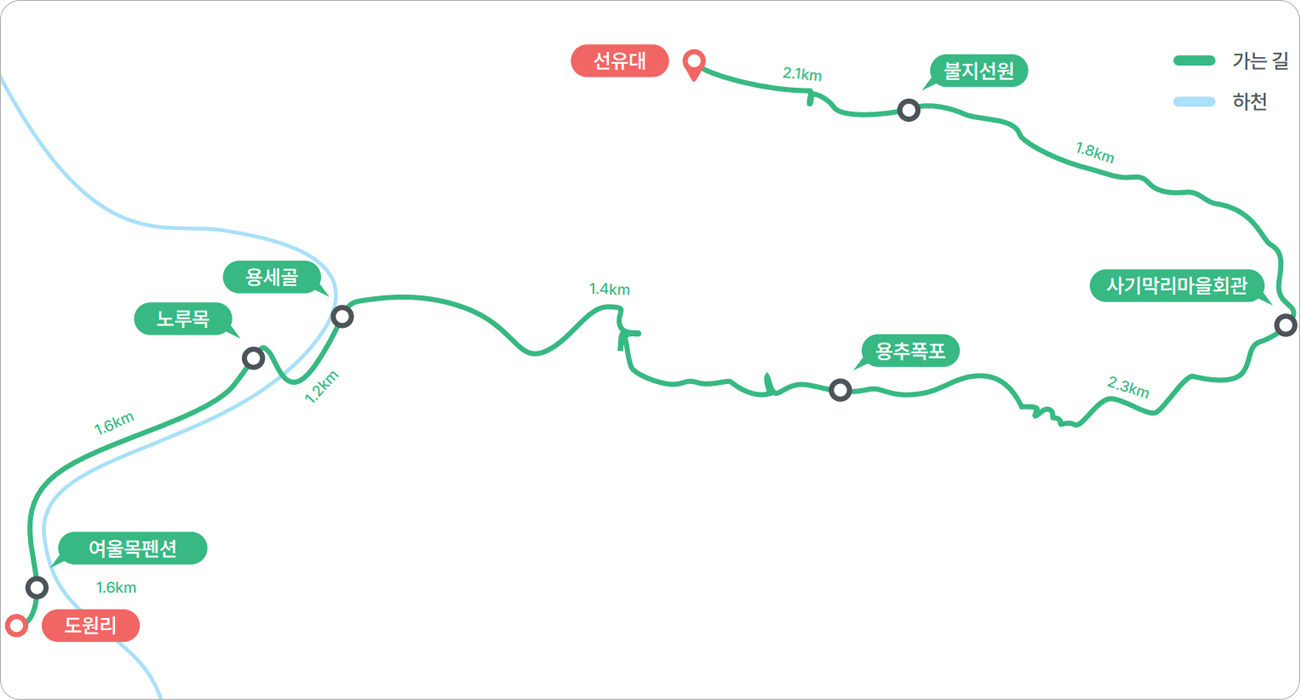 도원리 시작점에서 출발하면 한티마을, 기세 좋은 바위절벽 밑을 낭랑한 여울의 물소리와 함께 걷는 낭골절벽길, 노루목 데크길을 거쳐, 용추계곡의 호젓함을 느낄 수 있는 숲길, 용이 승천했다는 전설이 어린 시원한 용추폭포를 만난다. 다시 길은 이어져 고려시대 사기를 구웠다는 사기막리를 거쳐서 곰넘이재를 넘으면 불지선원을 거쳐 운교리에 이르러 구간이 끝난다.