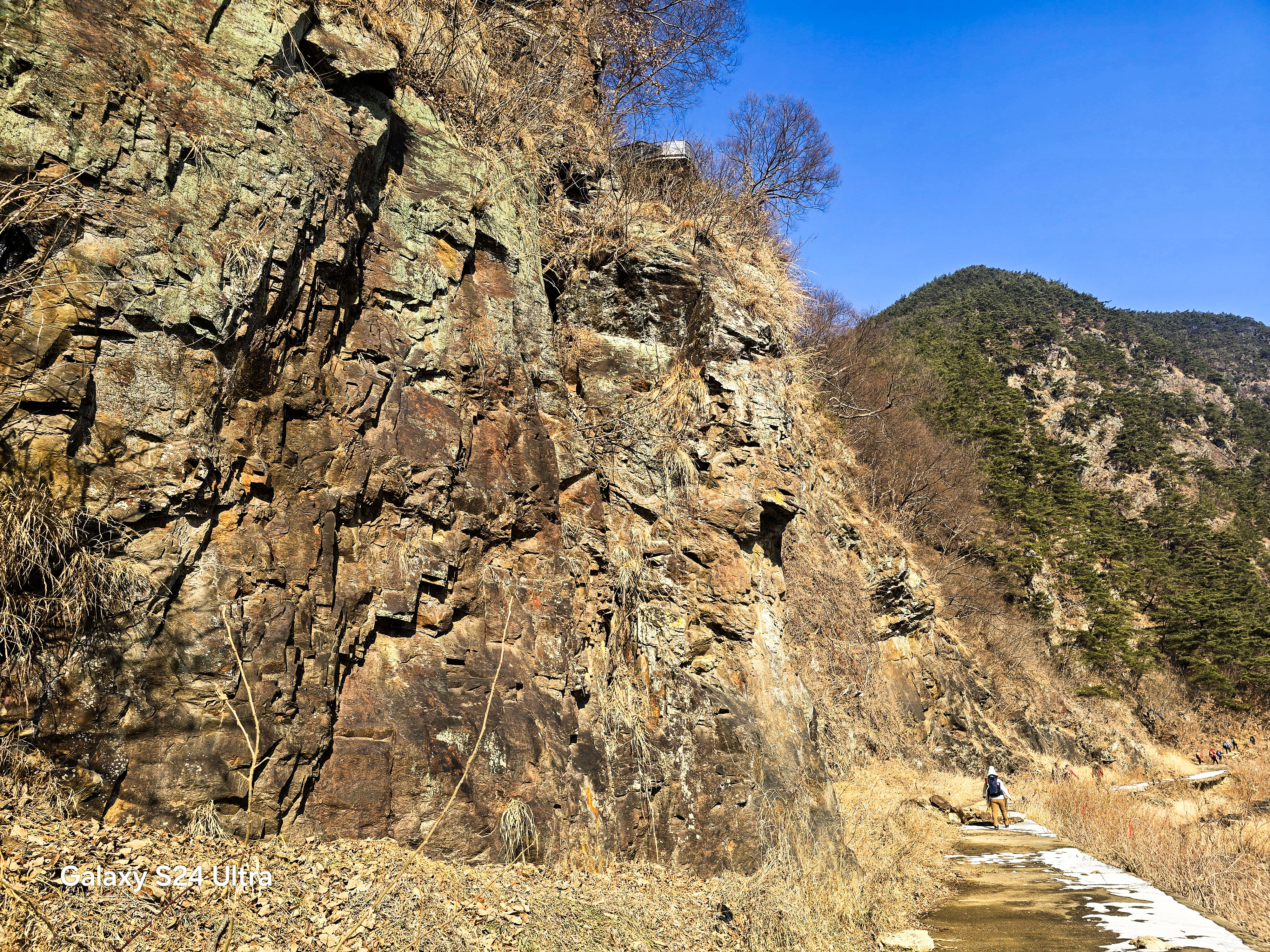 포장길을 가다가 거친 돌길이 이어지고 낭골절벽의 웅장한 수직벽을 지나간다.