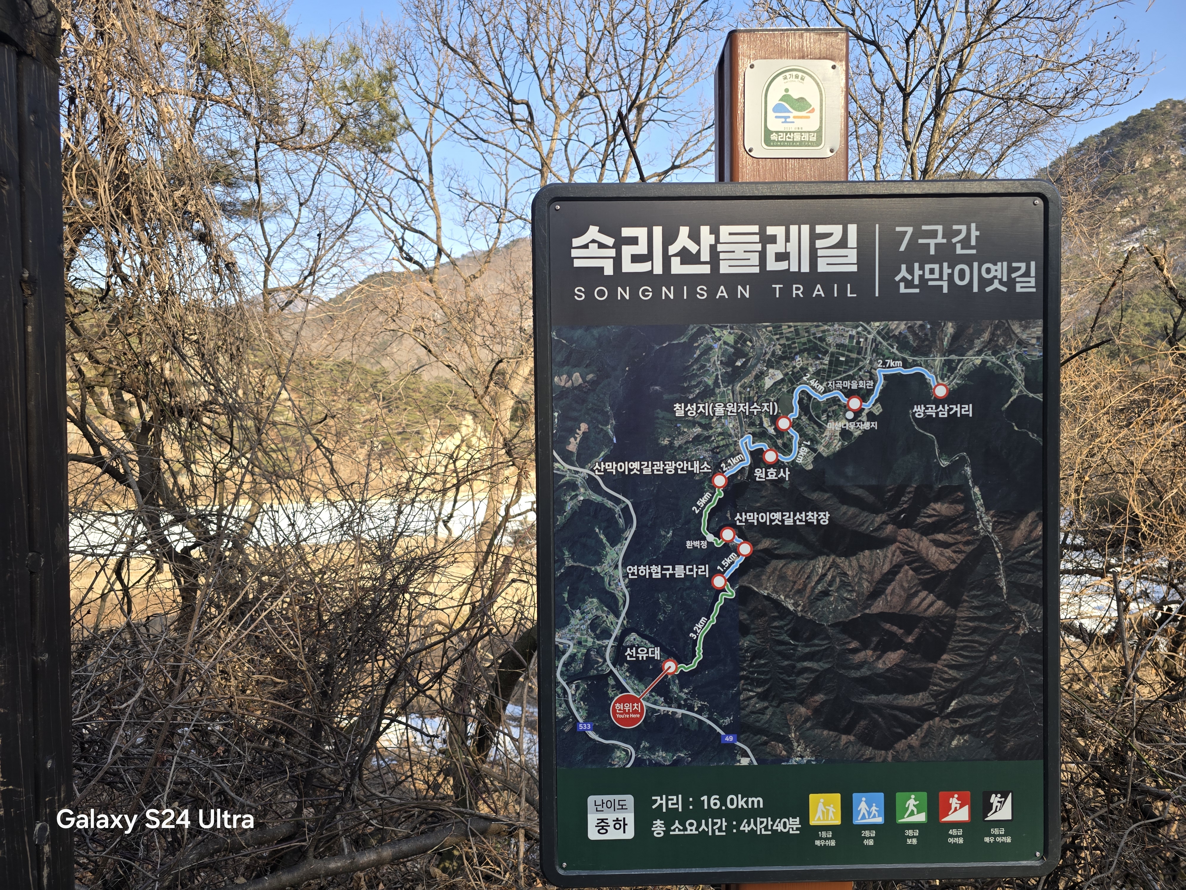 운교리 마을회관 앞을 지나 선유대 민속펜션 앞에 도착하자, 길 옆에 서 있는 속리산 둘레길 7구간 안내판이 나타났다.