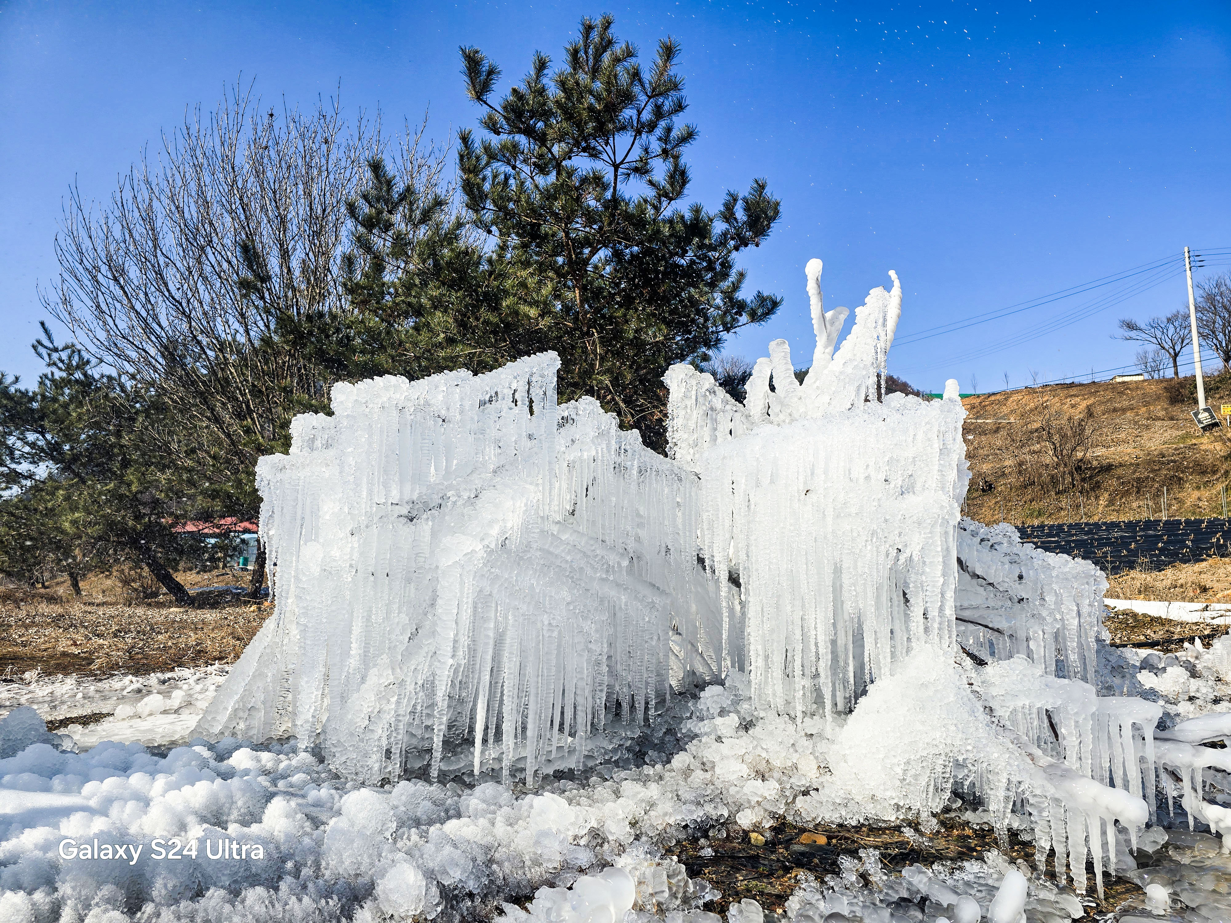 펜션 단지 앞에 지나고 마을어귀를 지나는되 물호수에서 새어나온 물줄기가 얼음이되어 걸어온길을 위로하듯 눈길을 사로 잡는다.