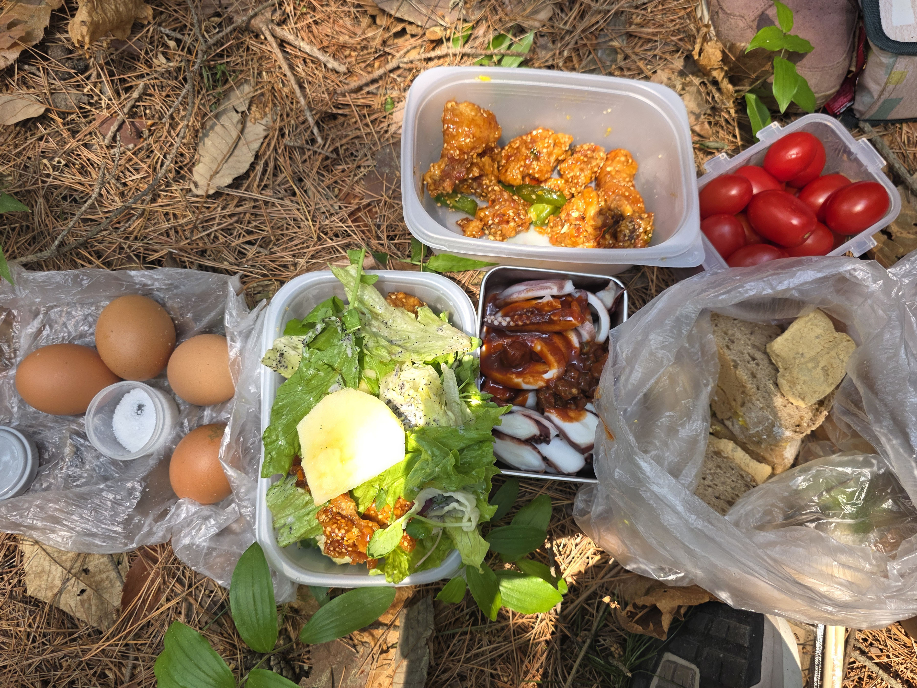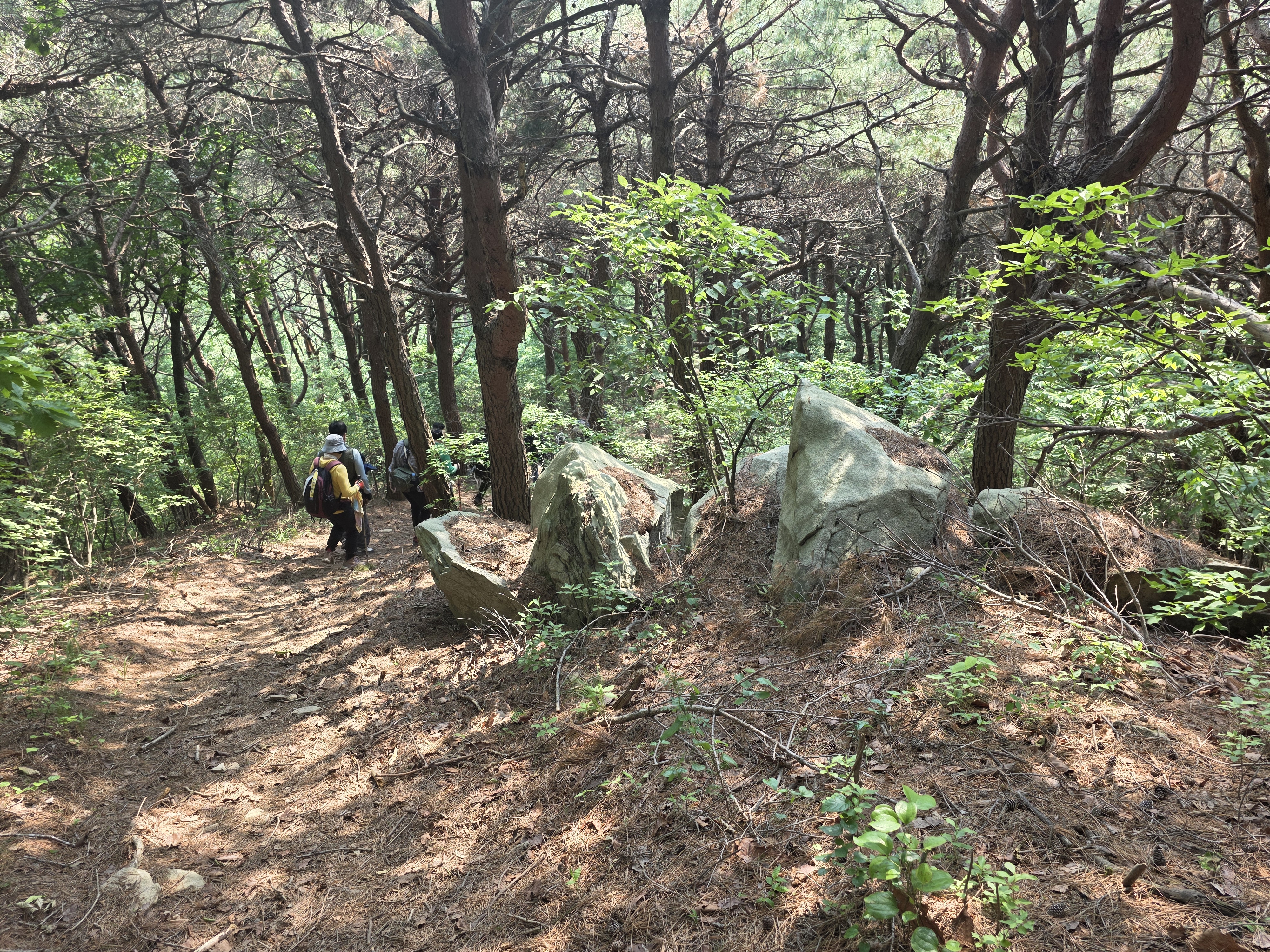 일락사를 지나 일락사지 터를 스쳐간 뒤 다시 산길로 접어든다. 작은 능선 고개 위에 도착한 탐방단은 잠시 휴식을 취하며, 각자가 준비한 간식을 나누는 즉석 뷔페를 펼쳤다. 김밥, 떡, 과일, 막걸리 한 잔까지 더해지니 숲 속 잔치가 따로 없었다.
