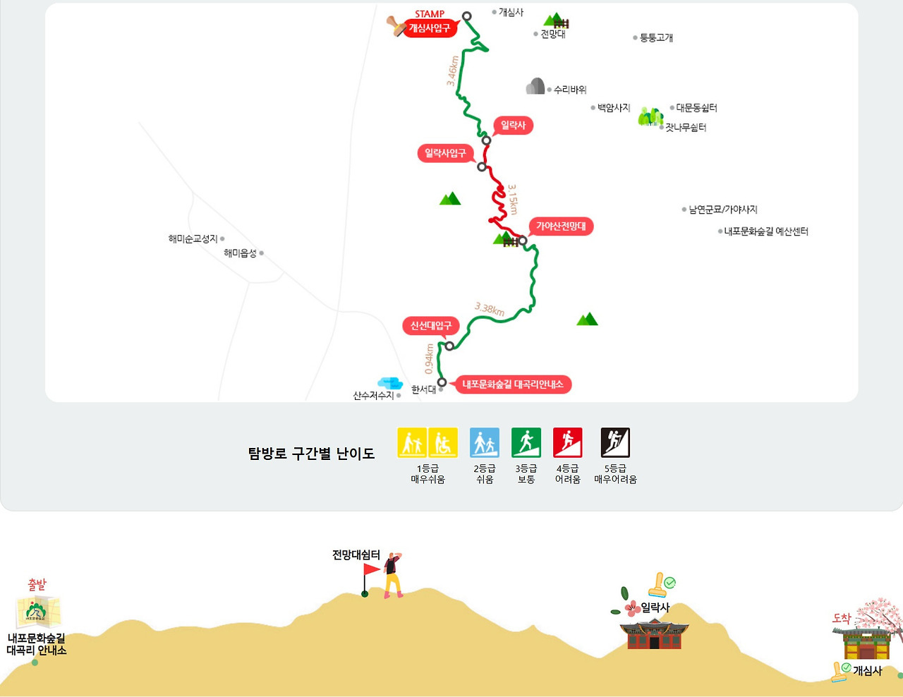 서산시 해미면 대곡리에서 출발하여 일락사를 거쳐 개심사까지 이어지는 코스이다. 한서대 입구에서 간단하게 간식을 준비하고 내포문화숲길 서산시 대곡리안내소에 들러 여행 정보를 얻어 산행을 시작한다. 신선이 노닐었다는 신선대에 올라 내포지역 경관을 바라보며 숲길을 따라 걷다보면 일락사와 개심사에 이르게 된다.