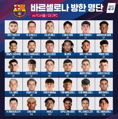 바르셀로나는 이번 아시아 투어에 최정예 멤버를 대동할 것으로 보인다. 폴란드의 특급 스트라이커 로베르트 레반도프스키를 필두로, 17세의 신성 라민 야말, 중원의 핵 페드리 등 세계적인 스타 선수들이 서울월드컵경기장의 잔디를 밟을 예정이다. 이들의 화려한 플레이를 직접 볼 수 있다는 사실만으로도 팬들의 가슴은 이미 뜨겁게 달아올랐다. 15년이라는 긴 기다림 끝에 다시 한국을 찾은 바르셀로나가 어떤 경기력을 선보일지 모두가 주목한다.