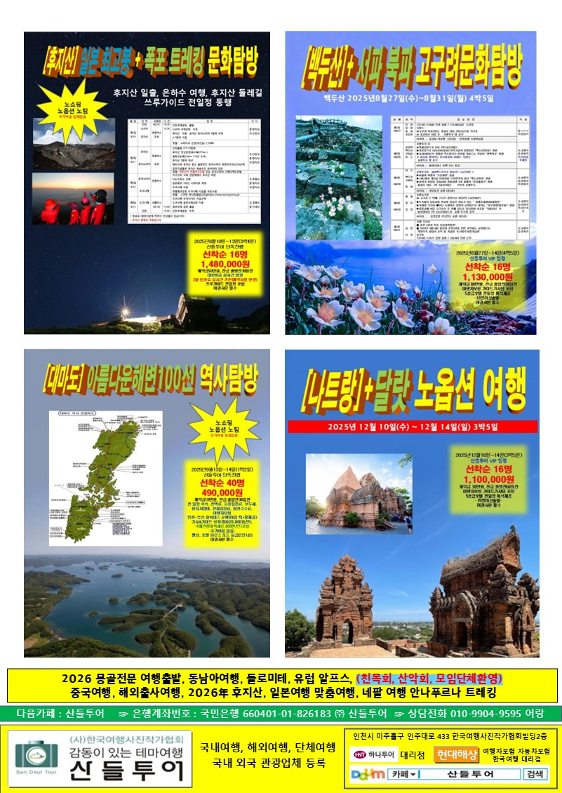 산들투어 2025년 8월 가볼만한곳 인생샷 여행 트레킹 일정표