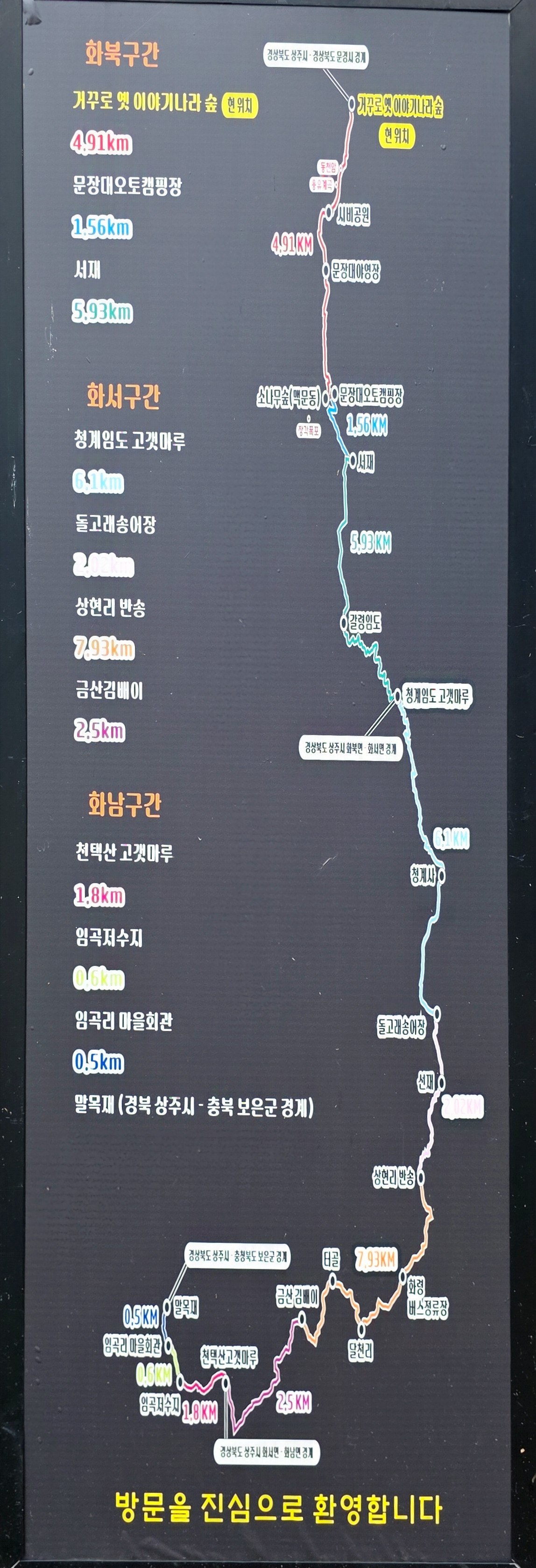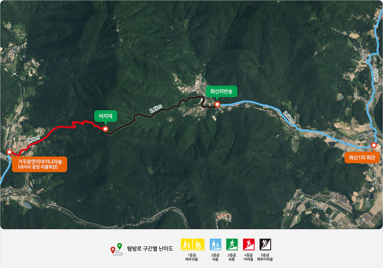 이 구간은 화산1리회관에서 출발해 쌍용구곡을 거쳐 내서리 광정마을회관까지 이어지는 6.3km 코스입니다.