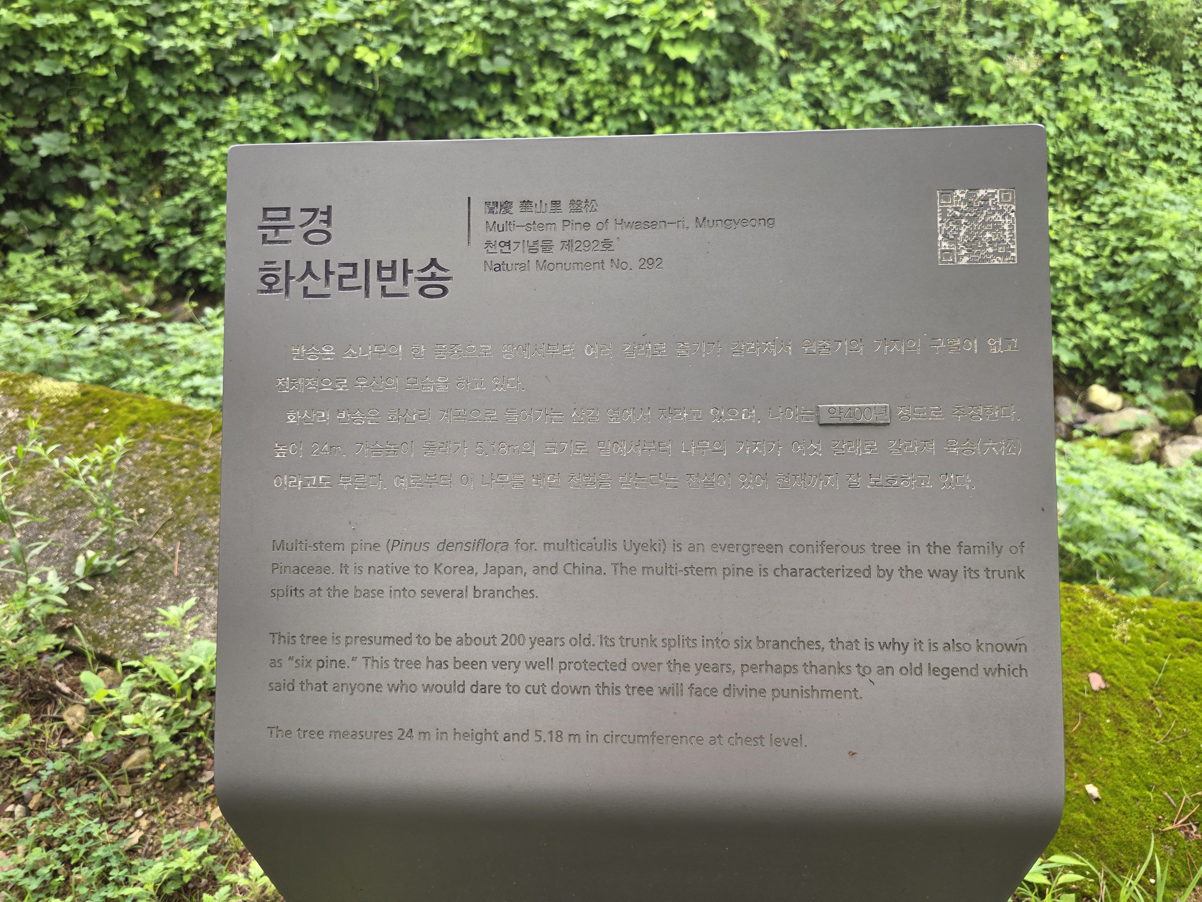 높이 24m, 둘레 5.18m에 이르는 이 소나무는 약 200년 된 것으로 추정되며, 줄기가 여섯 갈래로 갈라져 ‘육송(六松)’이라 불린다.