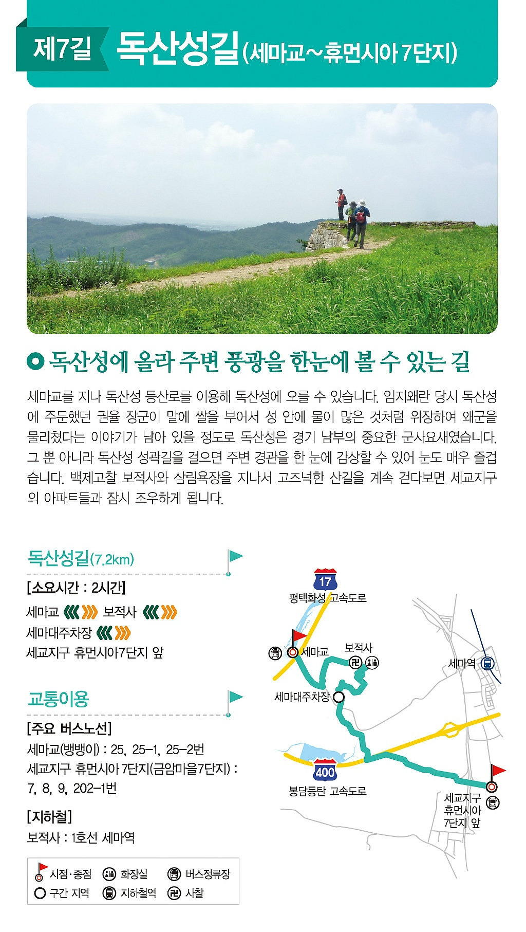 세마교를 출발해 독산성을 거쳐 휴먼시아 7단지까지 이어지는 약 7.2km의 여정은 역사, 자연, 도시 풍경이 절묘하게 어우러진 도보여행 코스다.